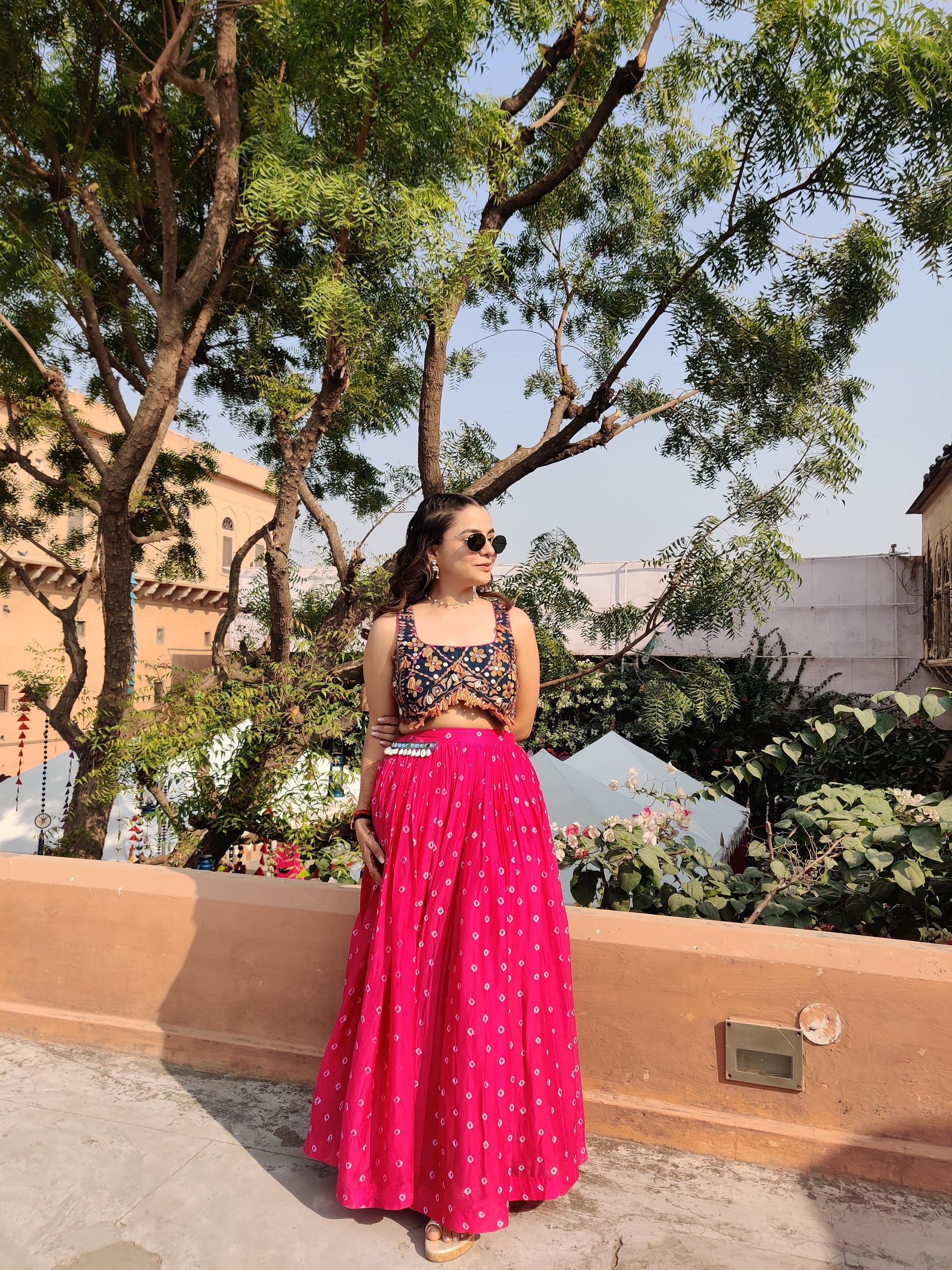Paired with it is a vibrant fuchsia Bandhani skirt, crafted in luxurious silk. Featuring tie-dye patterns, mirror embellishments, and shell detailing along the waistband, this pre-stitched lehenga offers both grace and movement. The wide hem creates a dramatic flair, perfect for every twirl and celebration.