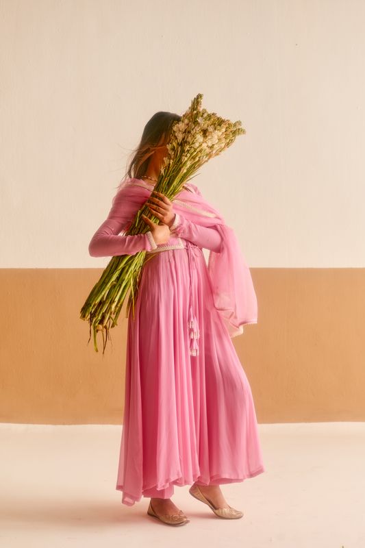 Artisanal Lace & Shimmer: The Koti is the crown jewel of this set, adorned with delicate Sequins detailing and intricate Chikankari lace work. The same ethereal Chikankari lace edges the dupatta, adding a soft, heritage touch to the high-energy pink palette.
