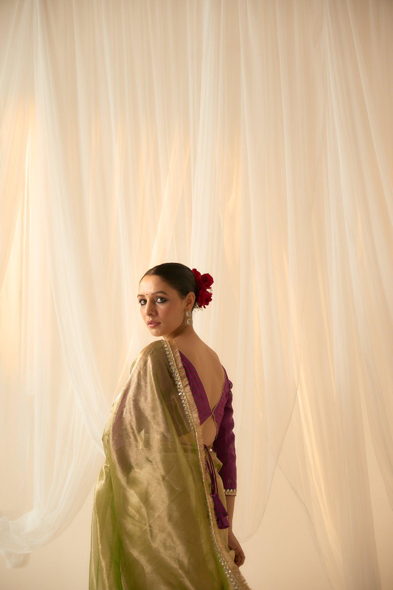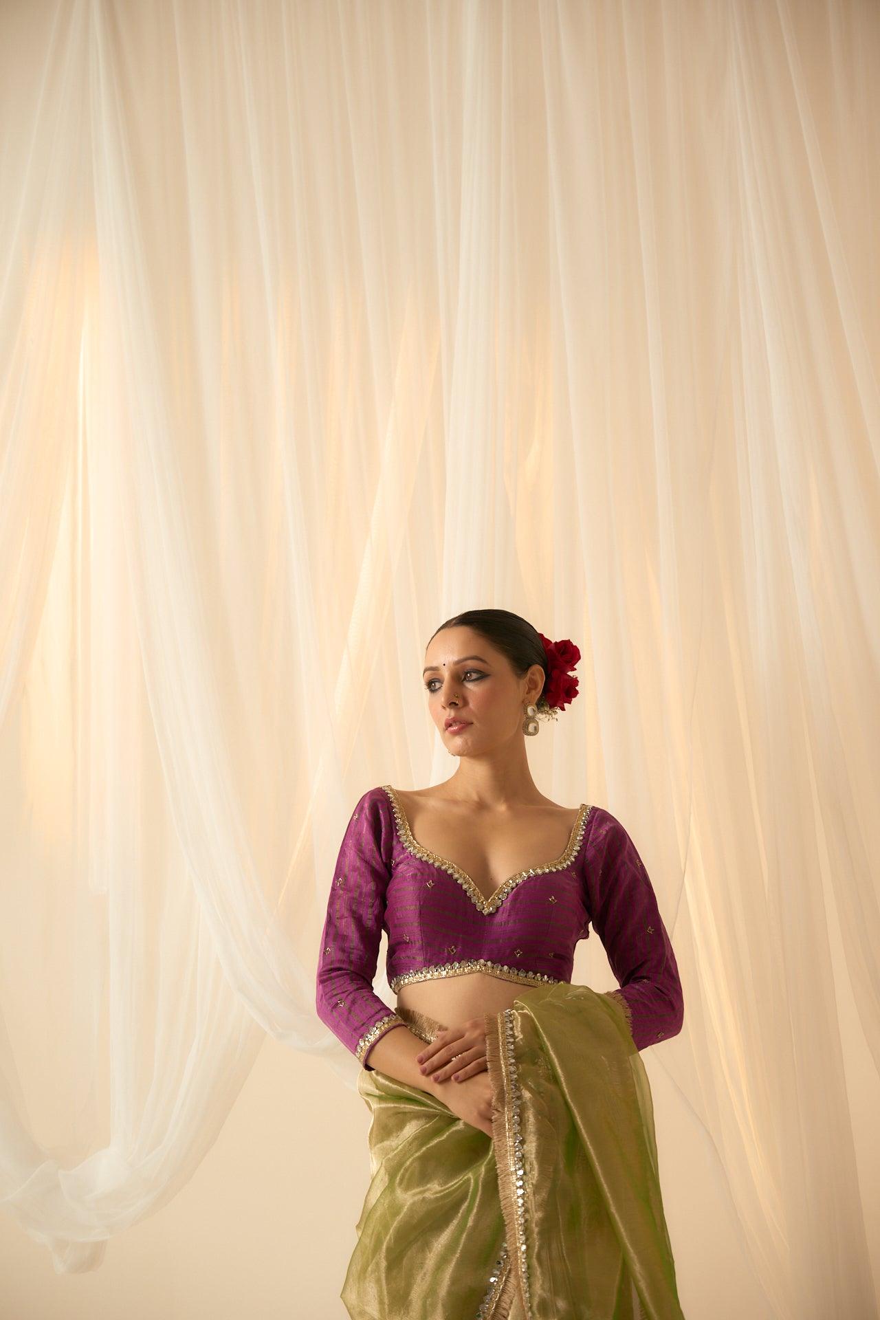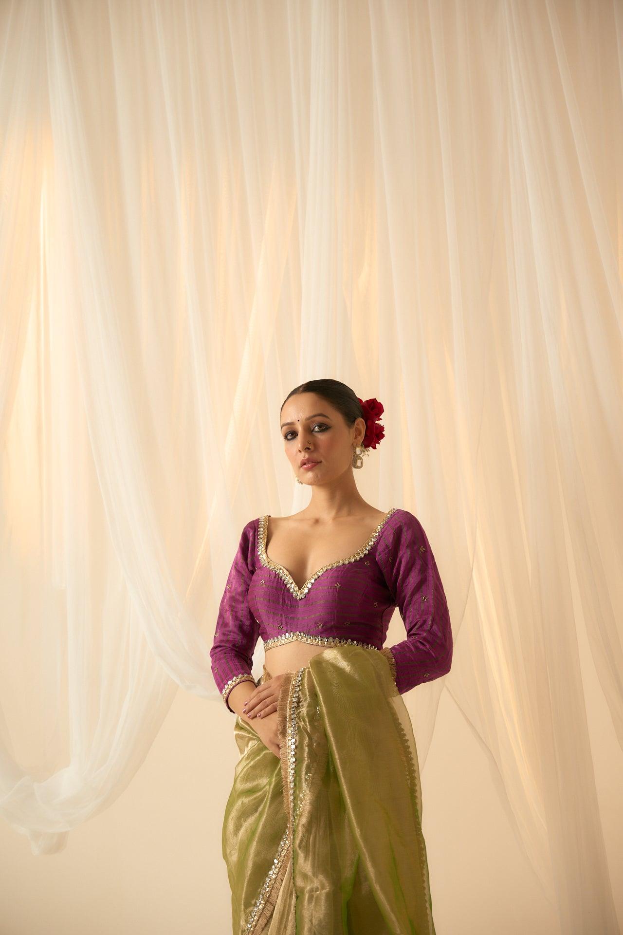 Let’s talk about the fabric, it is a silk tissue zari weaved in the purest form for you, with a striped weave fabric silk blouse. Hand embroidered dabka details to make it yours even more.