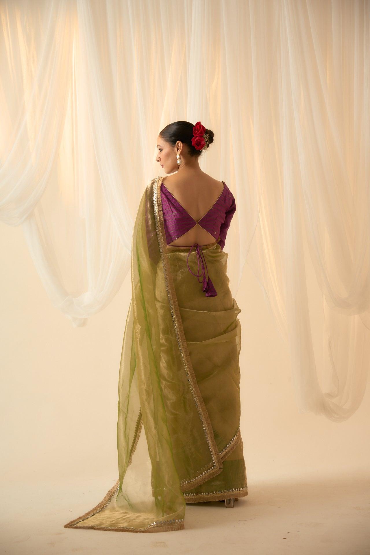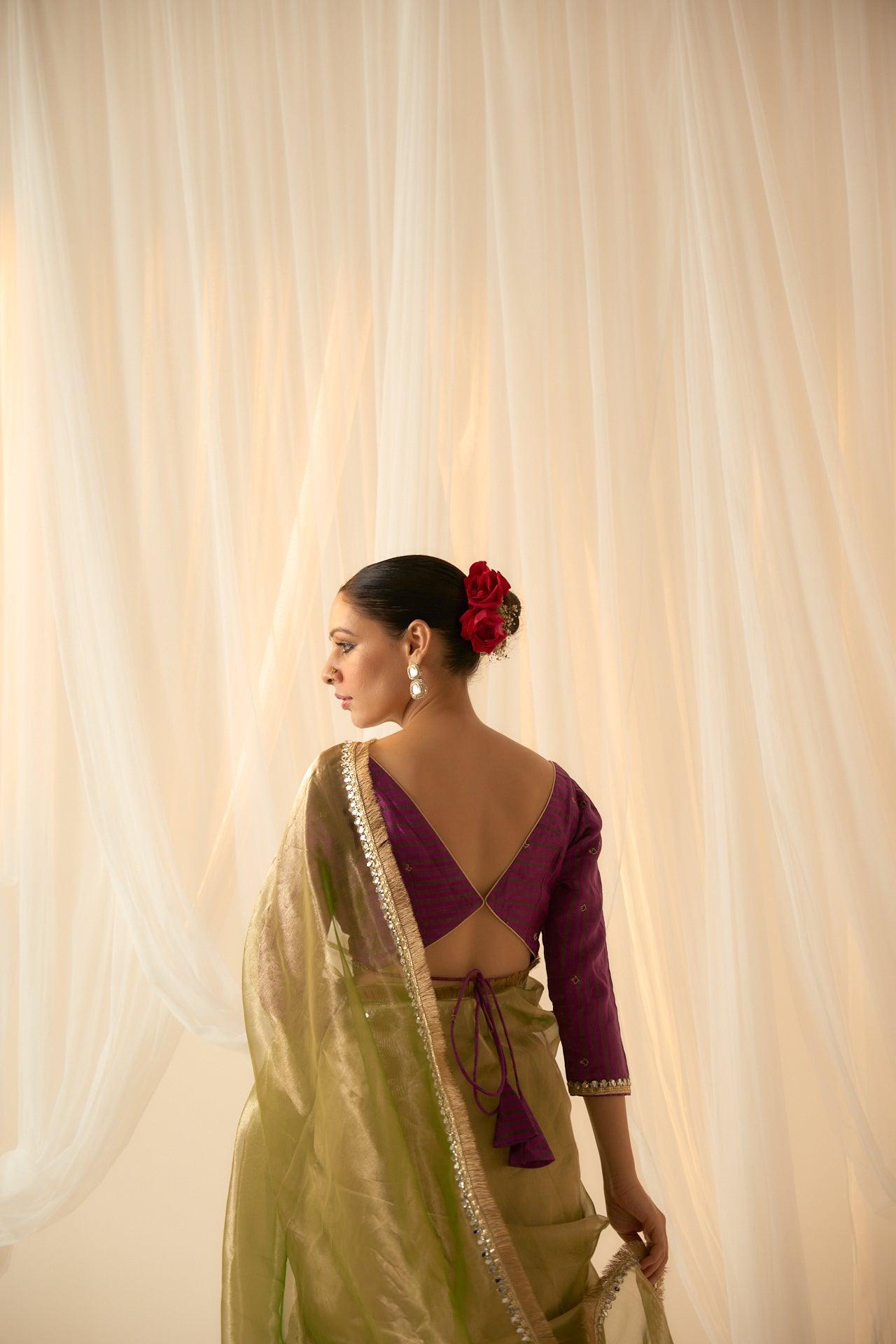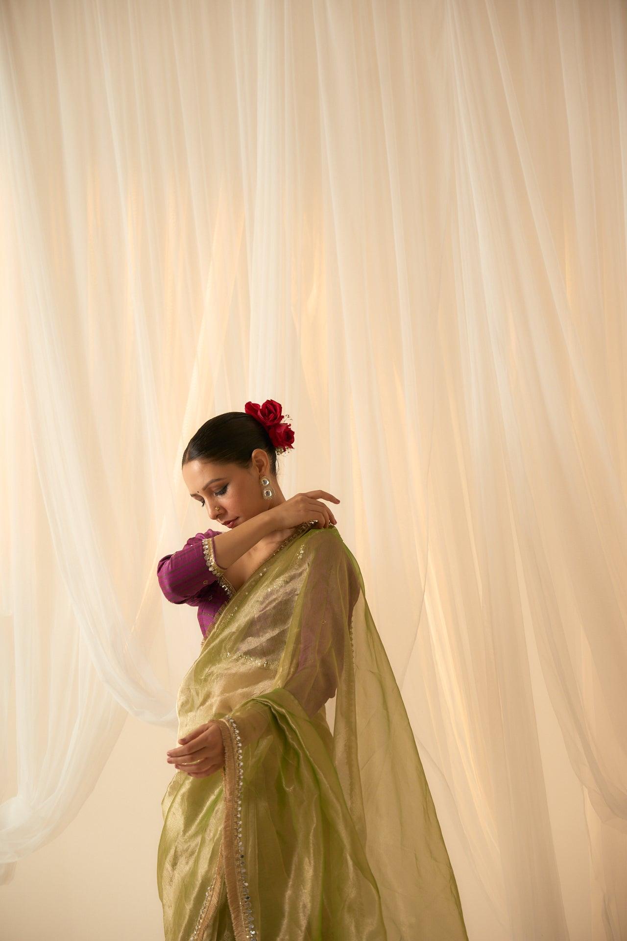 Let’s talk about the fabric, it is a silk tissue zari weaved in the purest form for you, with a striped weave fabric silk blouse. Hand embroidered dabka details to make it yours even more.