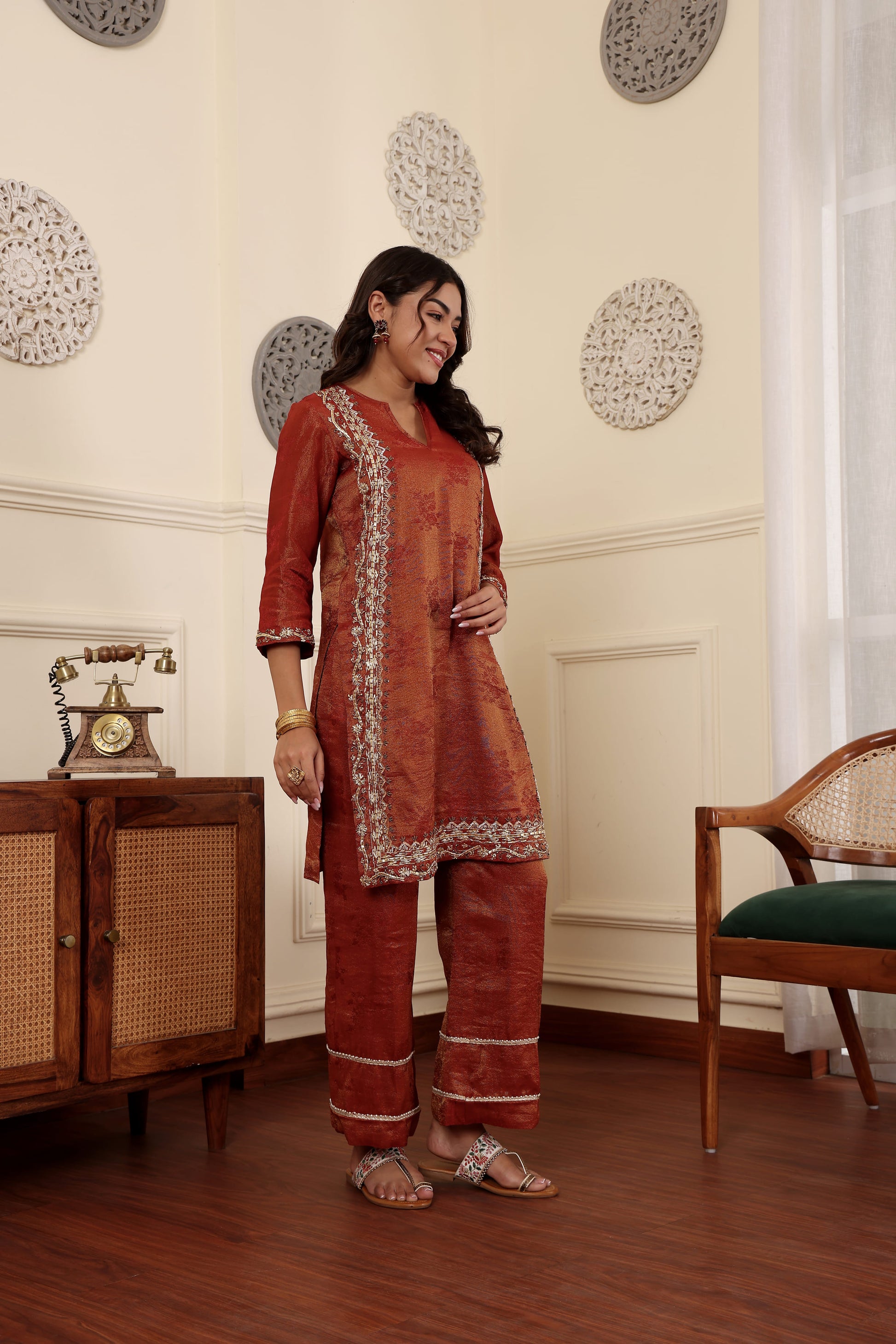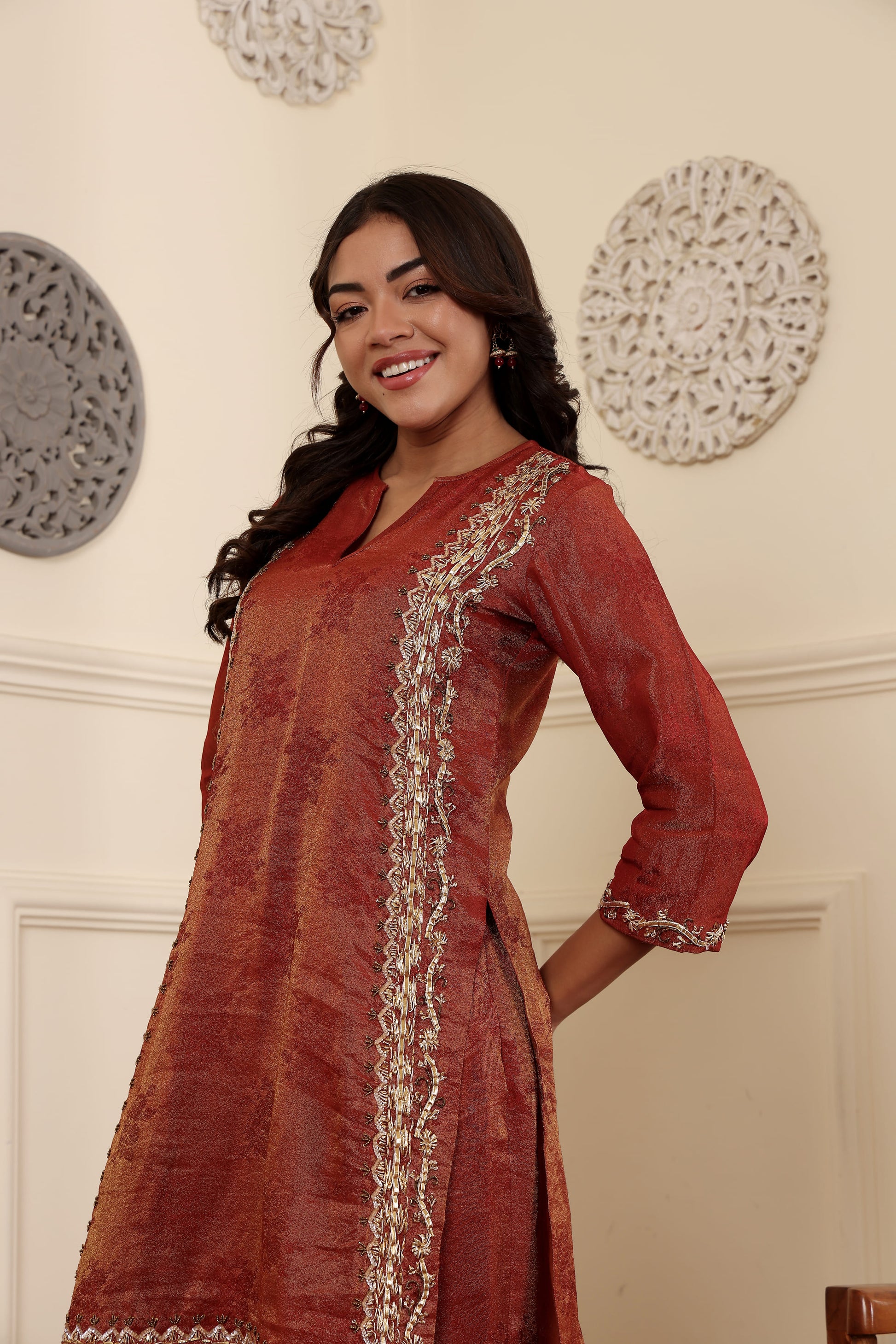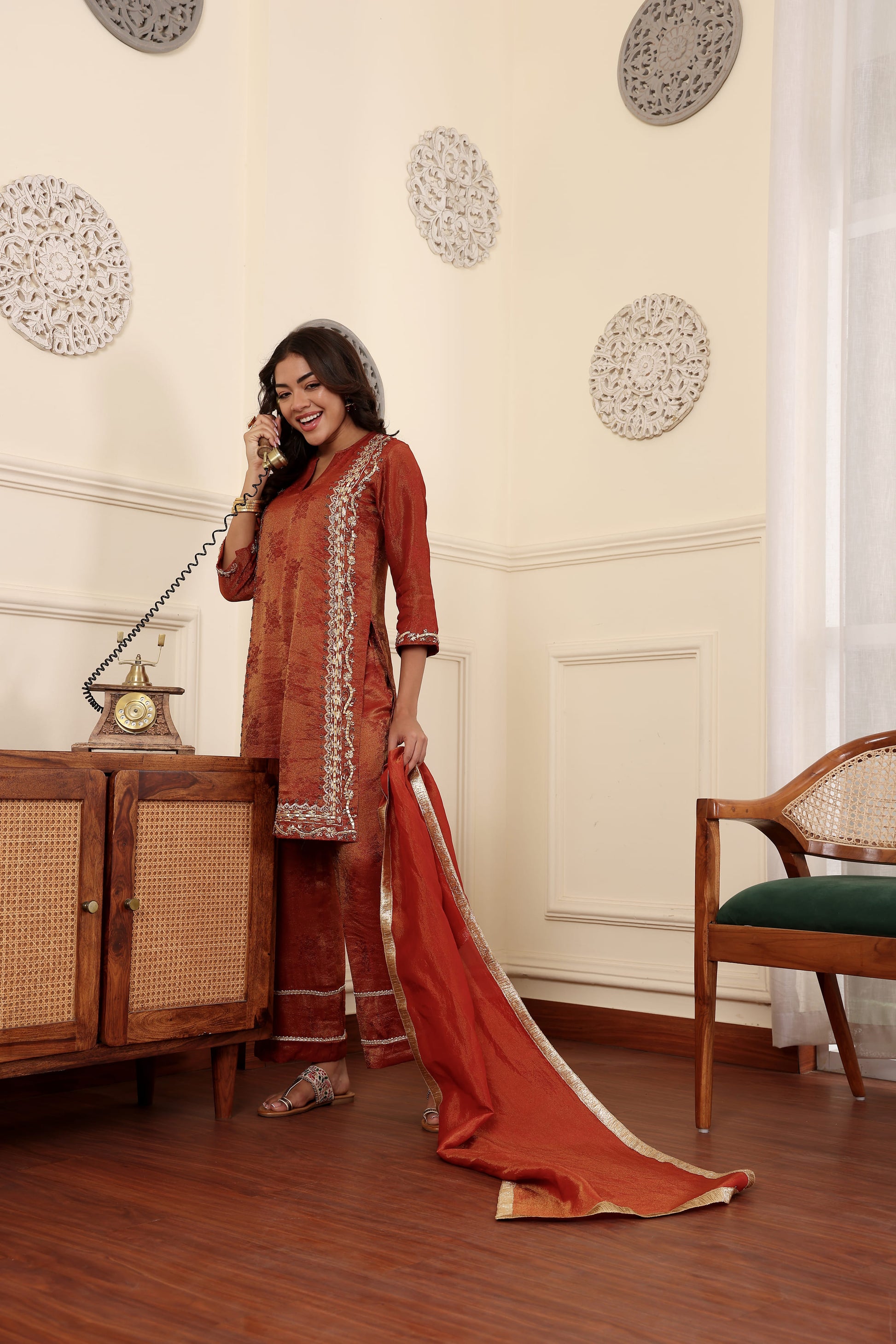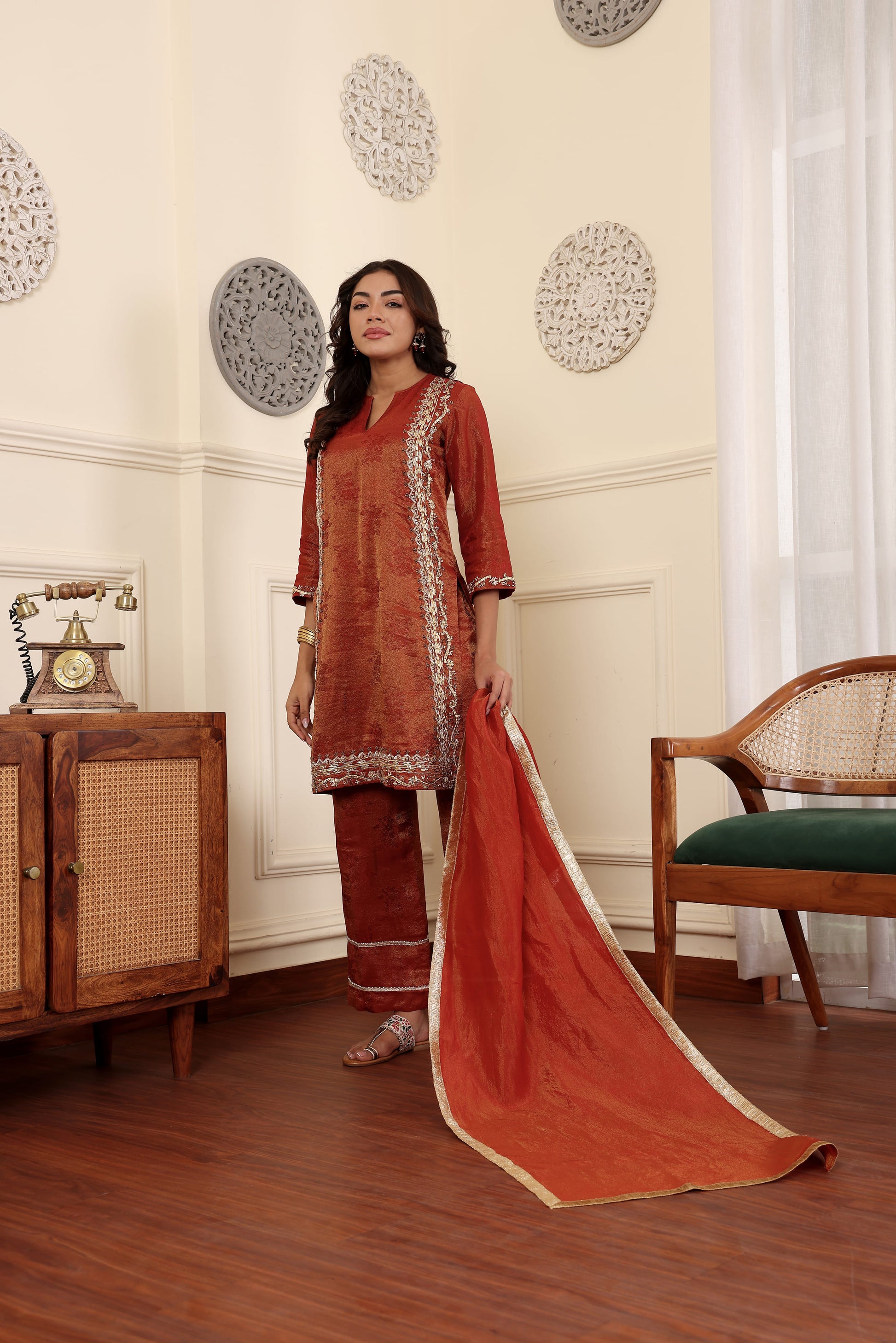 Embossed Silk Tissue Kurta Set with Gota Patti Embroidery