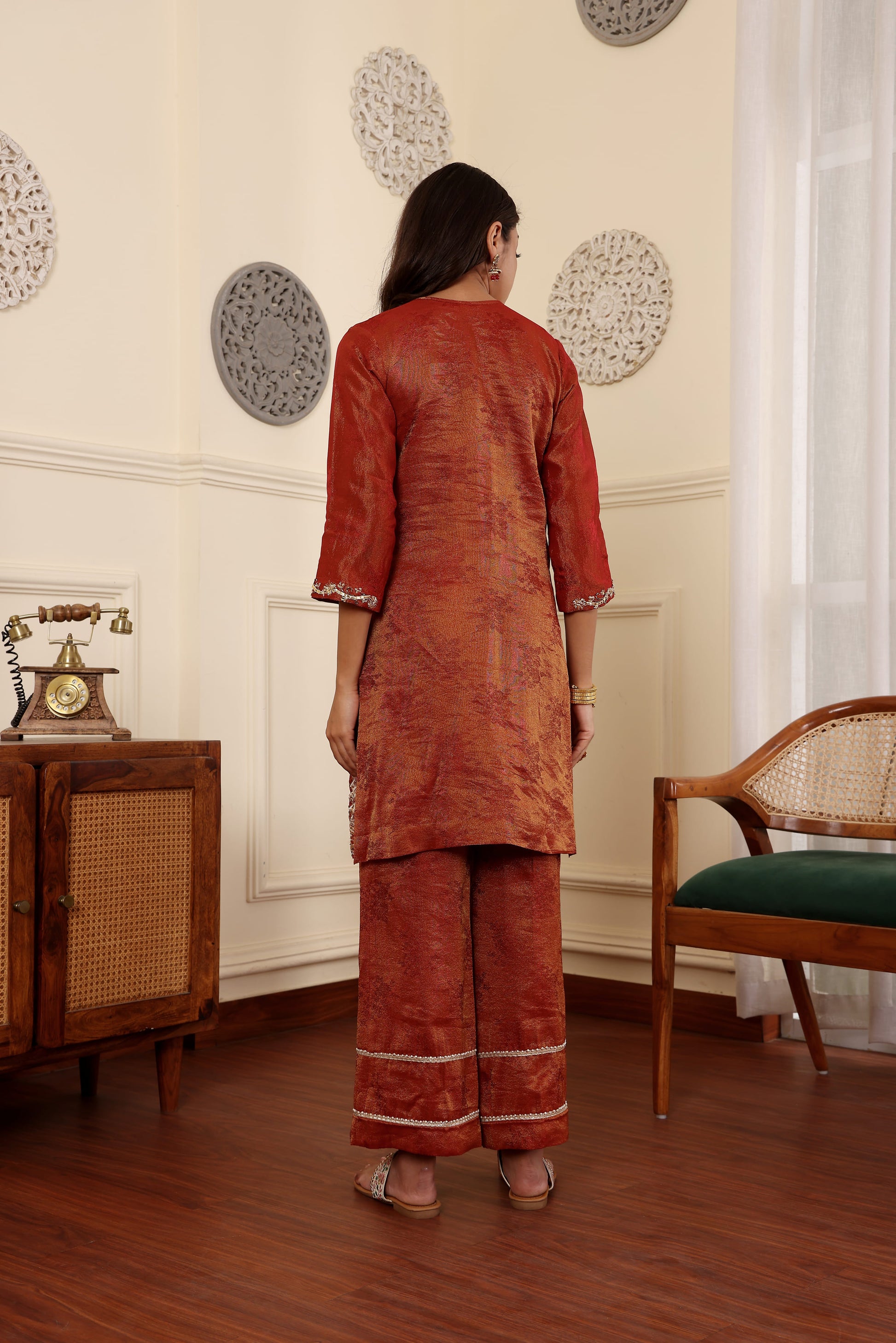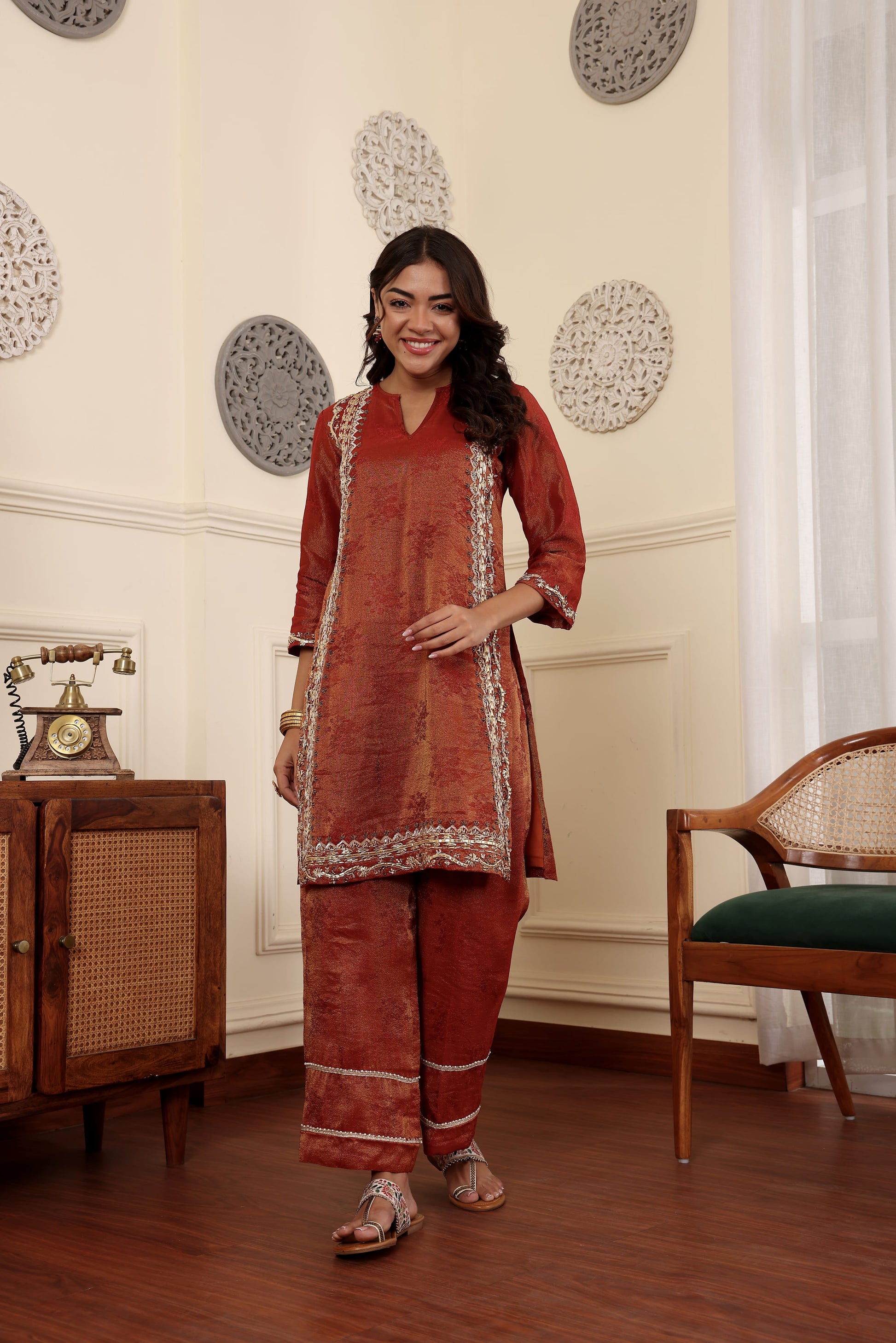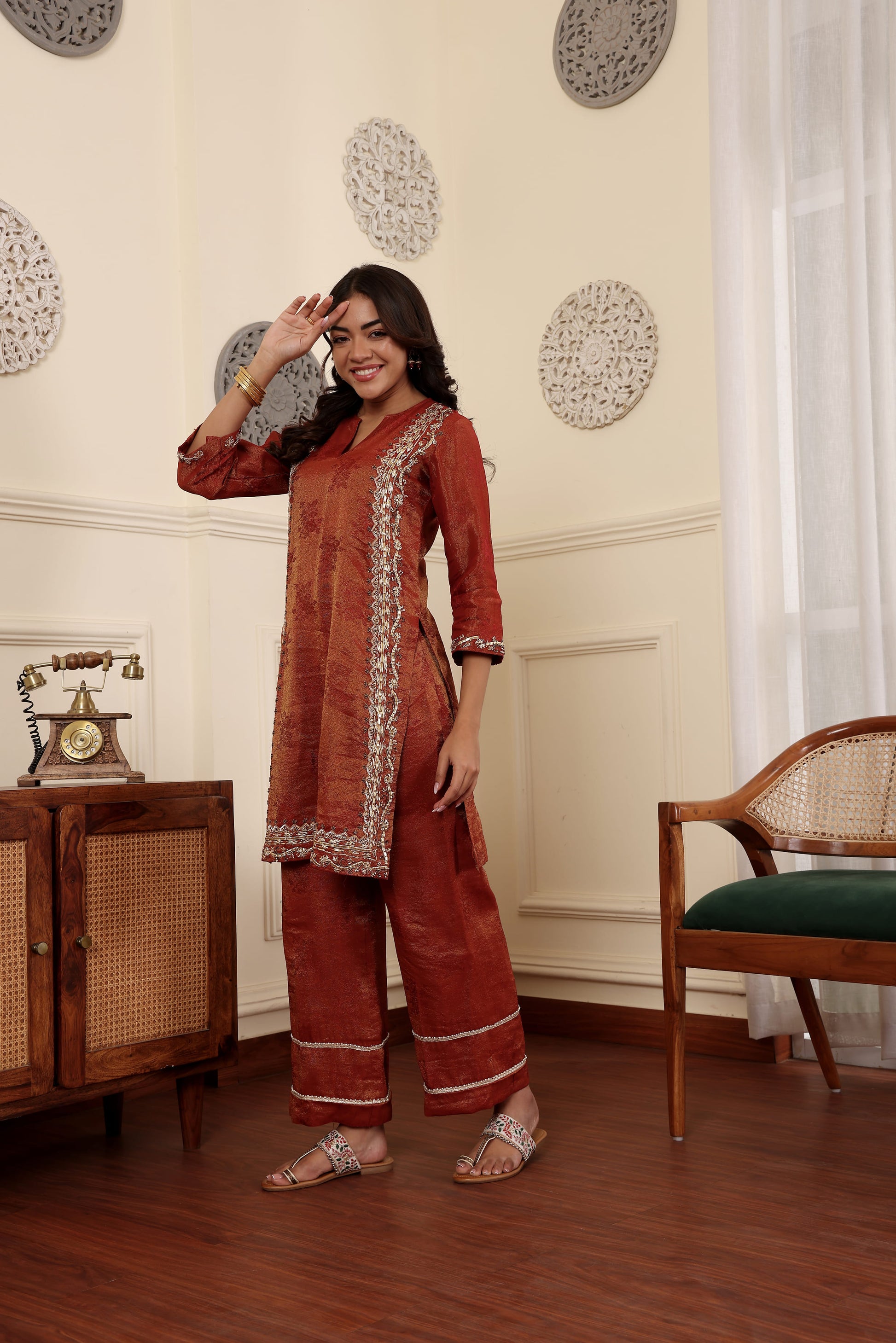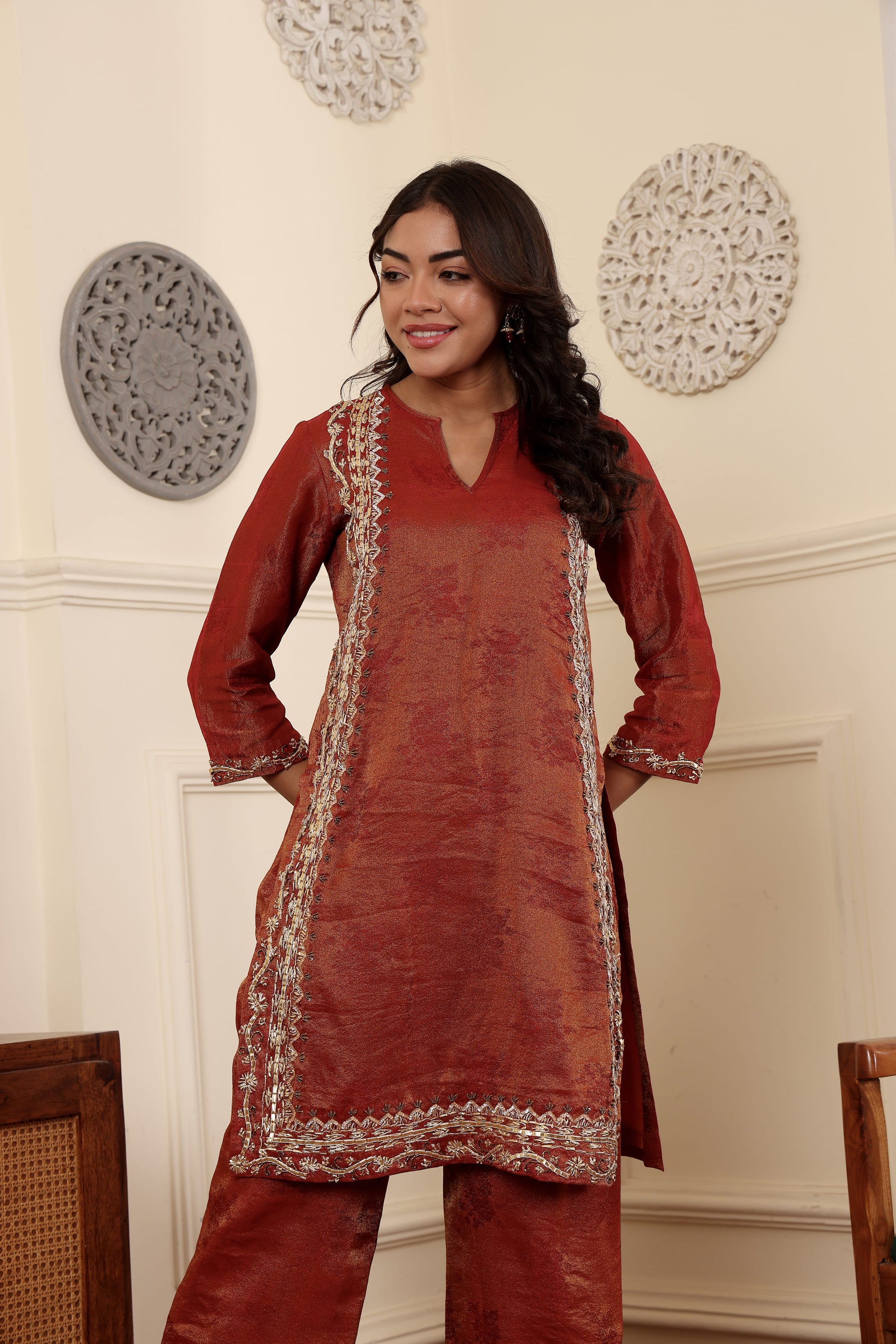 Embossed Silk Tissue Kurta Set with Gota Patti Embroidery