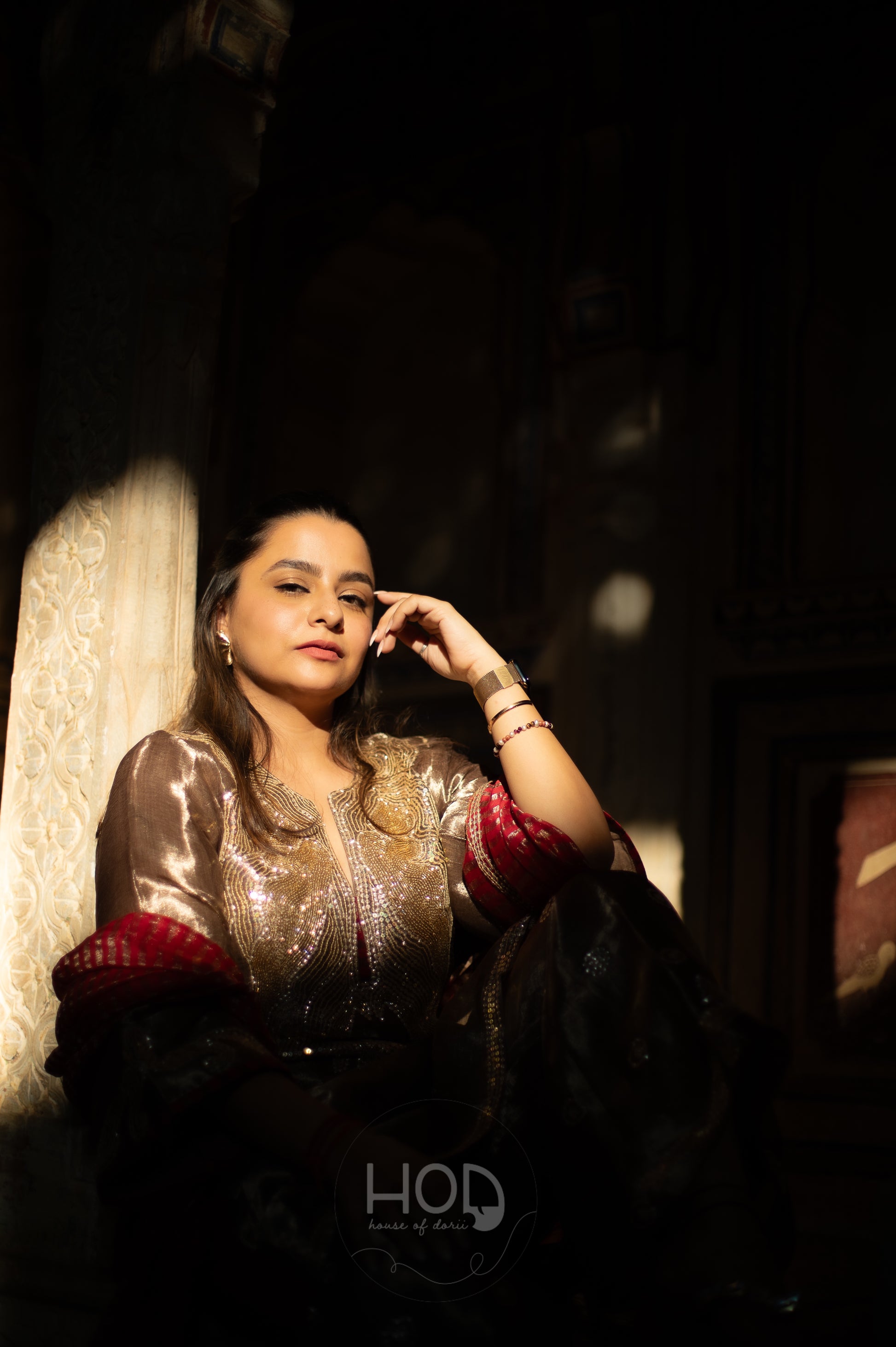 The kurta, adorned with intricate sequins and hand-embroidered zari work, radiates regal charm, reflecting the grandeur of handcrafted luxury. Its delicate shimmer catches the light with every movement, ensuring you stand out with grace.
