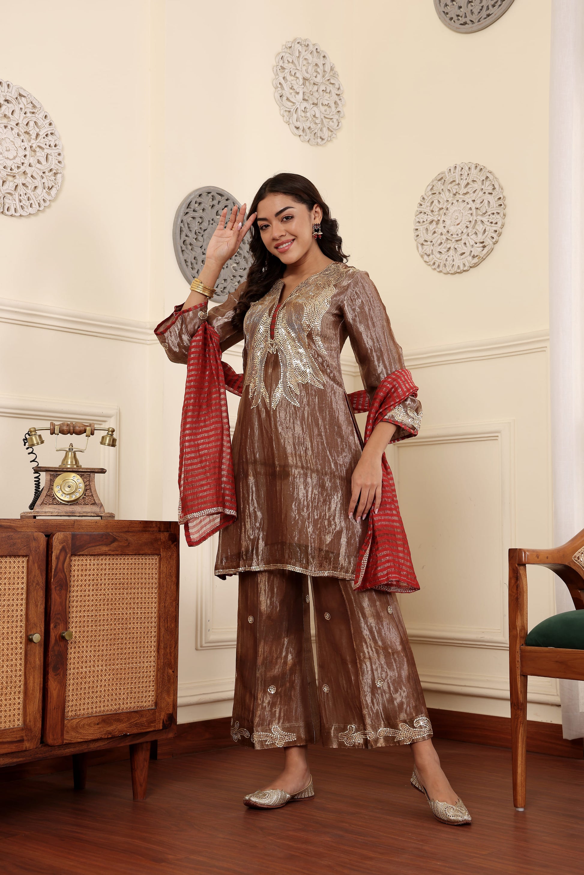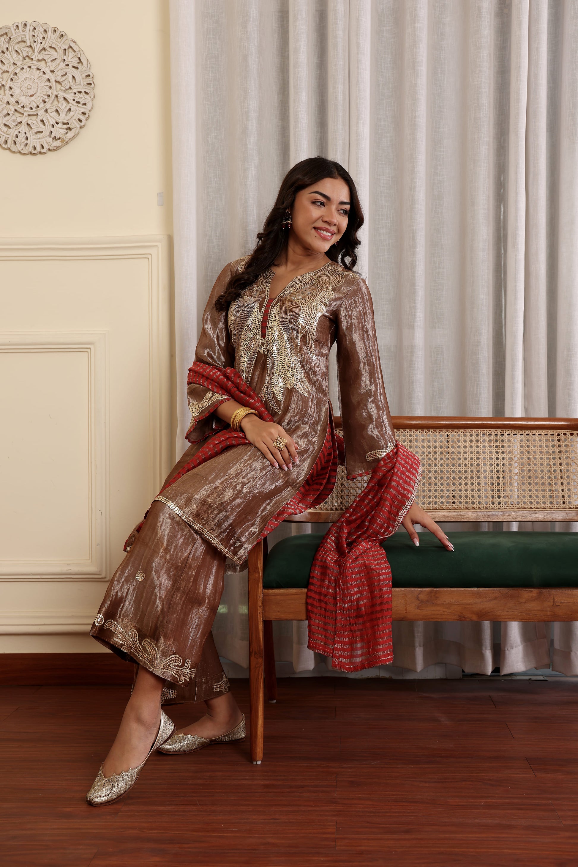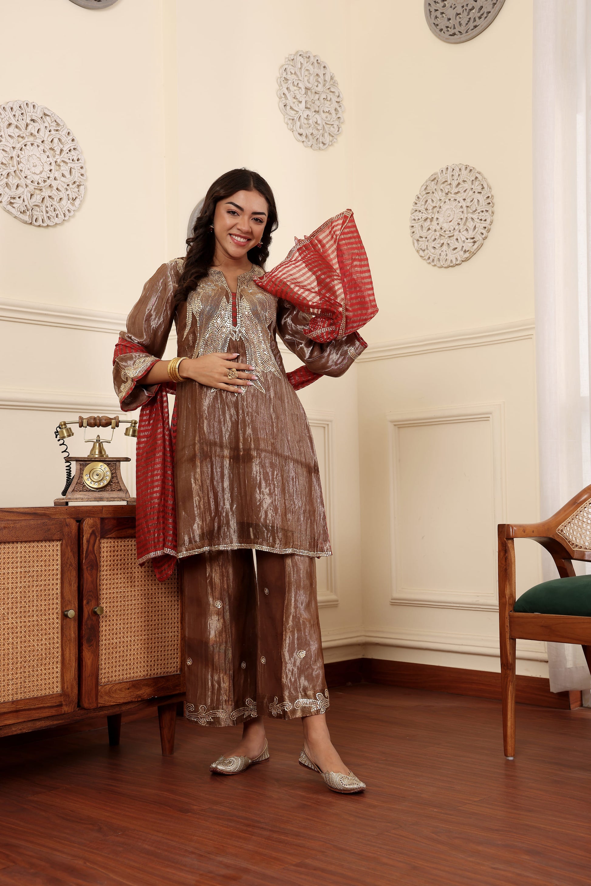 Indulge in the opulence of Mocha Luxe, where artistry meets heritage in an ethereal ensemble crafted from pure silk tissue. This designer set is a perfect blend of tradition and modern elegance, making it a must-have for festive celebrations and grand occasions.