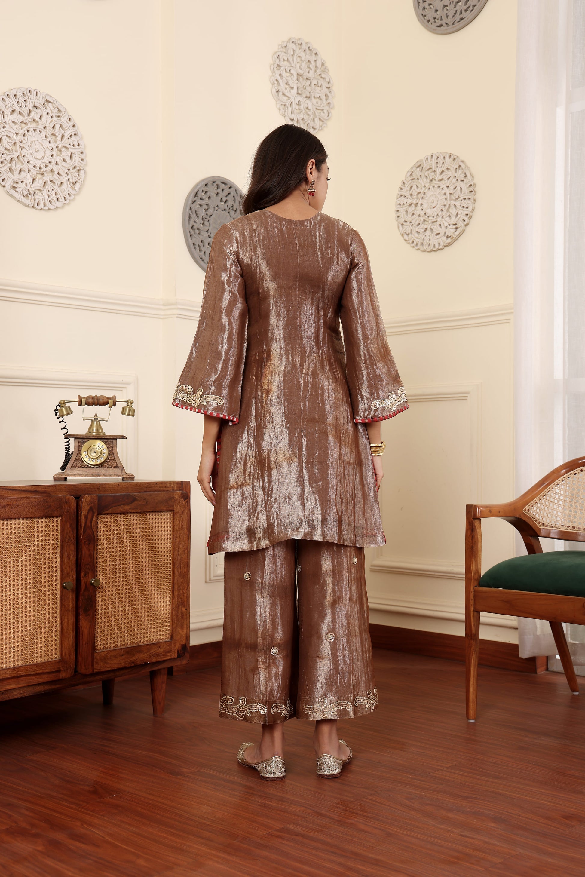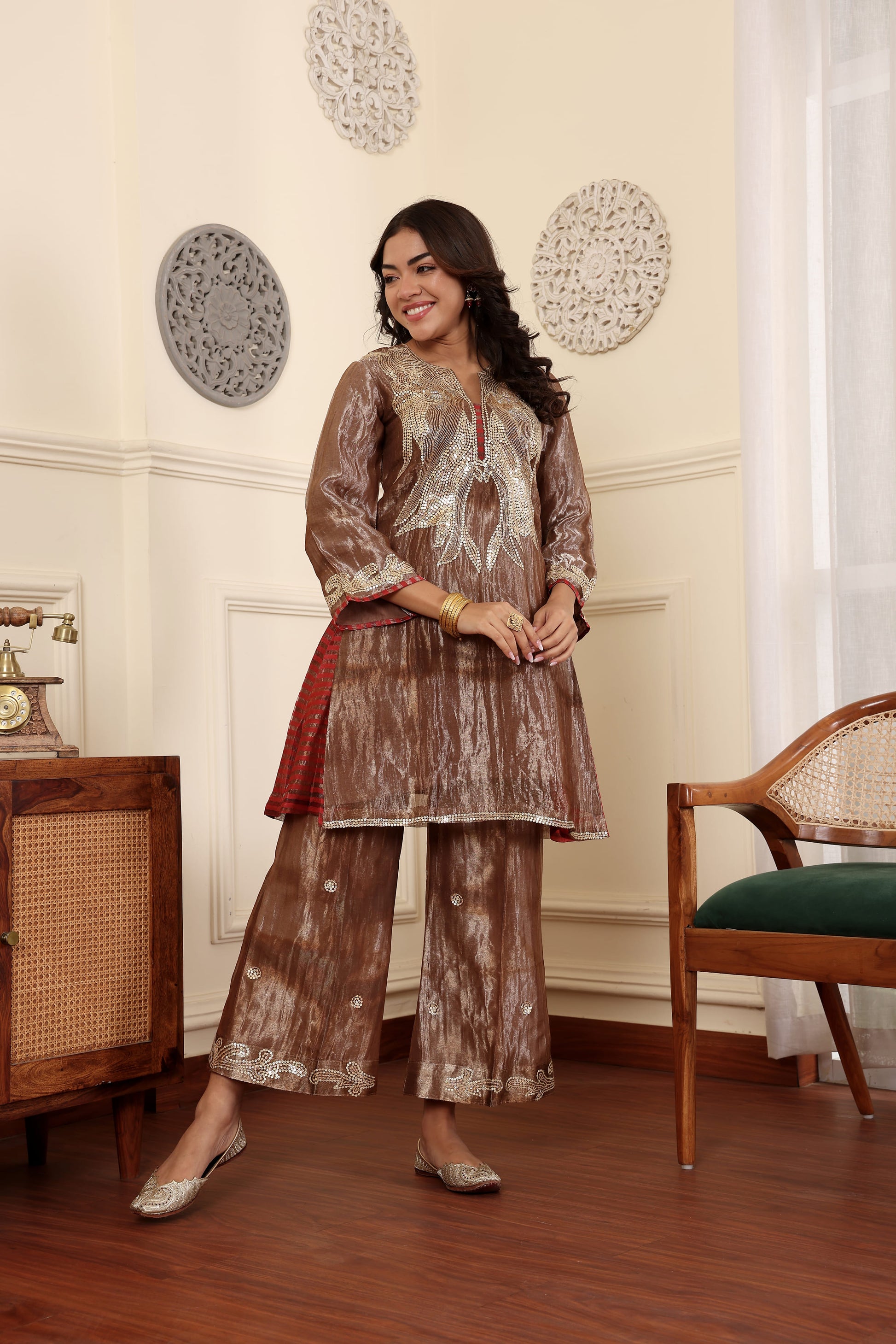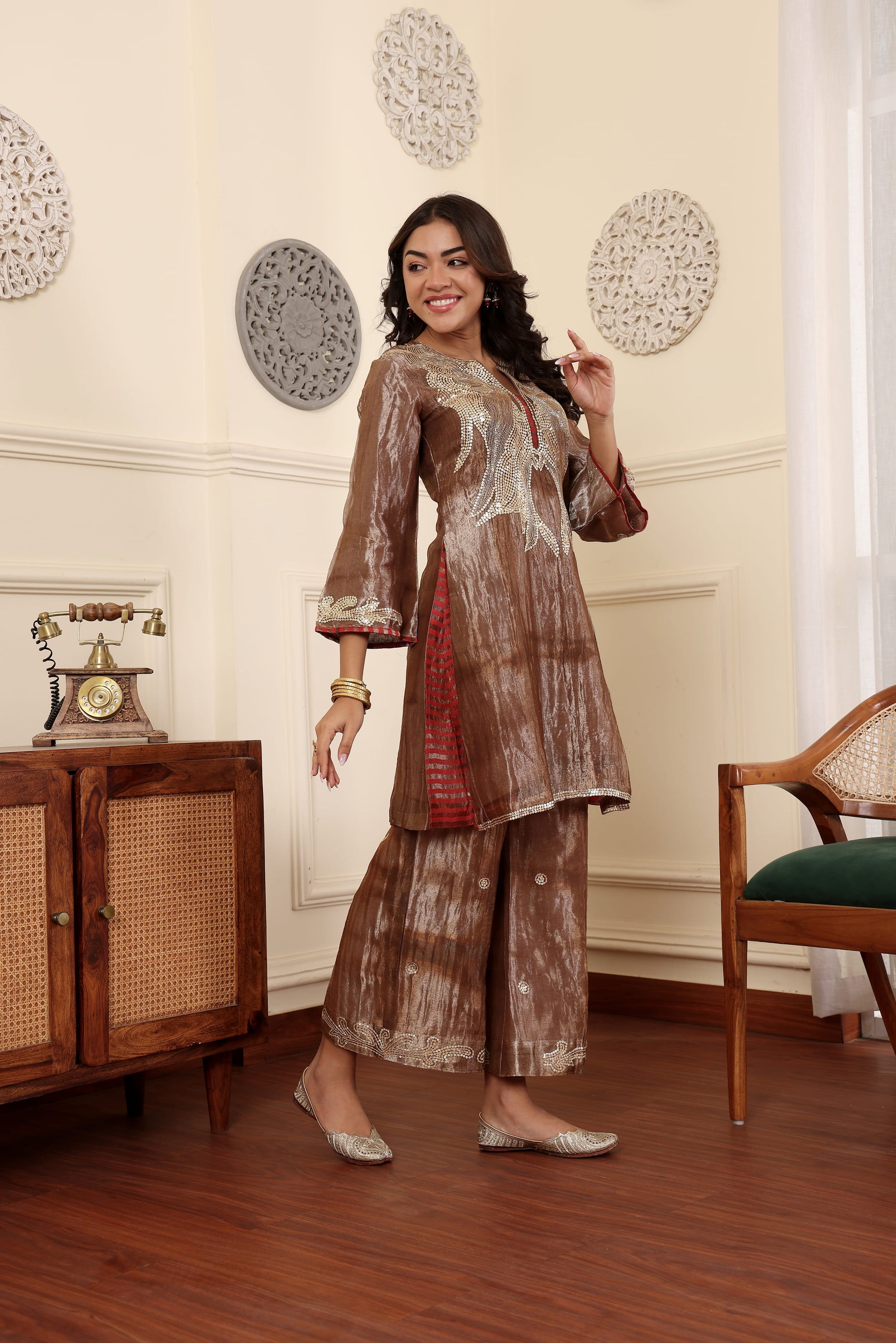 Indulge in the opulence of Mocha Luxe, where artistry meets heritage in an ethereal ensemble crafted from pure silk tissue. This designer set is a perfect blend of tradition and modern elegance, making it a must-have for festive celebrations and grand occasions.