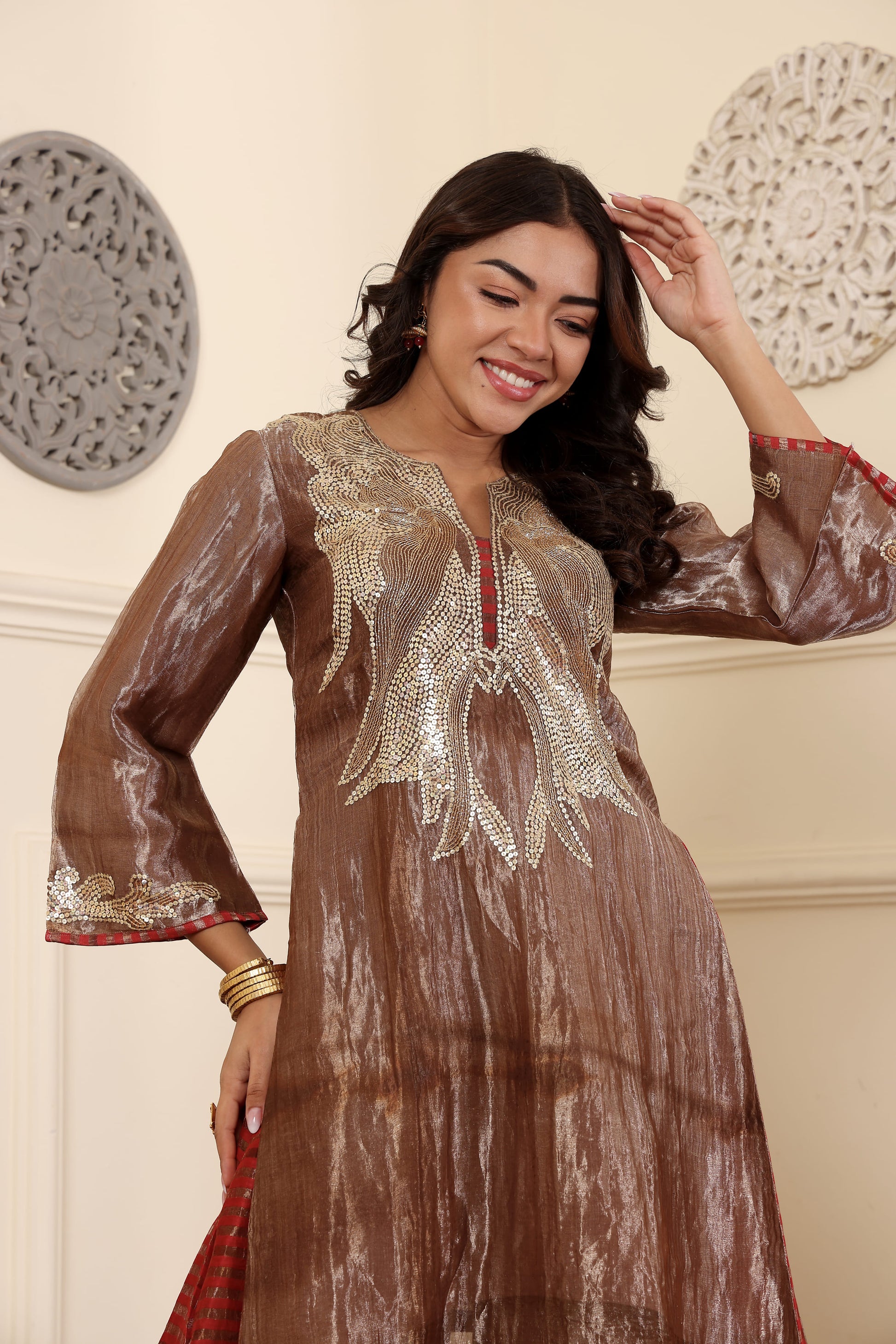 Complementing the kurta, the silk tissue pants mirror the finesse of the ensemble with exquisite zari detailing and sequins embroidery, adding depth to the design. The silk tissue dupatta, woven with subtle stripes and hand-embroidered sequins along the borders, drapes effortlessly, enhancing the regal allure of this outfit.