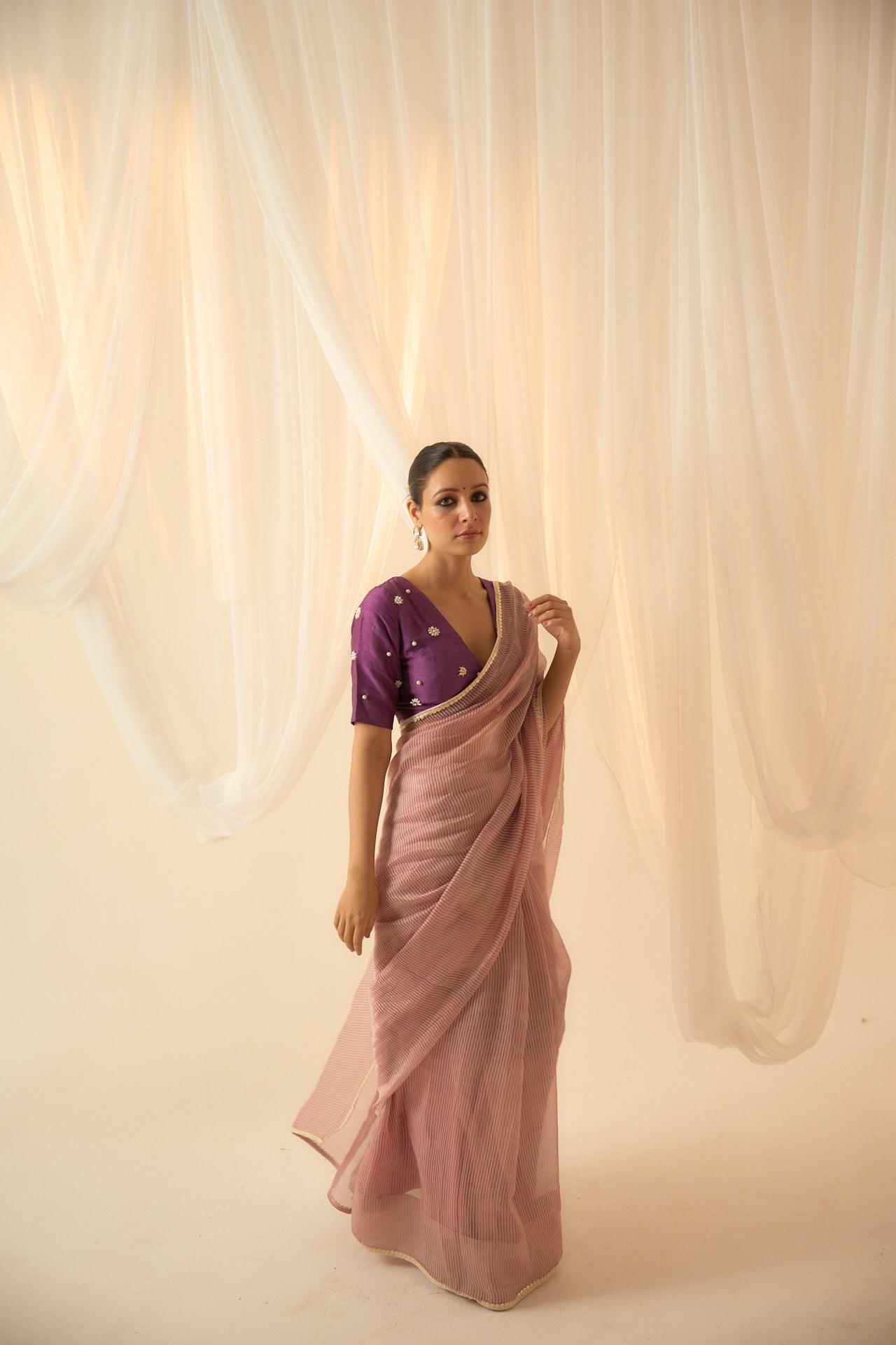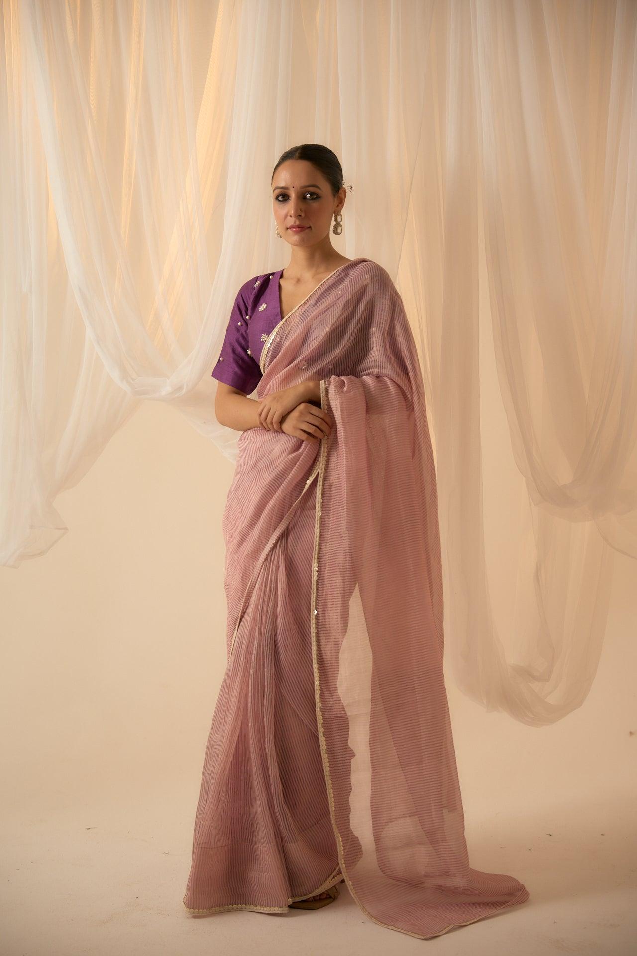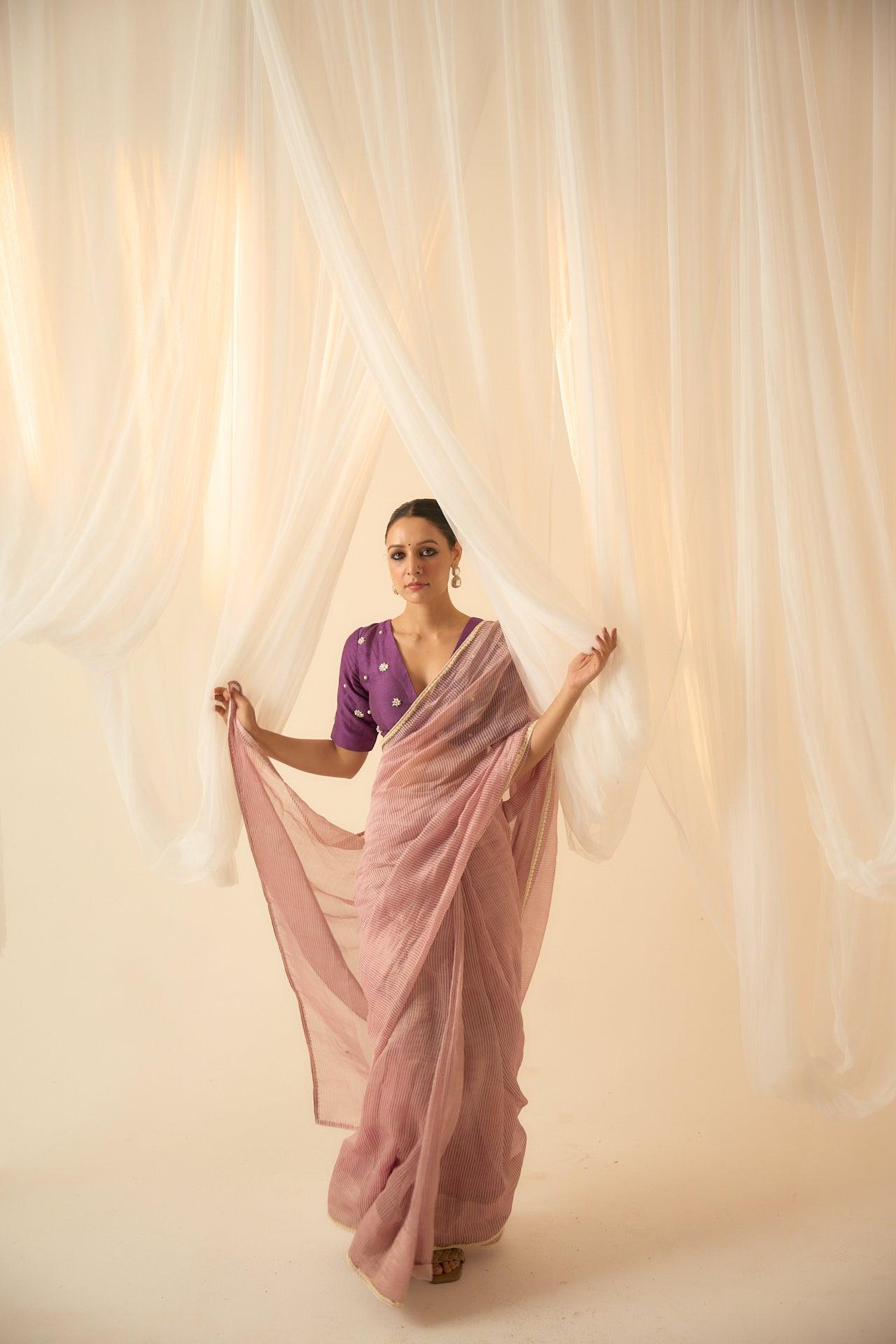 When we talk of chic style and effervescent design, we think of a subtle saree with weaved striped silver thread details and a beautiful sequins and white thread facing in the saree, dusky pink is the colour of gods, which makes you look your glowy best: