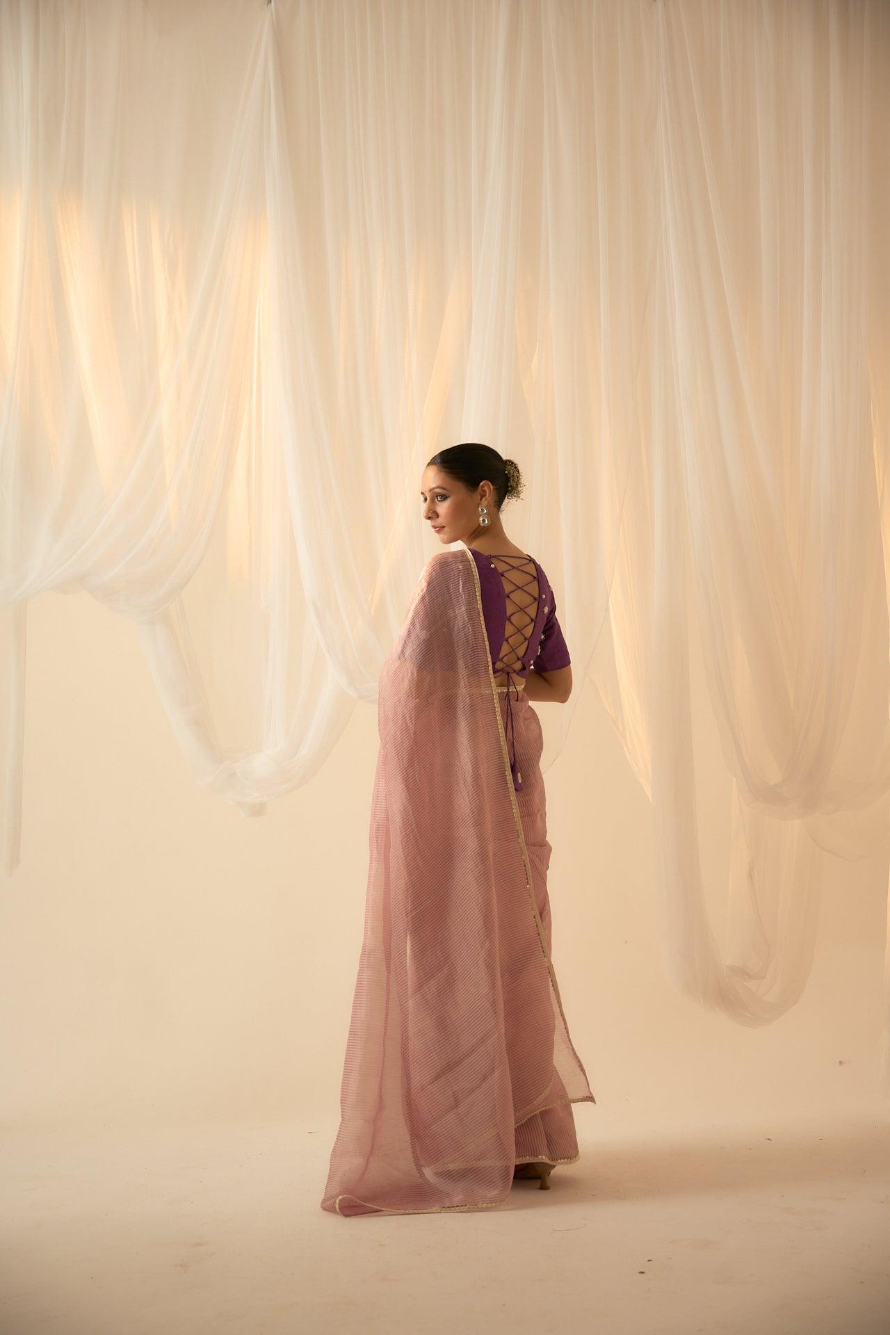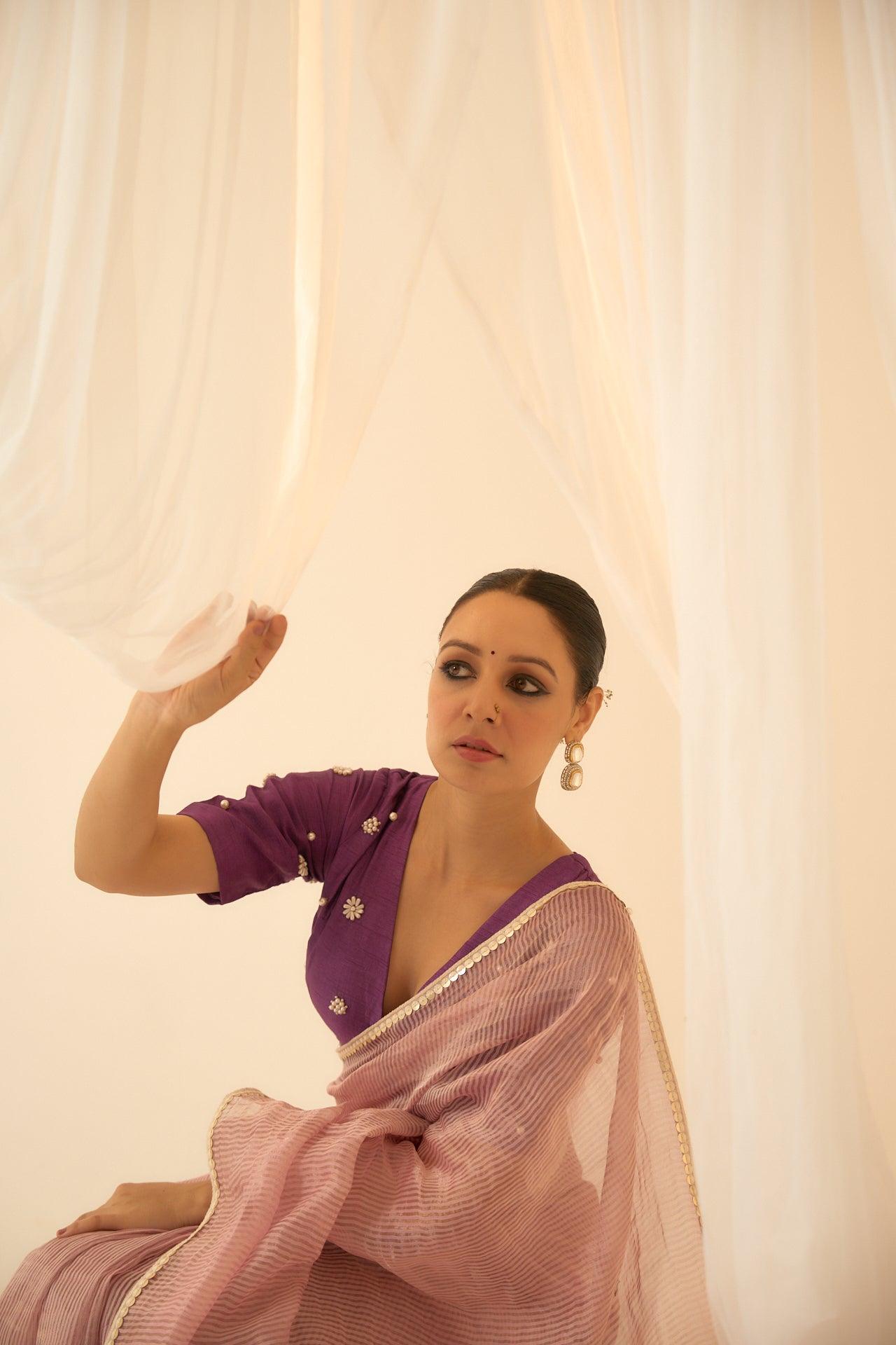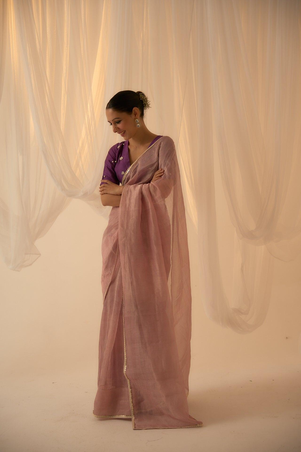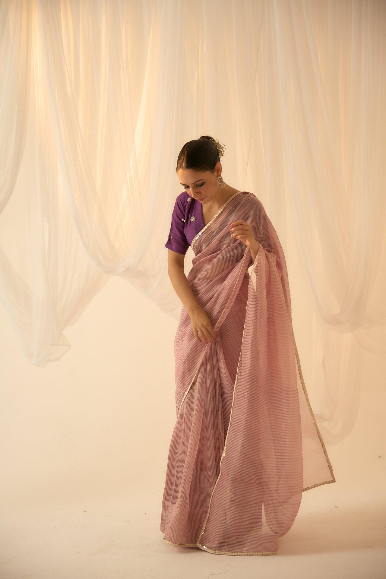 When we talk of chic style and effervescent design, we think of a subtle saree with weaved striped silver thread details and a beautiful sequins and white thread facing in the saree, dusky pink is the colour of gods, which makes you look your glowy best: