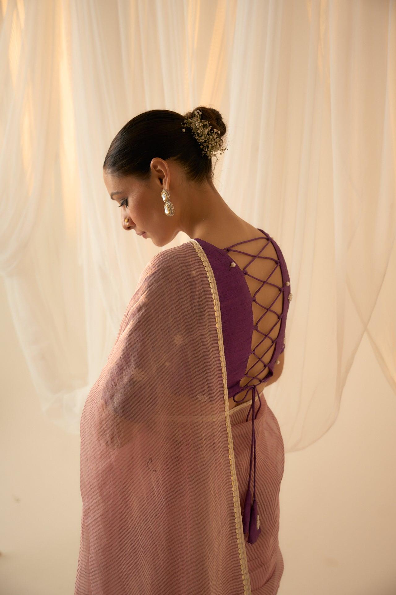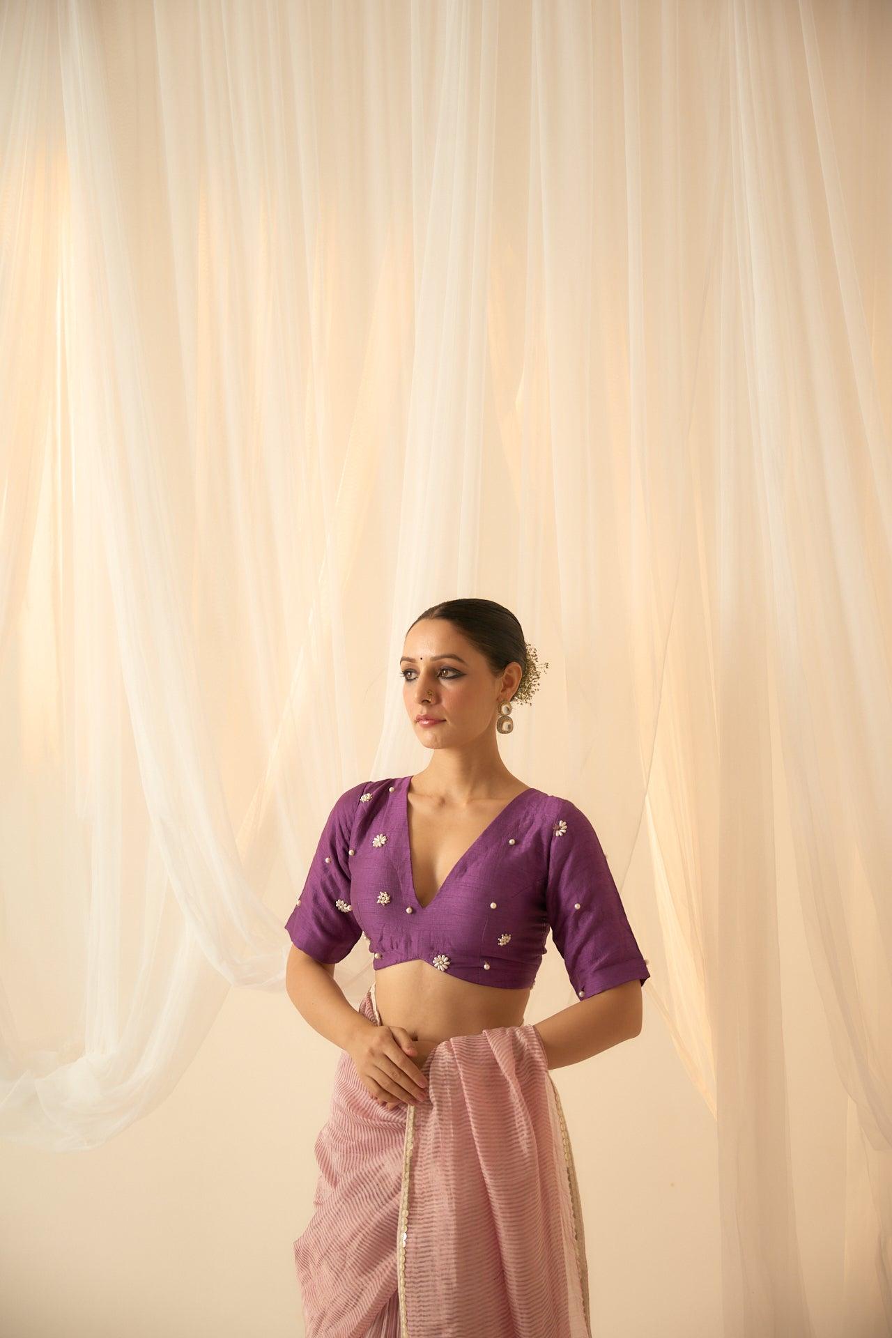 We made sure to give a raw silk contrasted blouse with hand pearl floral details and a back criss cross Dorii pattern, you can style it as a top if you’d like. The unique shade of mauve call in for love and warmth this season.