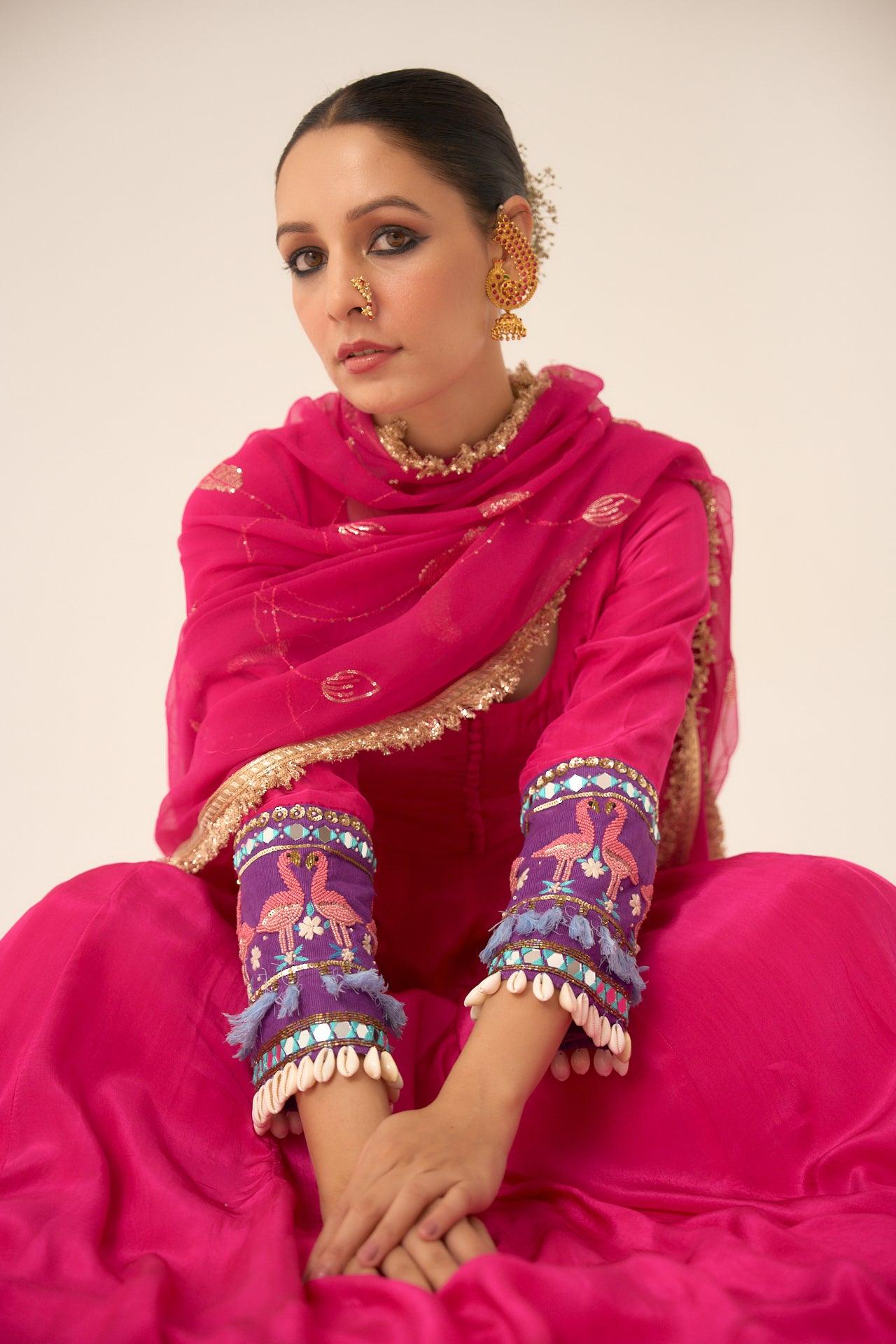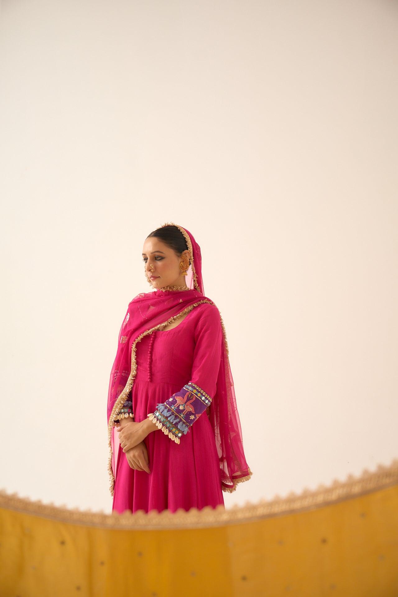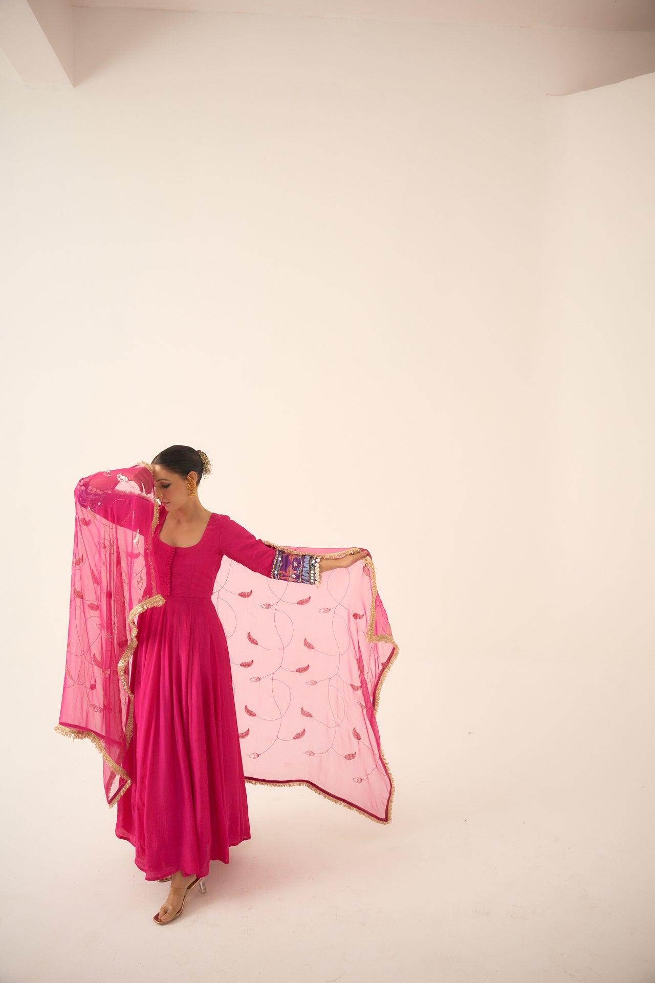 Dupatta talk of sequins hand work with soft fringed lace details. We loved the Fuscia bright coloured crepe fabric, hand dyed in house for you.