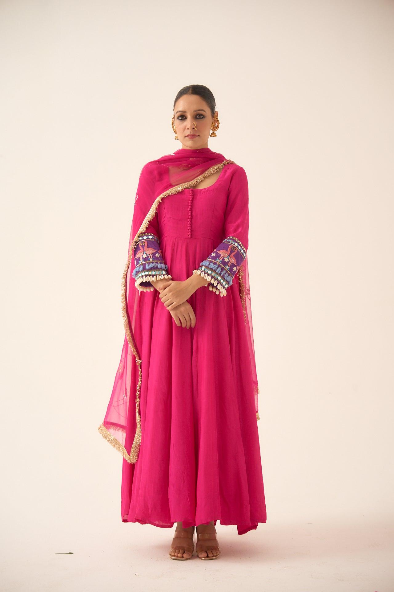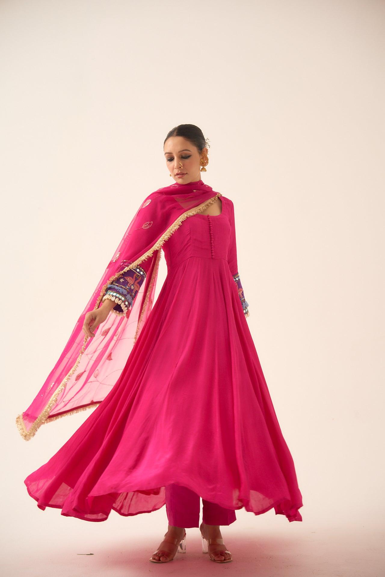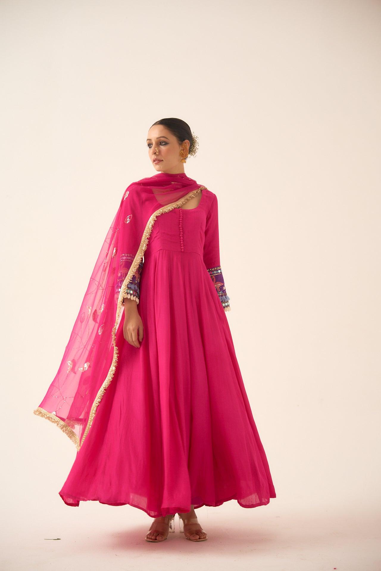 Dupatta talk of sequins hand work with soft fringed lace details. We loved the Fuscia bright coloured crepe fabric, hand dyed in house for you.