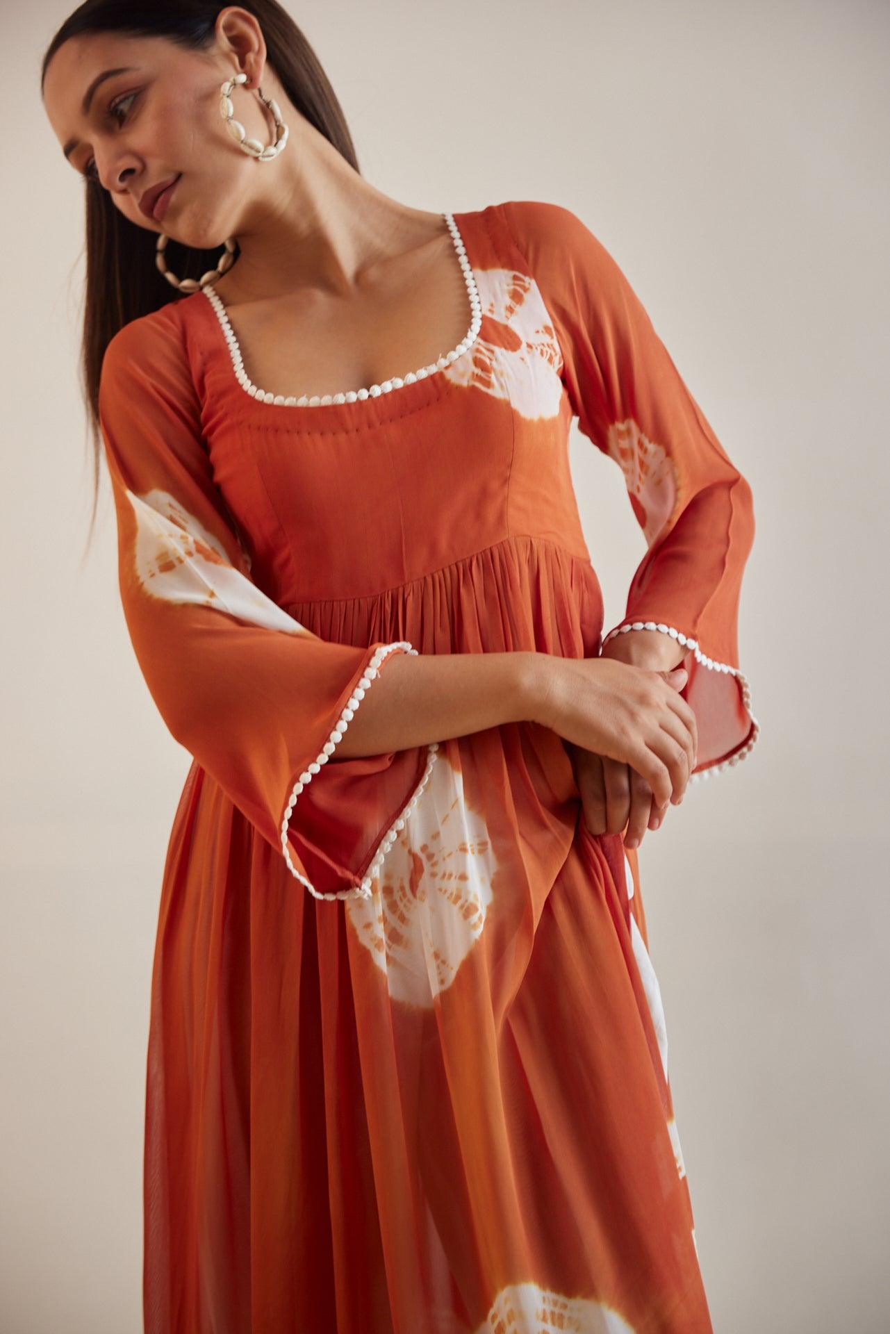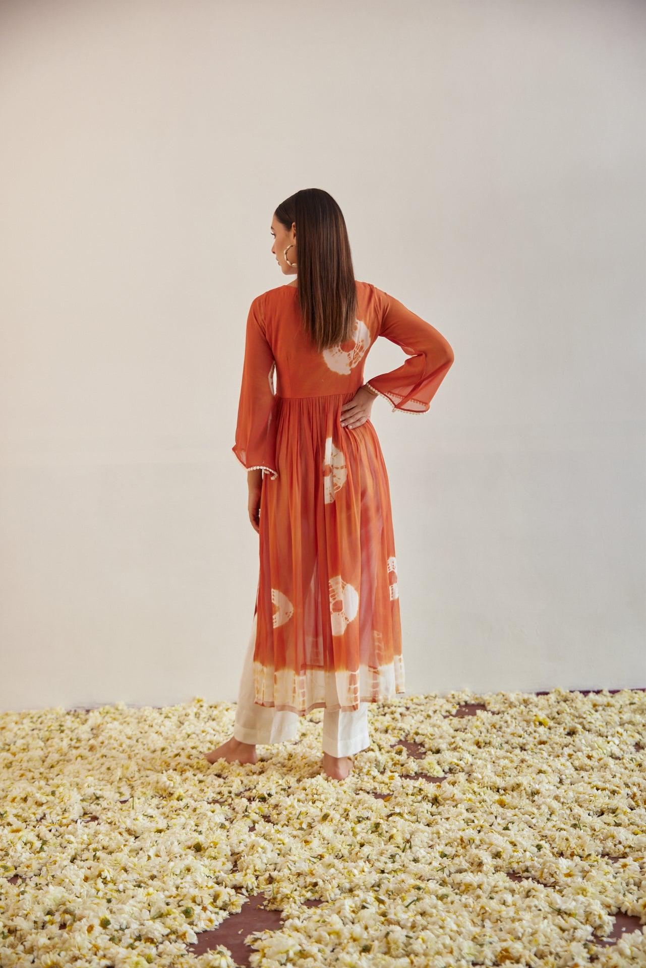 Marigold set , which blend of hand dying circles and a hand dying Shibhori in the ends, sleeves talk of umbrella detailed hands, neck being a broader U with cotton lace details. Delicately dyed in two colours will make you in awe of how well did we do it.