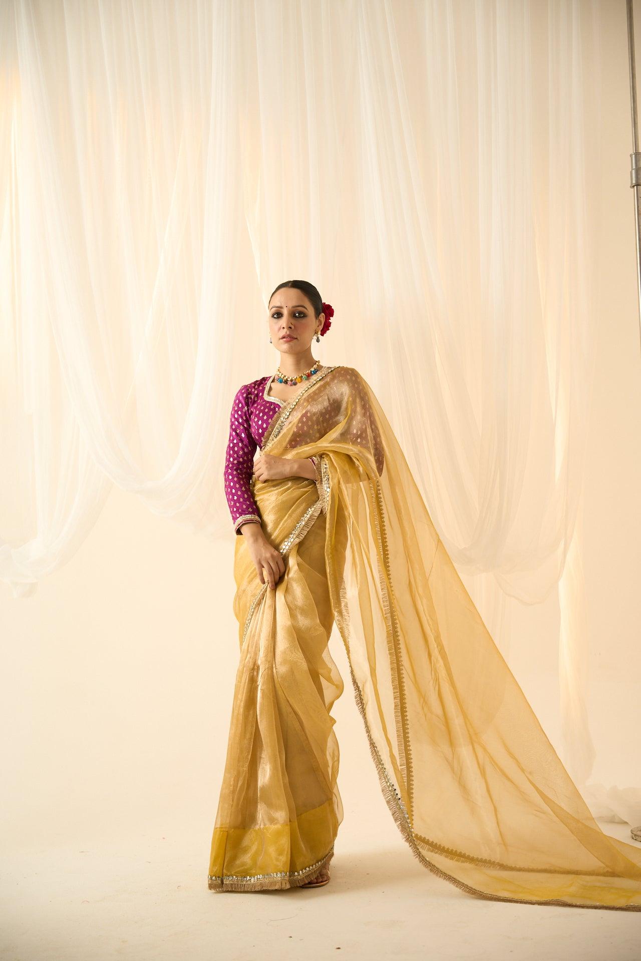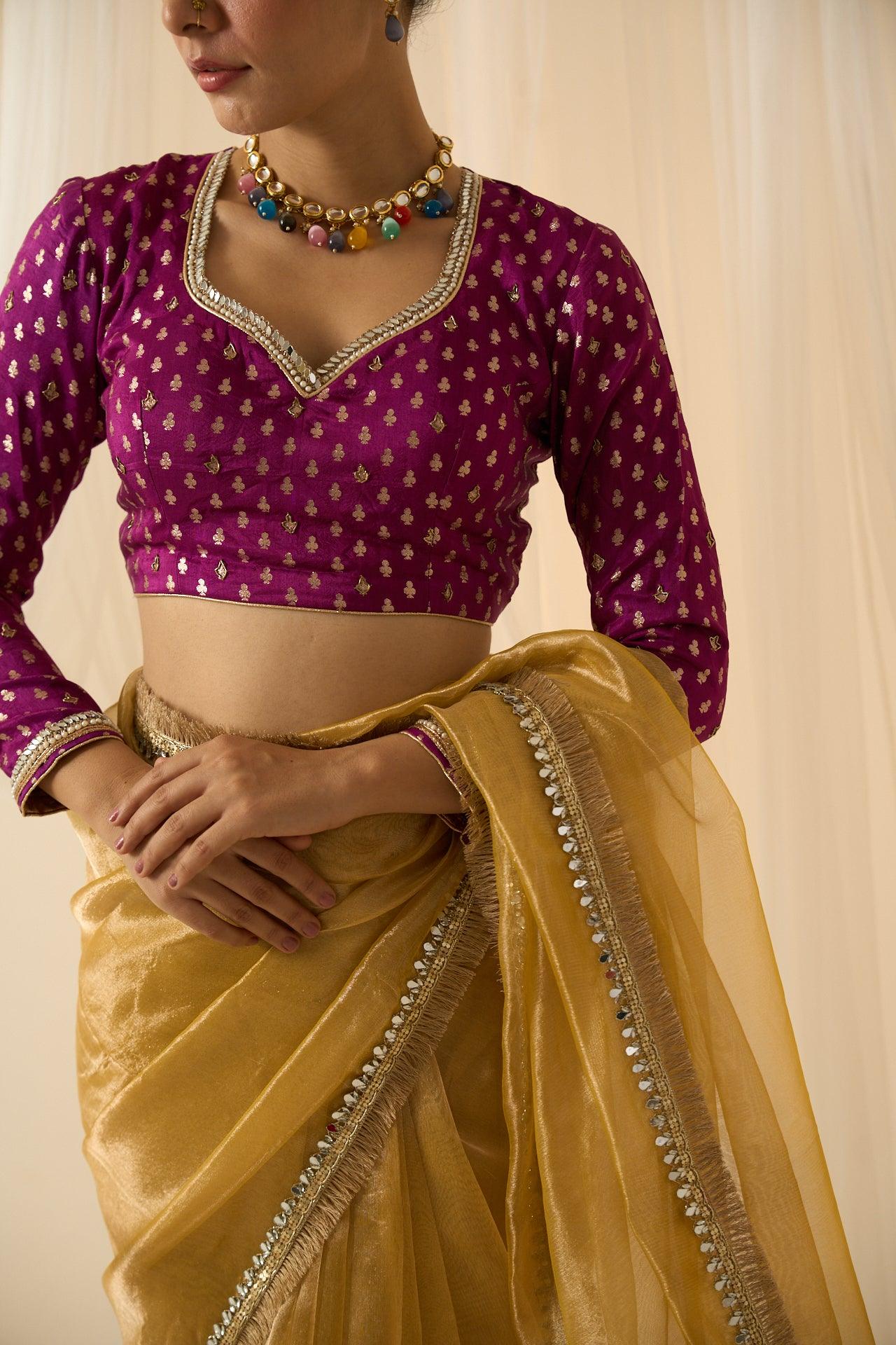 This stunner saree is a win win for us, for the upcoming festive season. It’s a special Diwali edition saree for the all glitz and glam it is giving us, even before stepping out, the people outside knows you’re going to turn heads with its show stopper blouse with beauty back details.