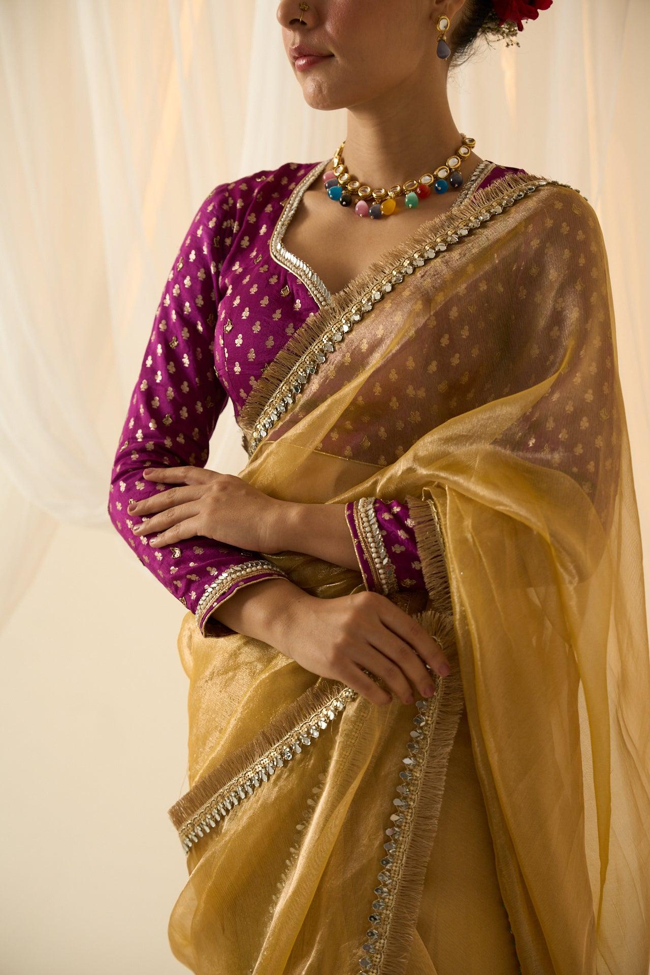 Let’s talk about the fabric, it is a silk tissue zari weaved in the purest form for you, with a boota fabric Chanderi blouse. Hand embroidered dabka details to make it yours even more.