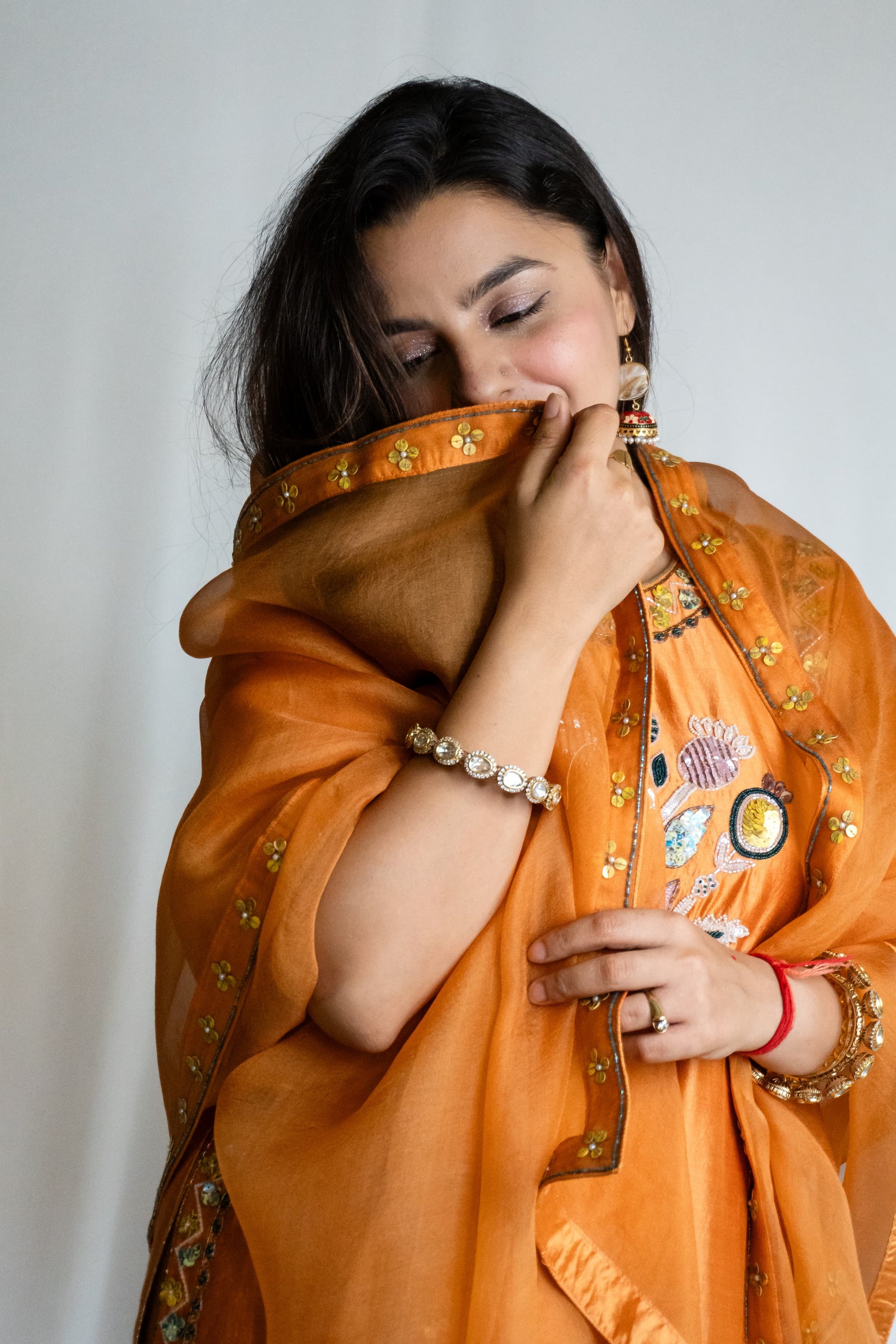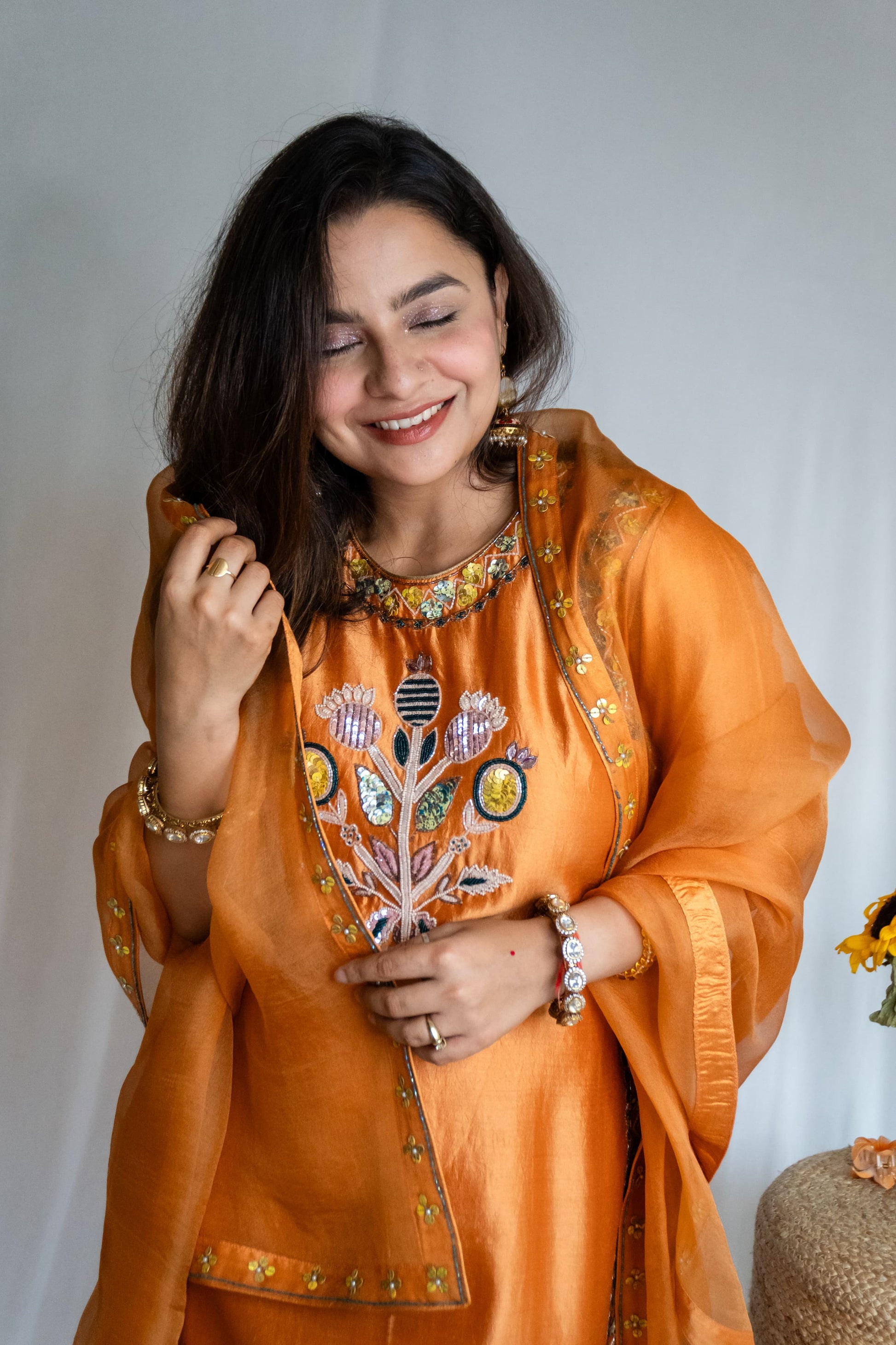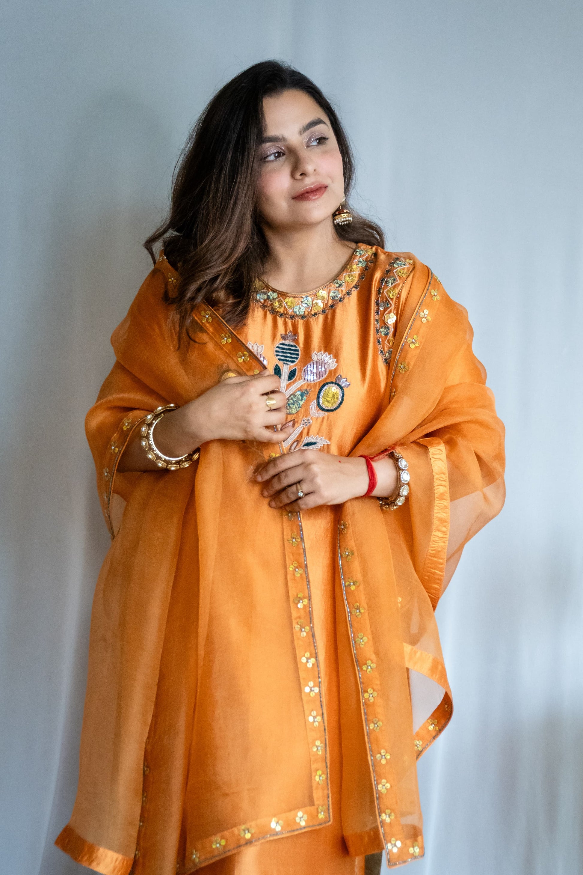 The neckline and sleeves are adorned with intricate hand embroidery — floral motifs brought to life with sequins and mirror work that shimmer like the reflections off a flame. The front of the kurta features a blooming pattern, almost like a memory unfolding. The hemline and organza dupatta carry the same delicate handwork, giving it a festive sparkle without overpowering the subtle grace of the silk.