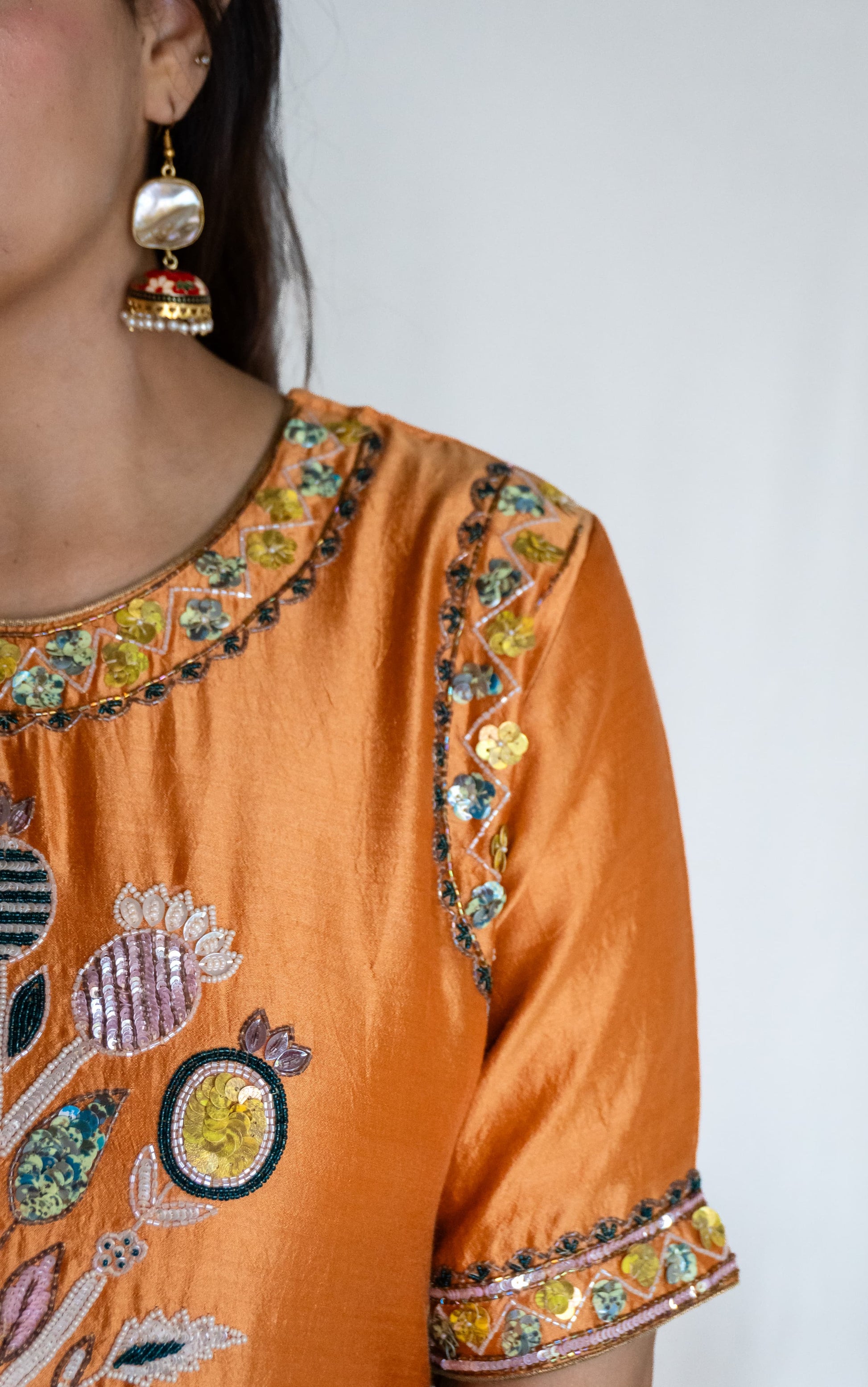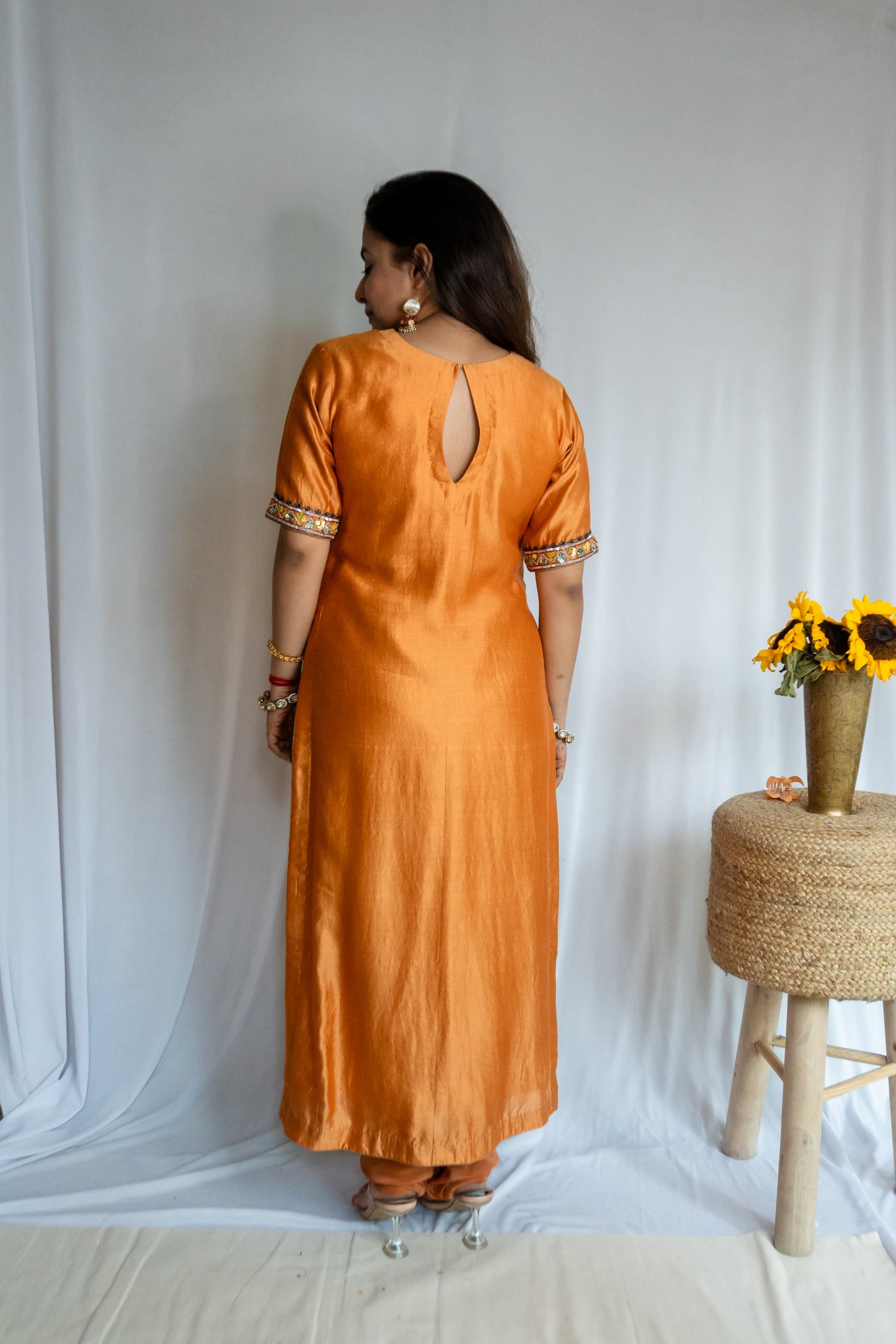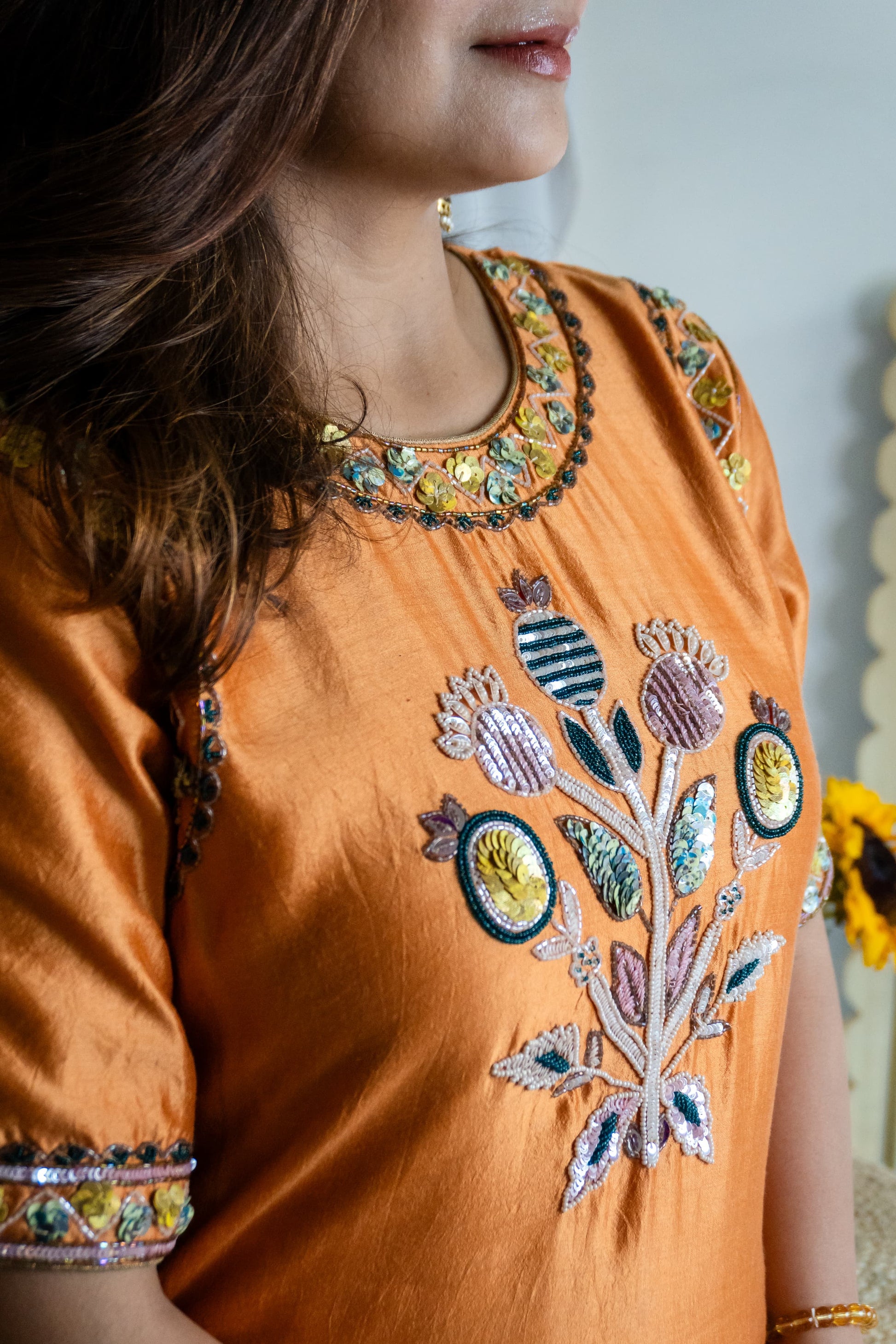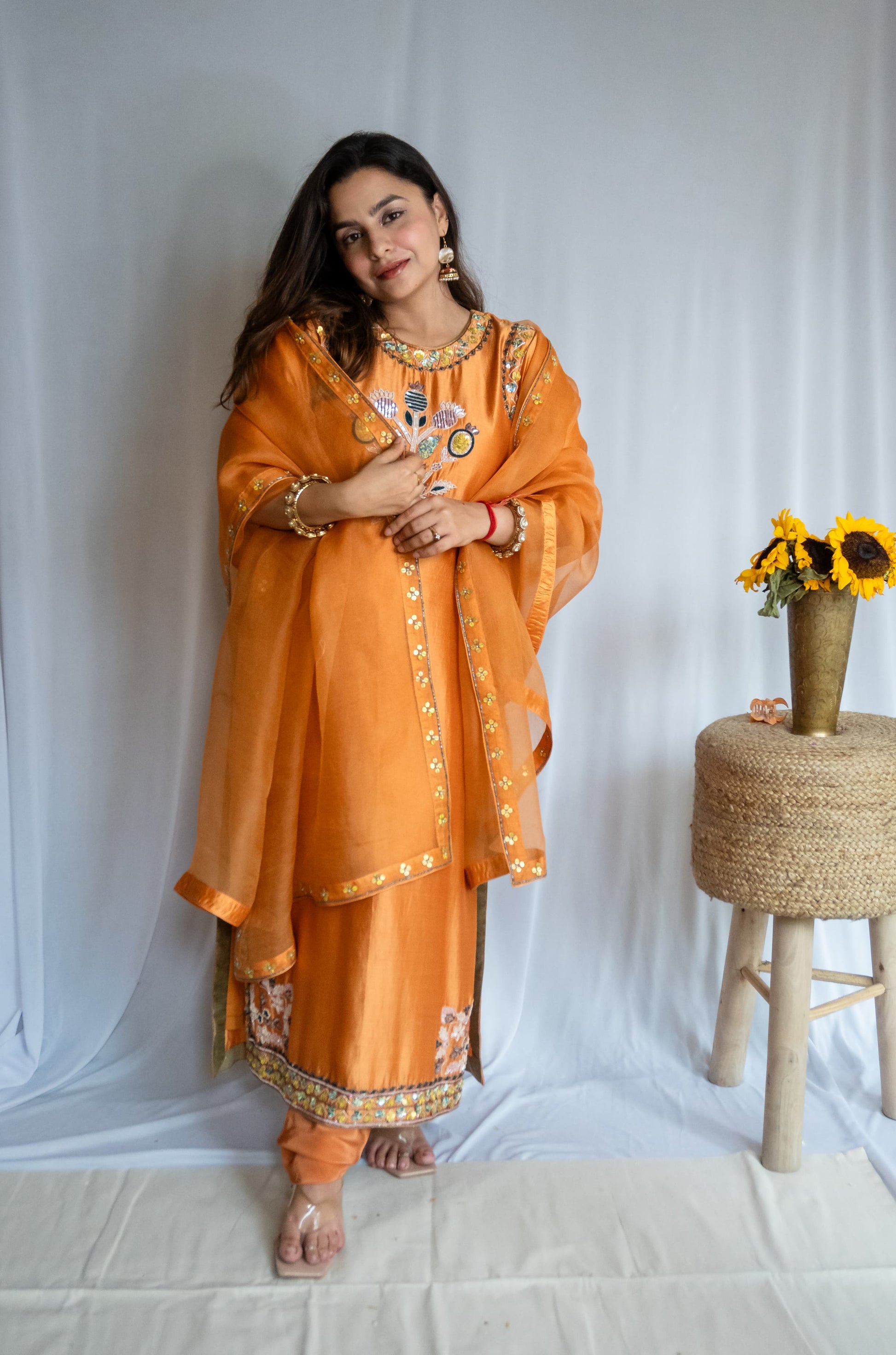 The neckline and sleeves are adorned with intricate hand embroidery — floral motifs brought to life with sequins and mirror work that shimmer like the reflections off a flame. The front of the kurta features a blooming pattern, almost like a memory unfolding. The hemline and organza dupatta carry the same delicate handwork, giving it a festive sparkle without overpowering the subtle grace of the silk.