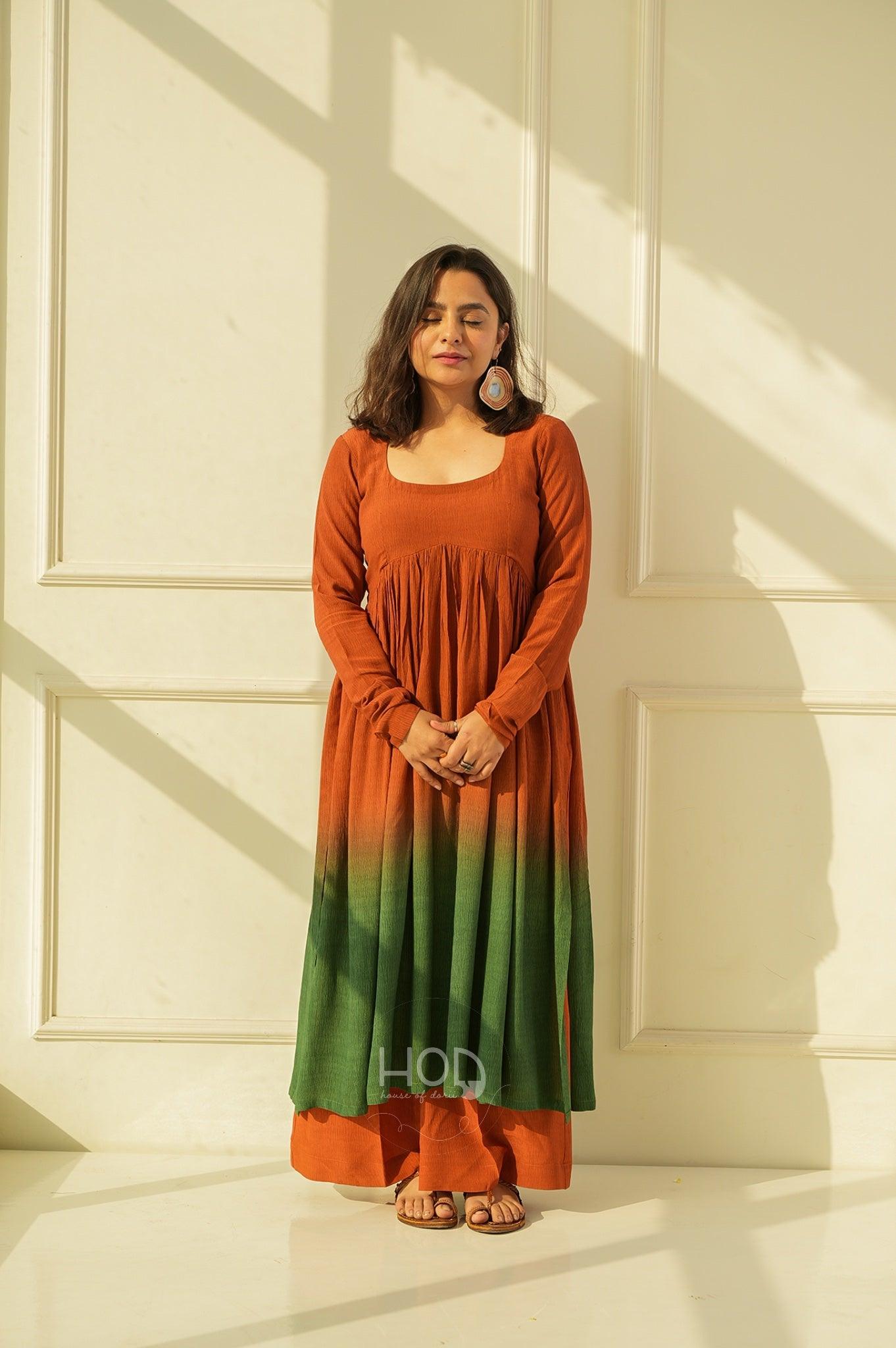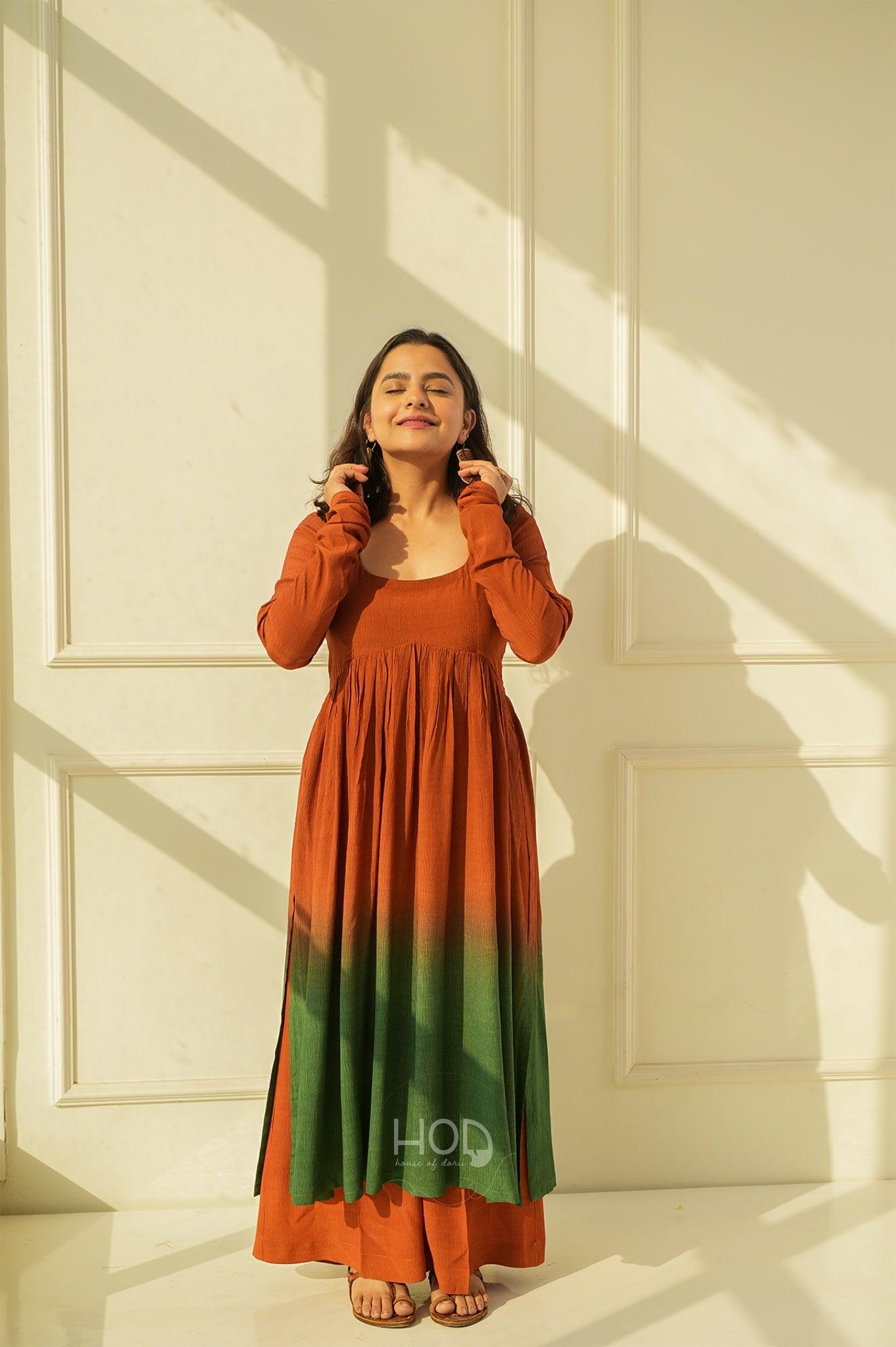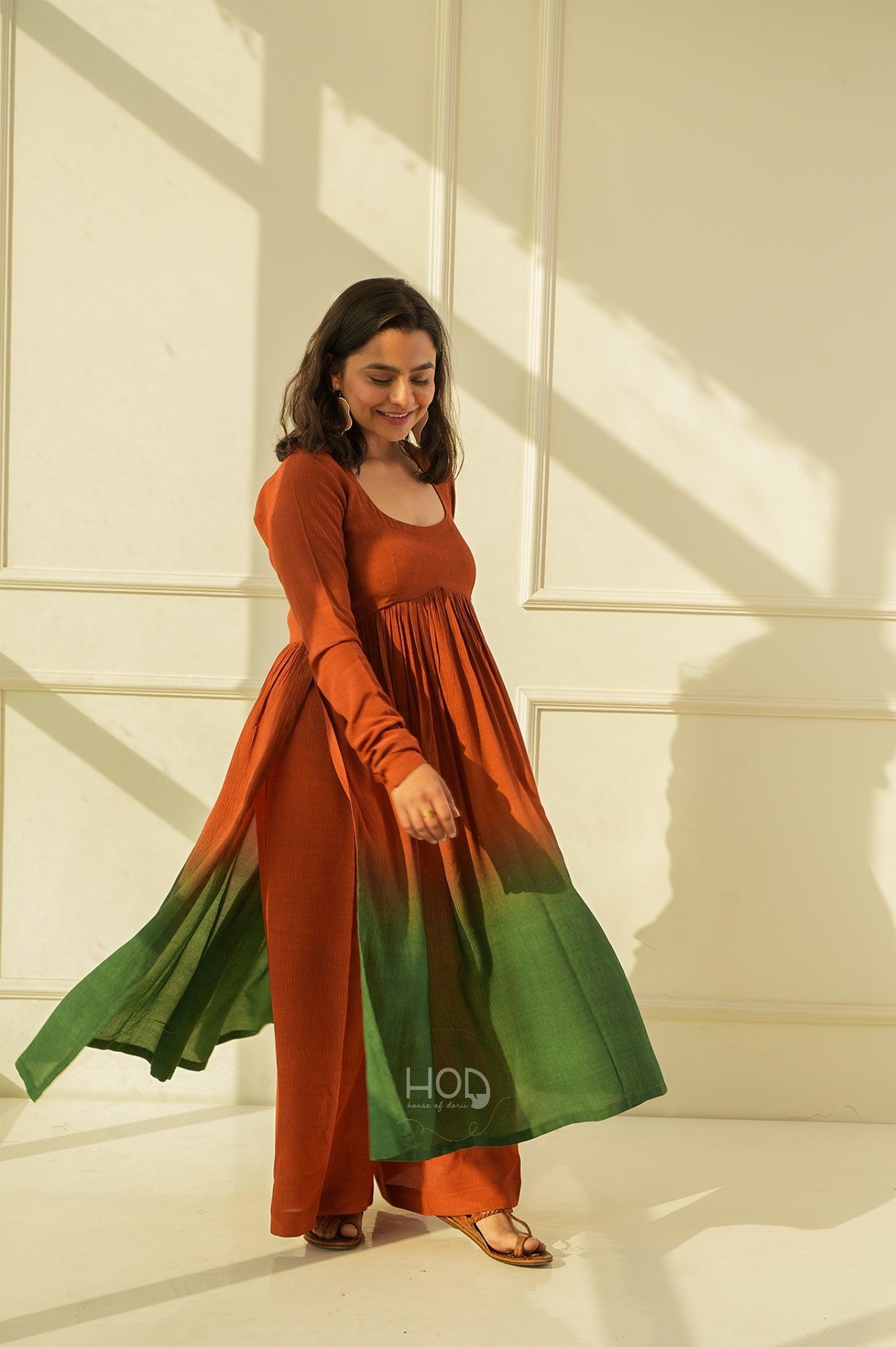 Green Tea set is a two piece set, which is a a Hand dyed ombré dyed in the ends, in brightest our favorite tan and greens with full sleeves talk of detailed hands and the pyjama pants which gives a whole beauty look, you would absolutely fall in love with the fabric so comfortable and classic.