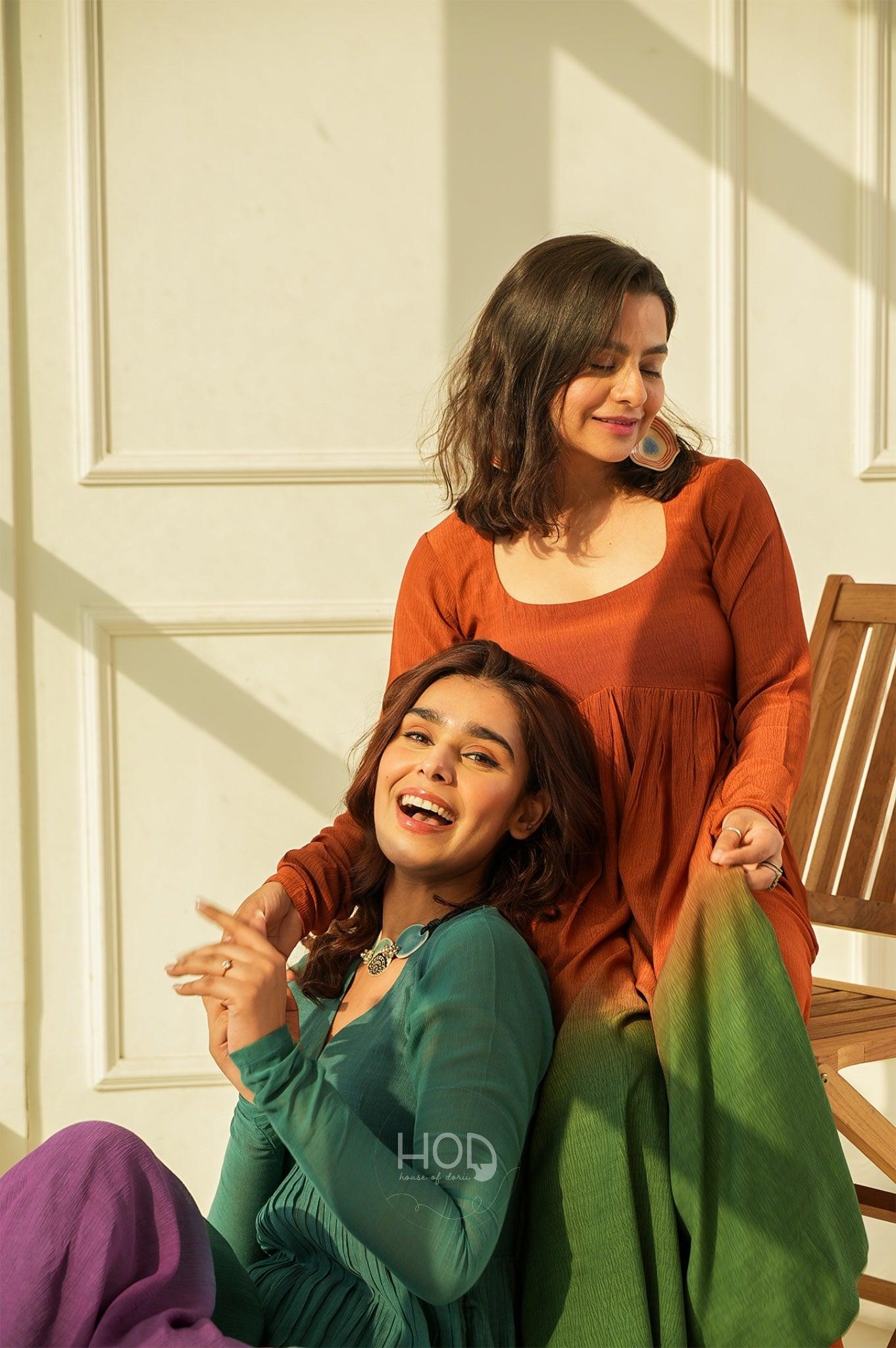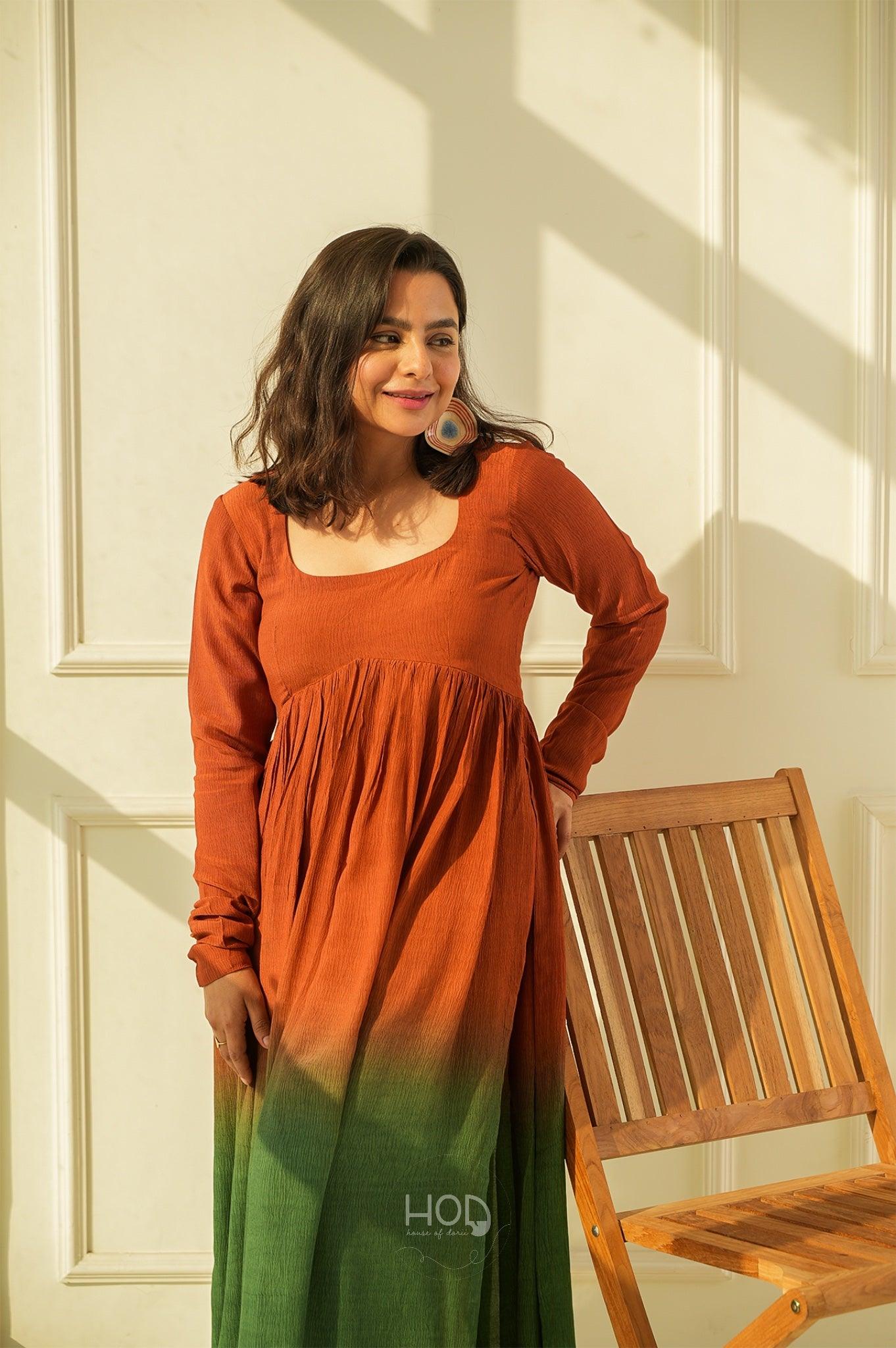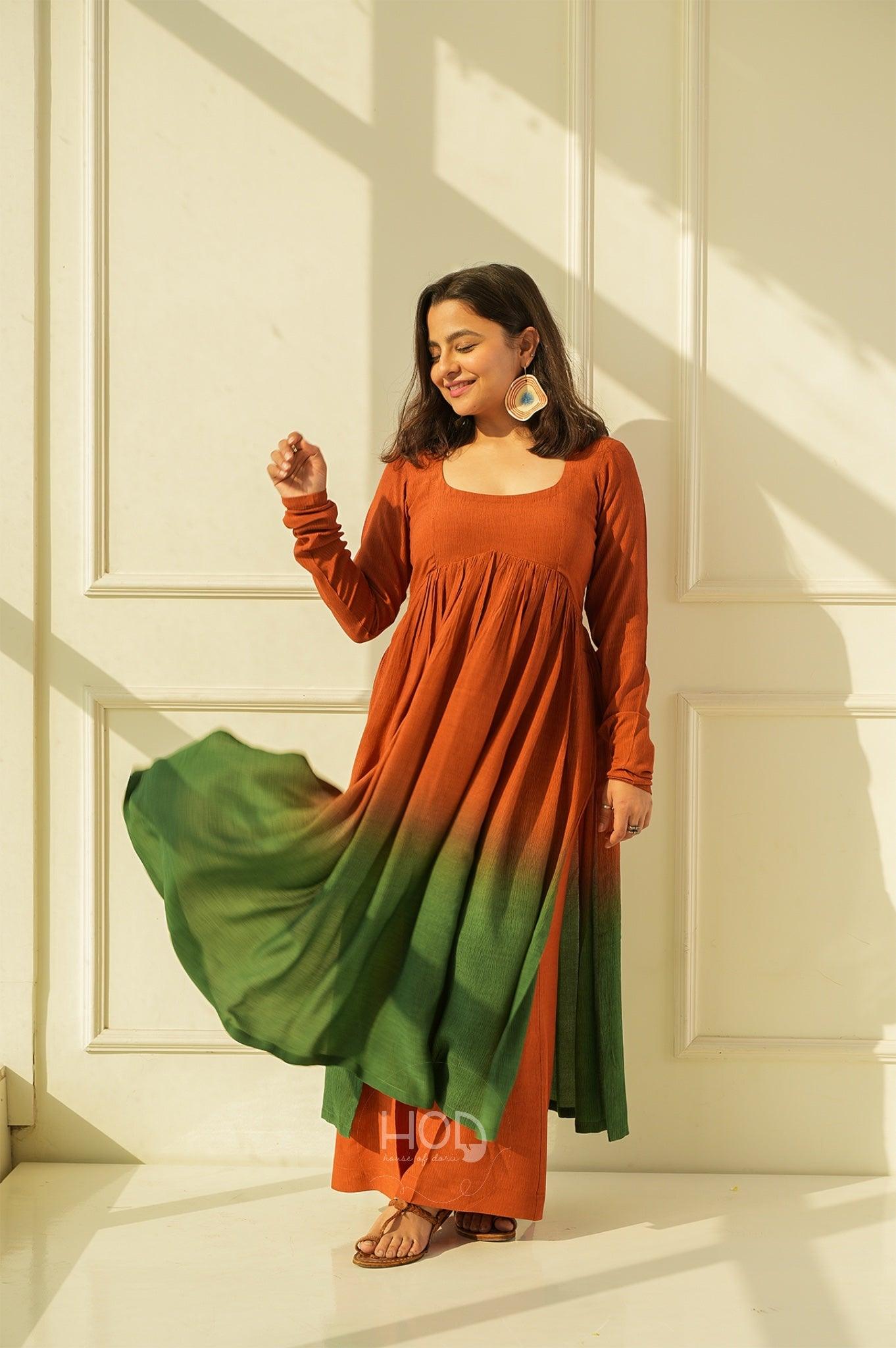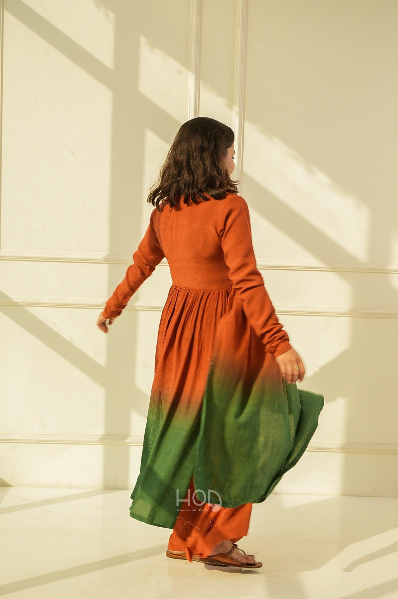 Green Tea set is a two piece set, which is a a Hand dyed ombré dyed in the ends, in brightest our favorite tan and greens with full sleeves talk of detailed hands and the pyjama pants which gives a whole beauty look, you would absolutely fall in love with the fabric so comfortable and classic.