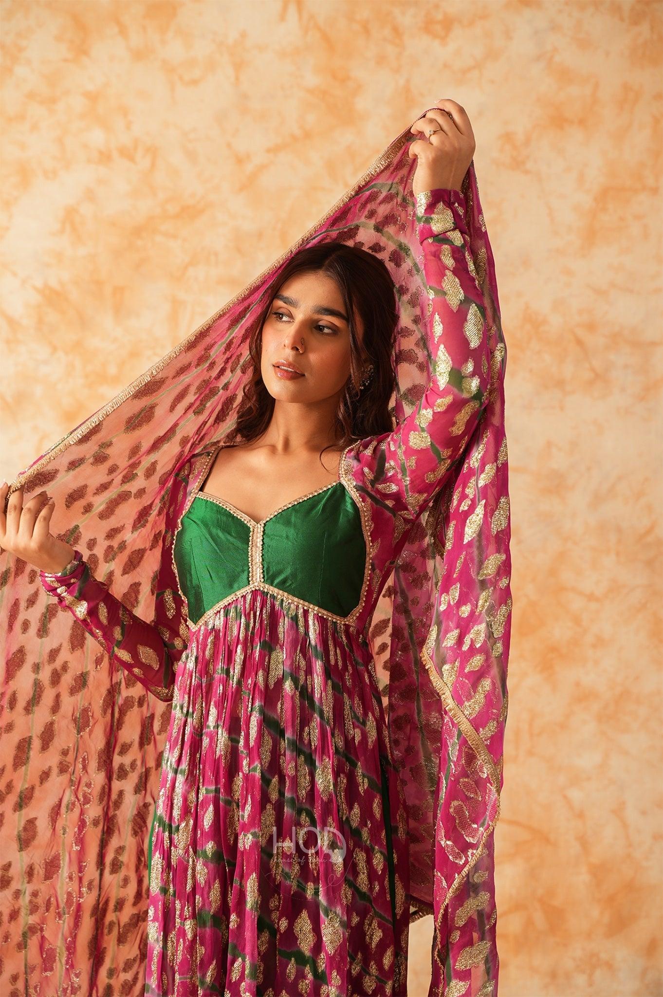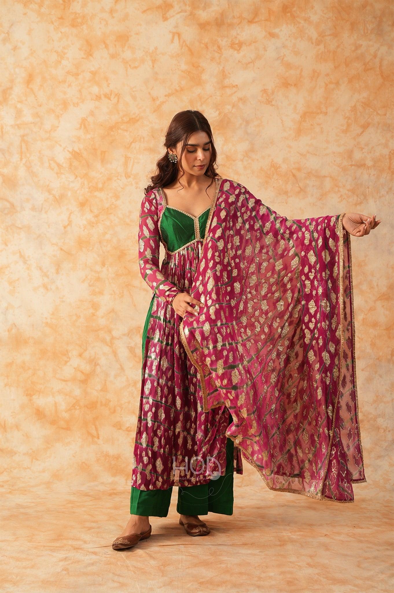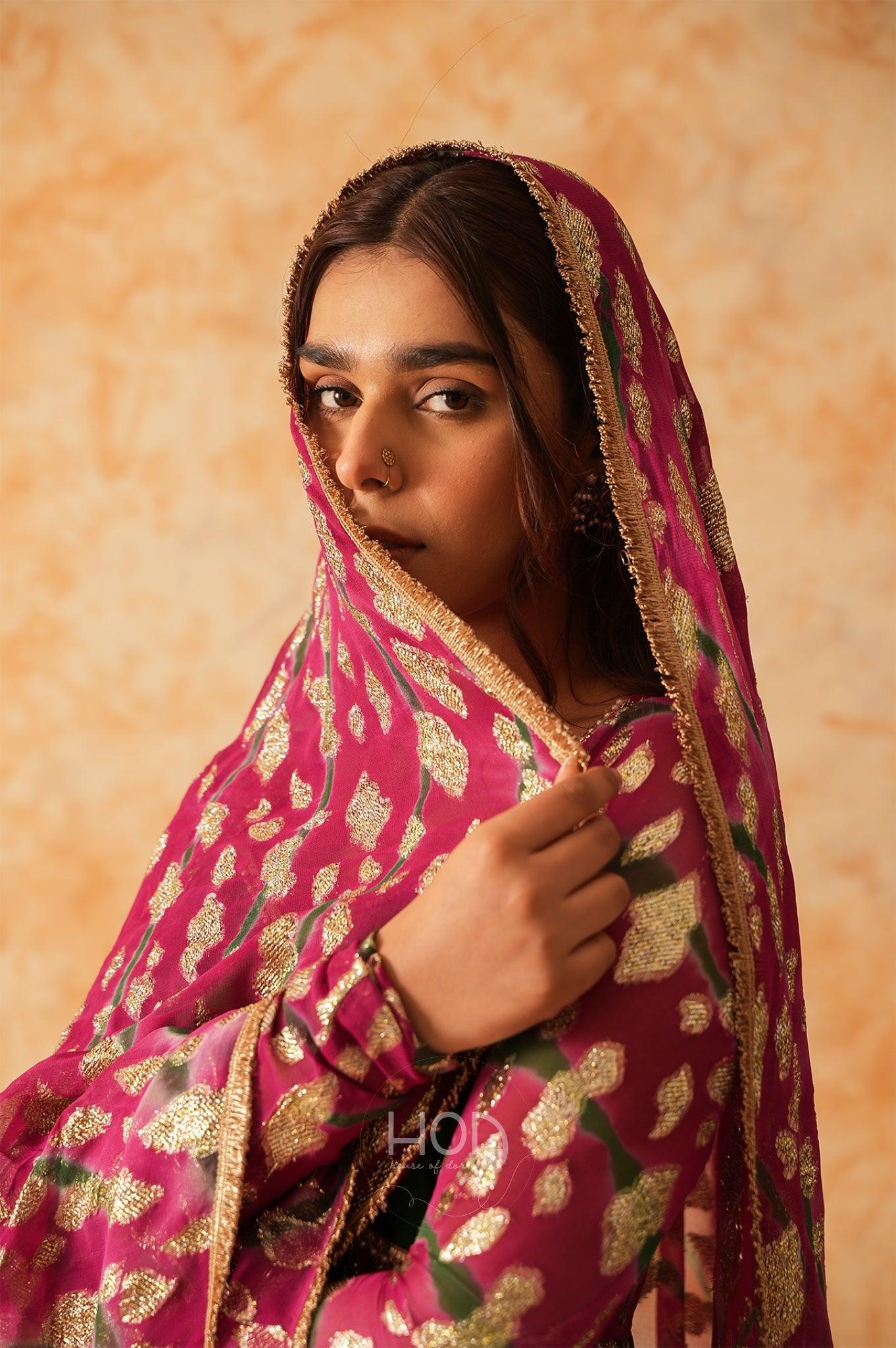 As its name and pronoun, this beautiful hand dyed Leheriya set with zari boota details all over and a green detailed yok with gotta and pearl lace details, well contrasted with the pants below, a big sized fringed lace dupatta.