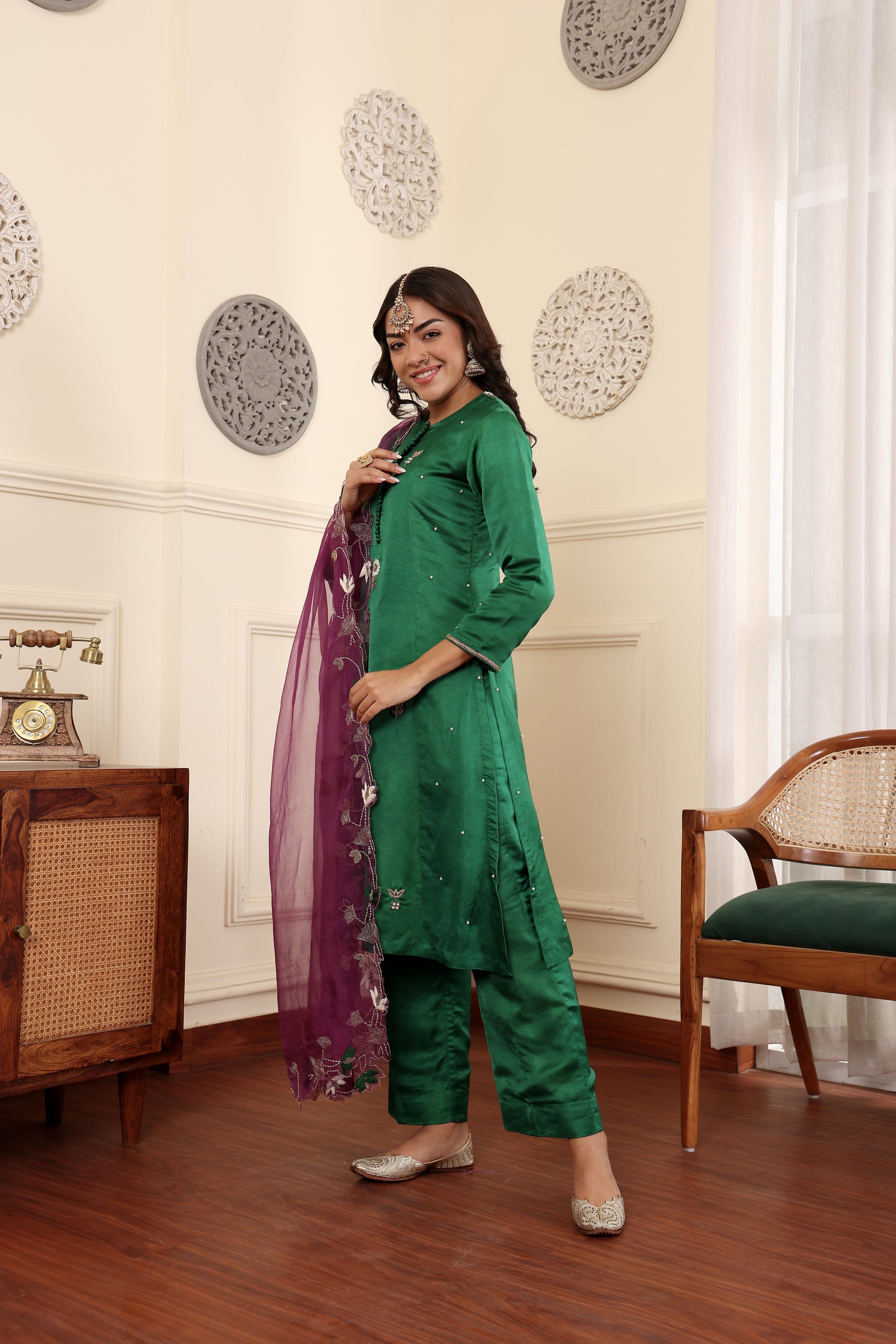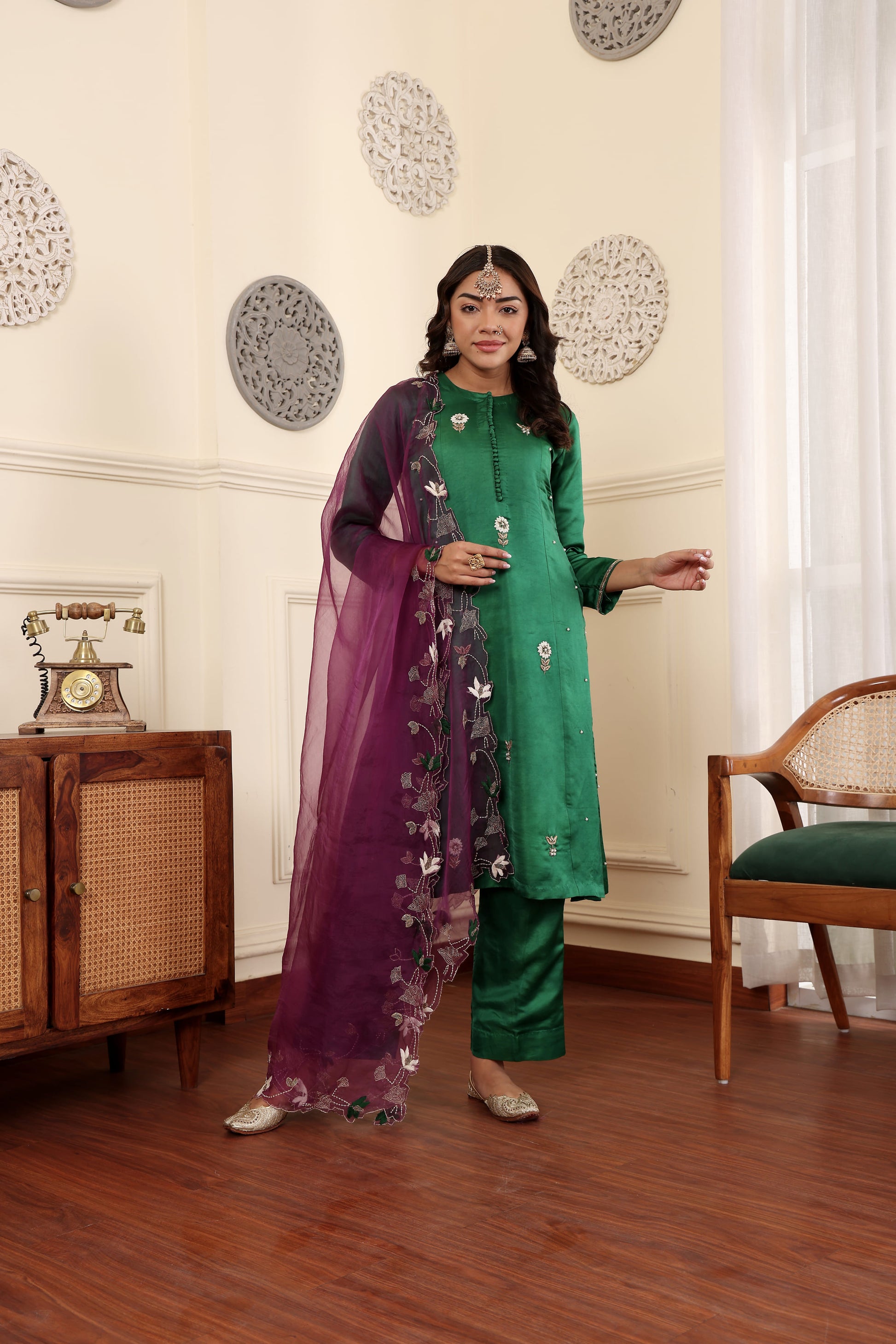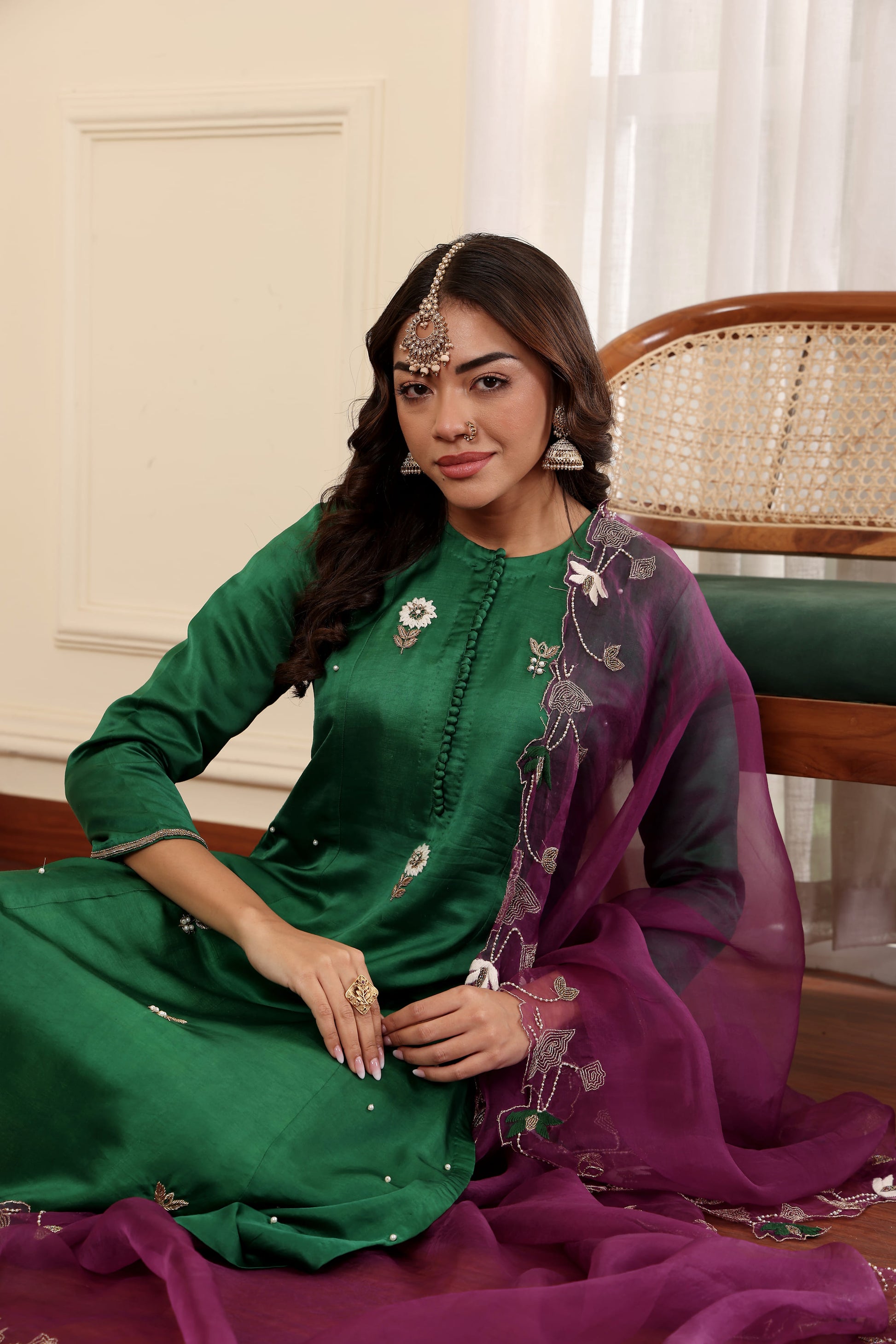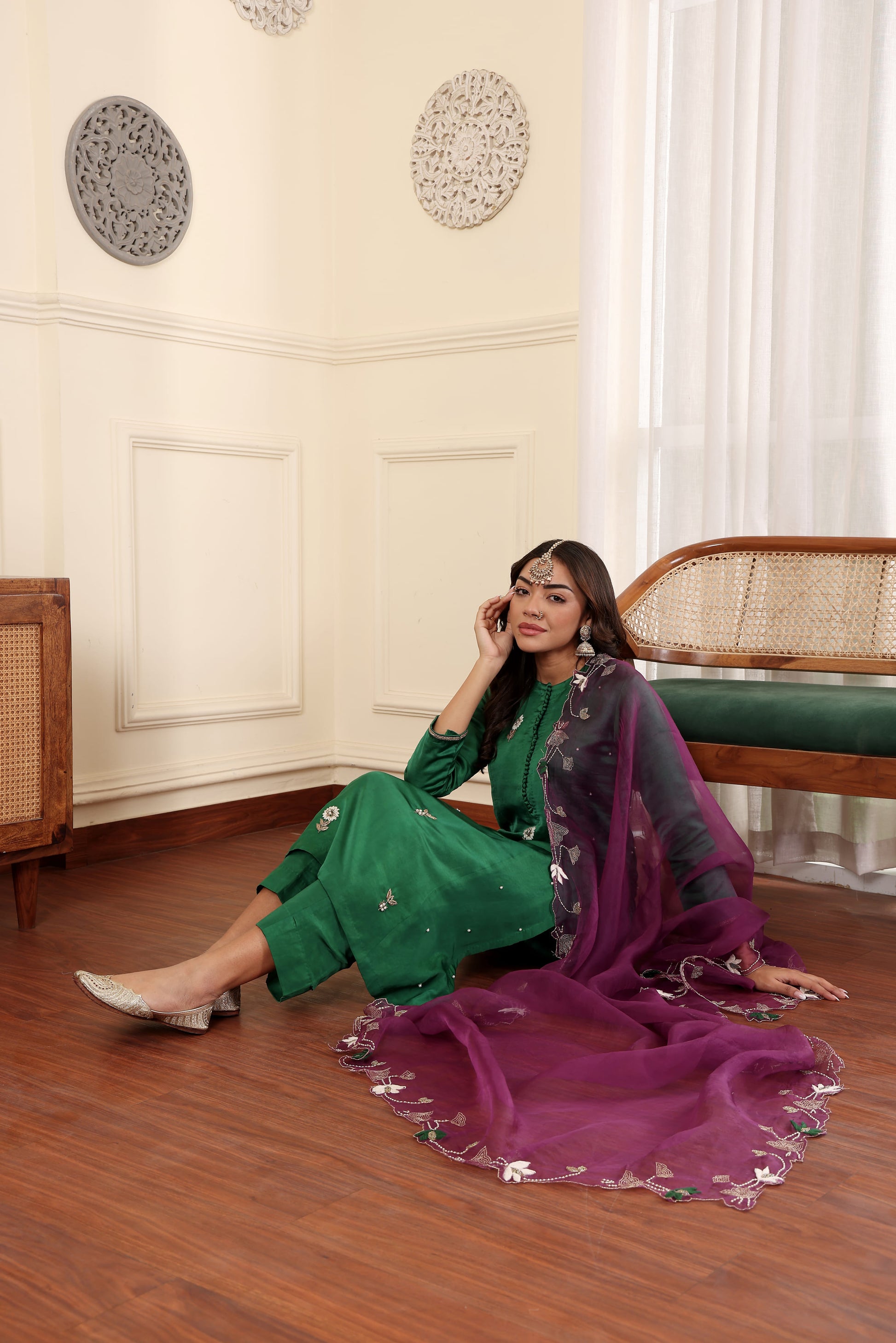 • Color: A deep, royal green kurta set, contrasted with a rich handcrafted dupatta