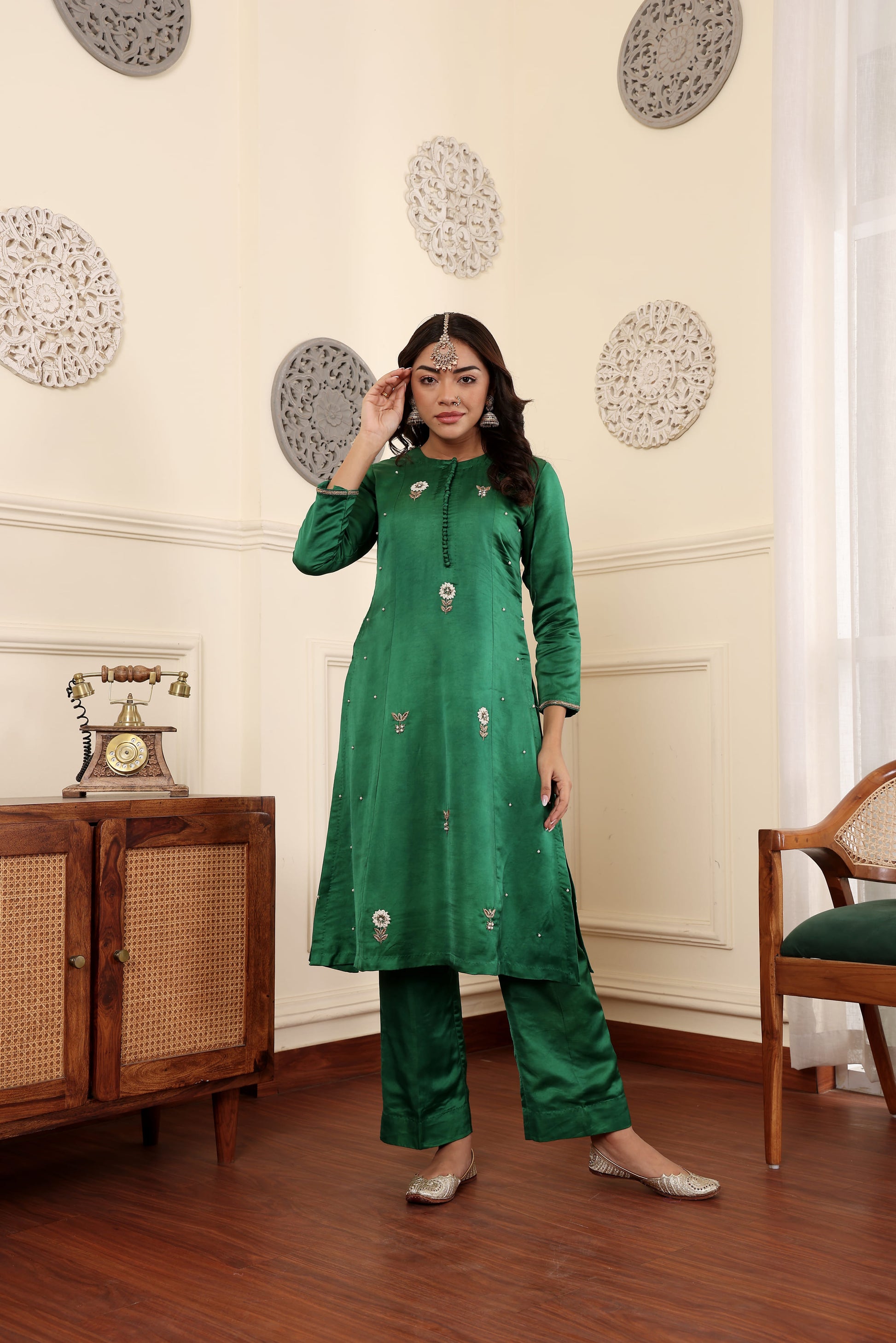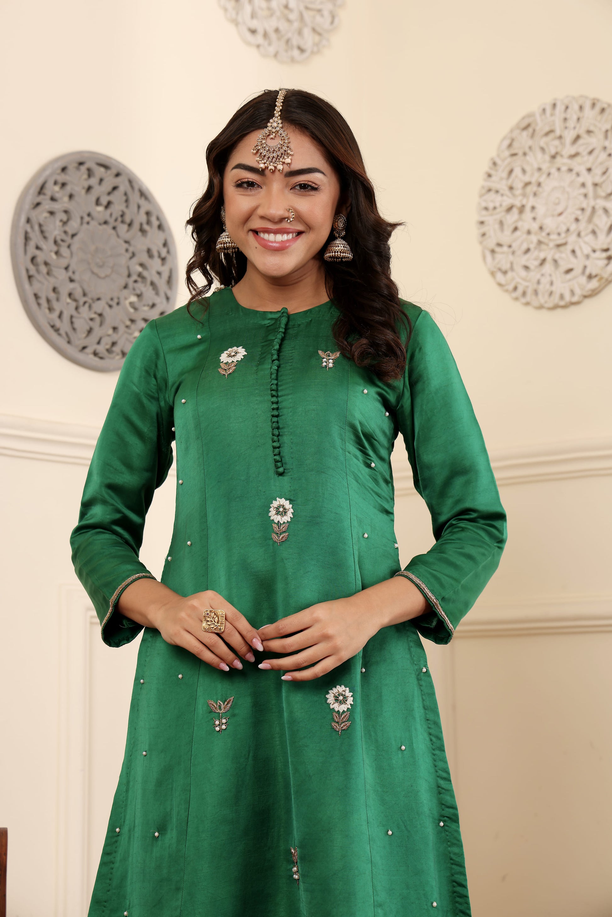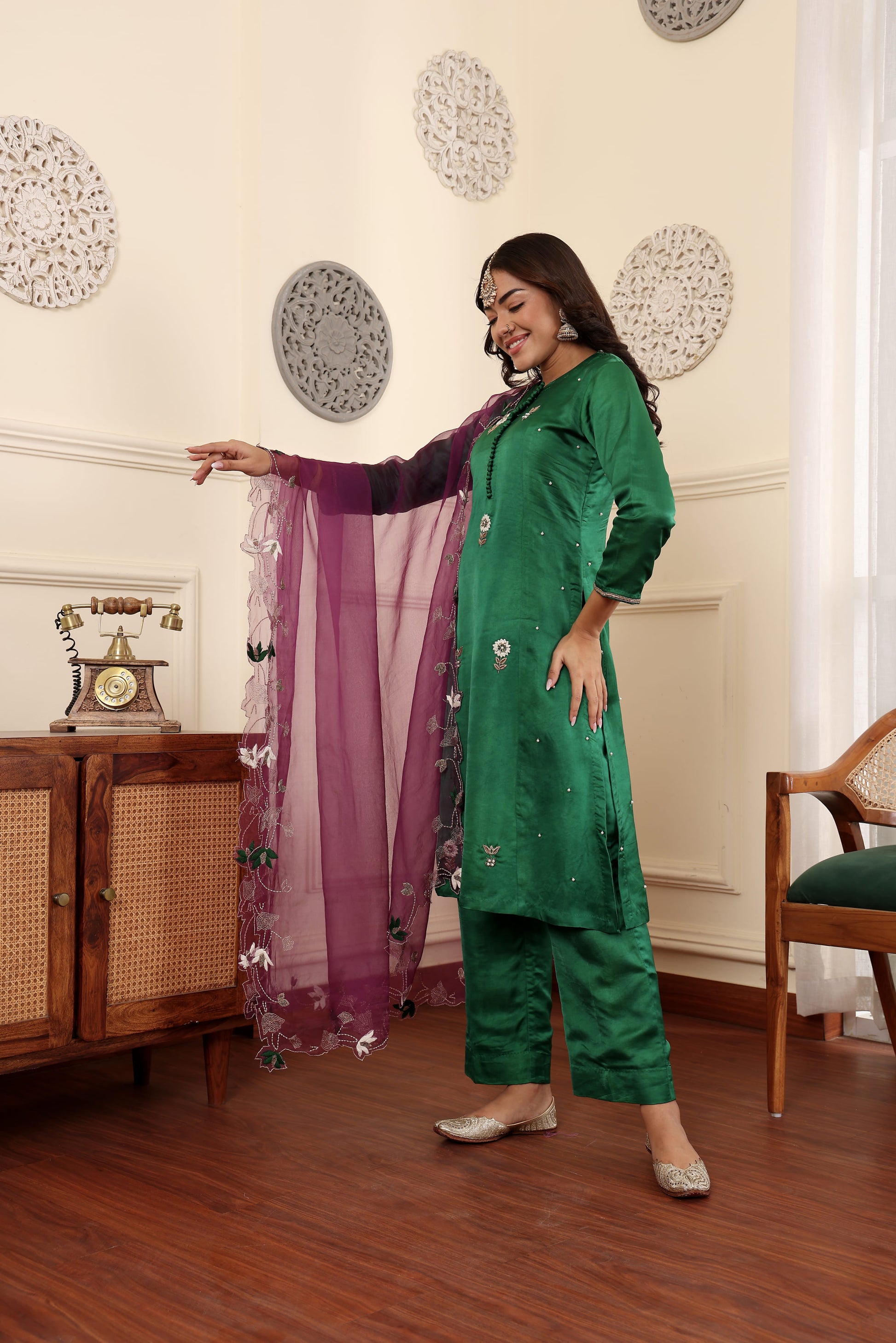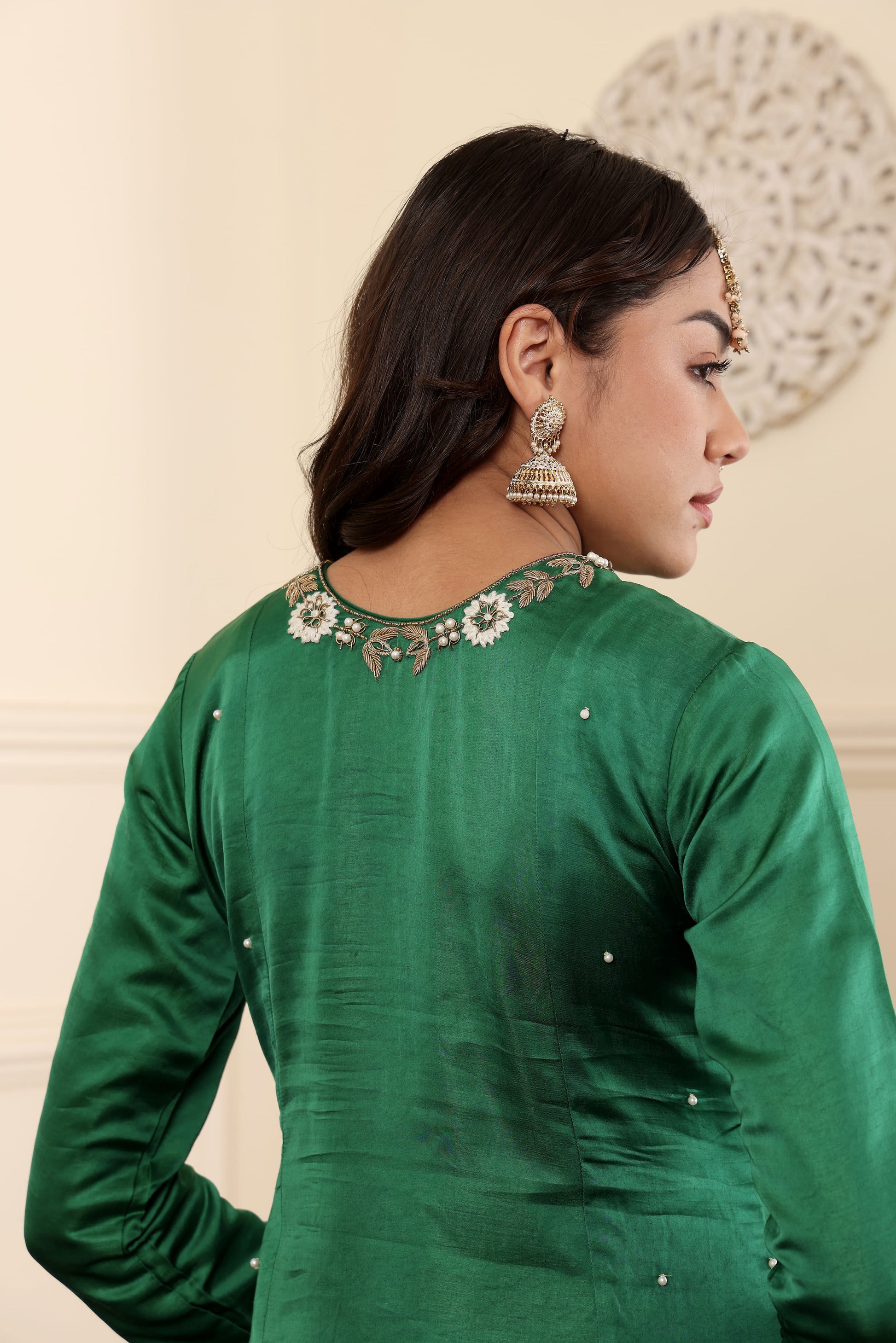 • Color: A deep, royal green kurta set, contrasted with a rich handcrafted dupatta