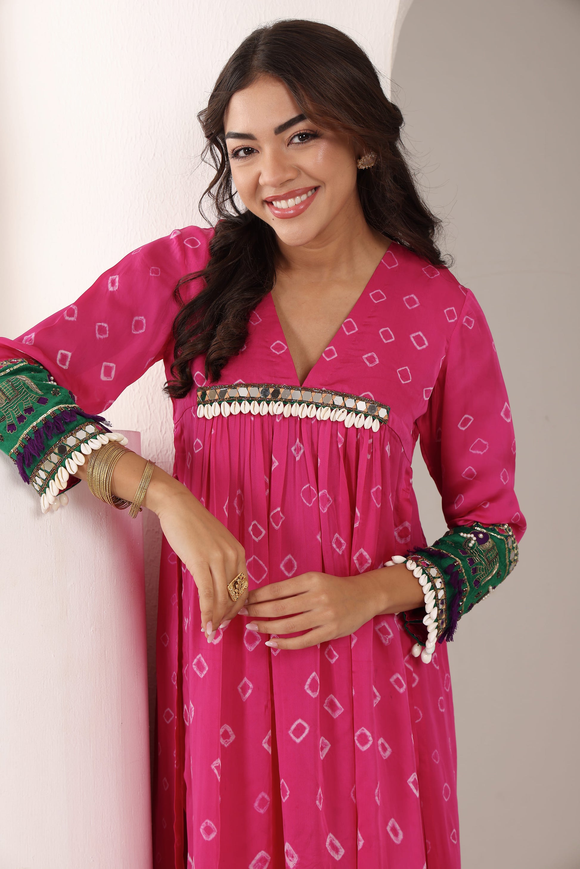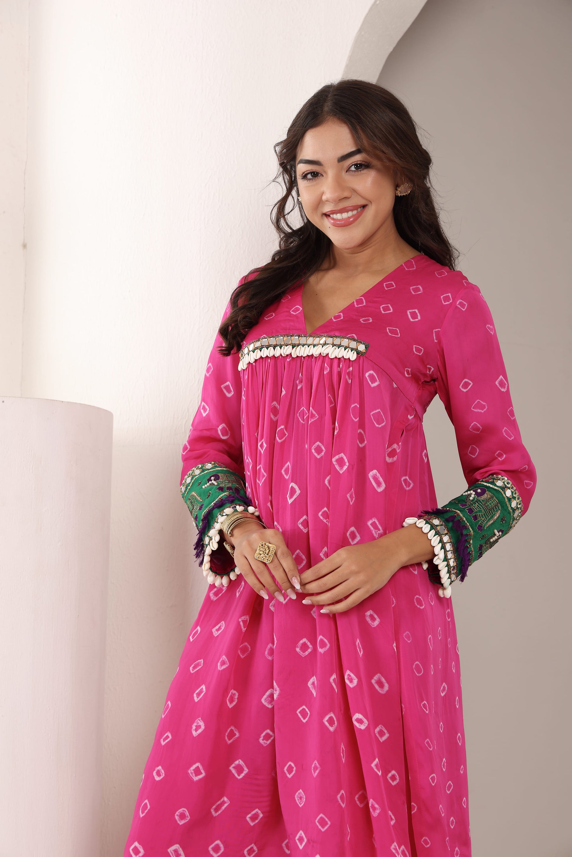 • Kurta: Premium satin organza, hand-dyed in traditional Bandhani print using natural colors.