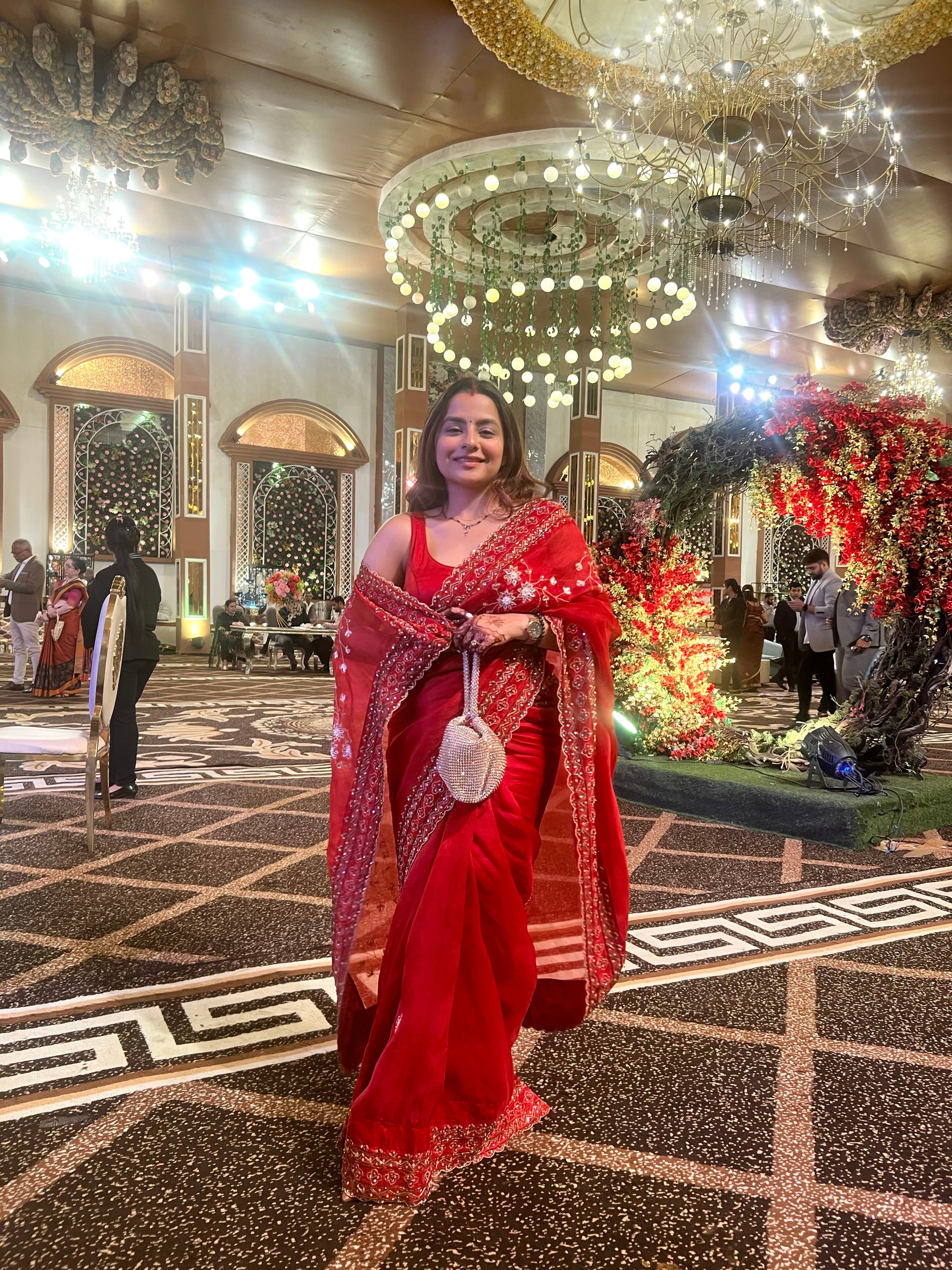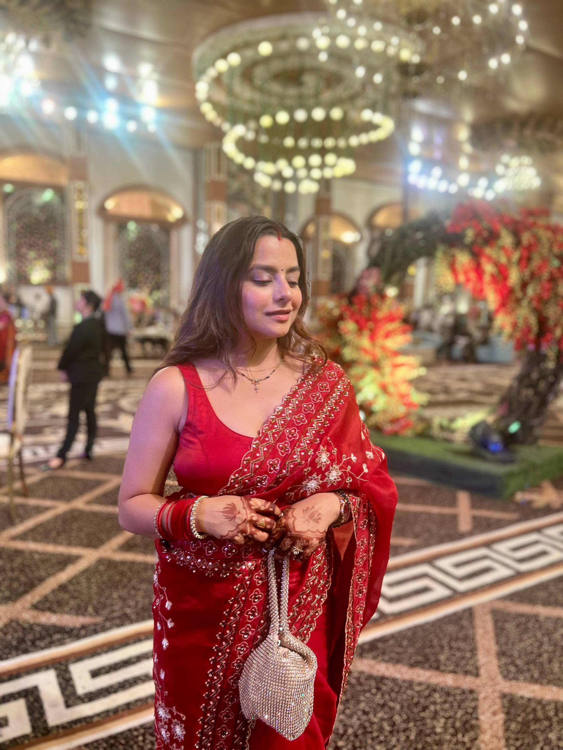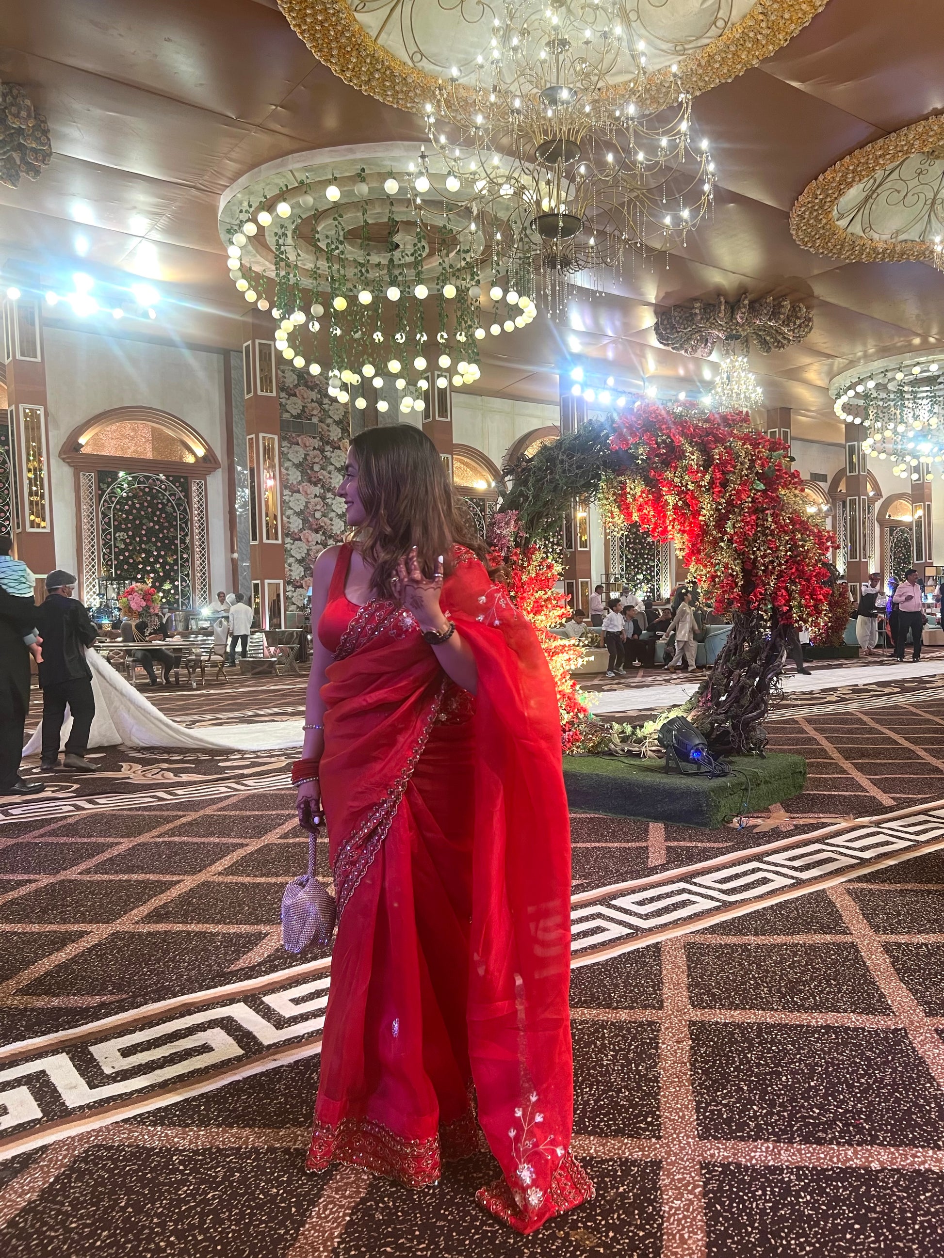 The subtle embroidery of katdana, sequins and Zari on the border adds festive warmth, while the rich organza fabric drapes like poetry—elegant, grounded, and powerful. The floral combination on the pallid and the saree makes it shine brighter.