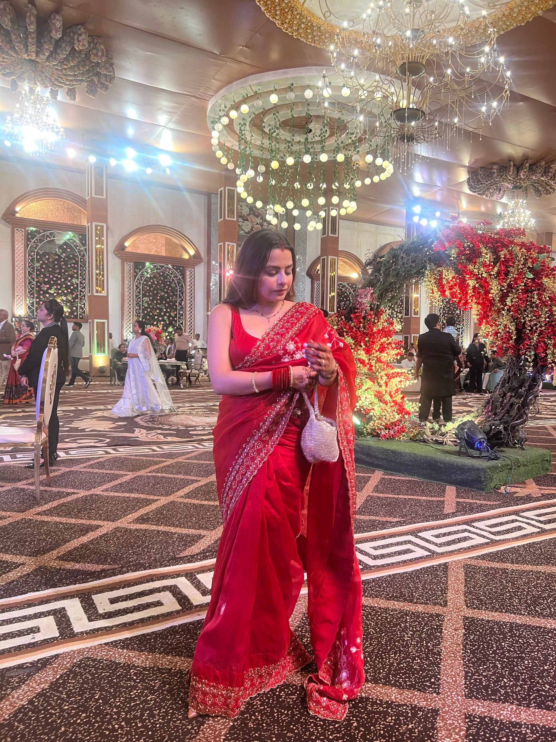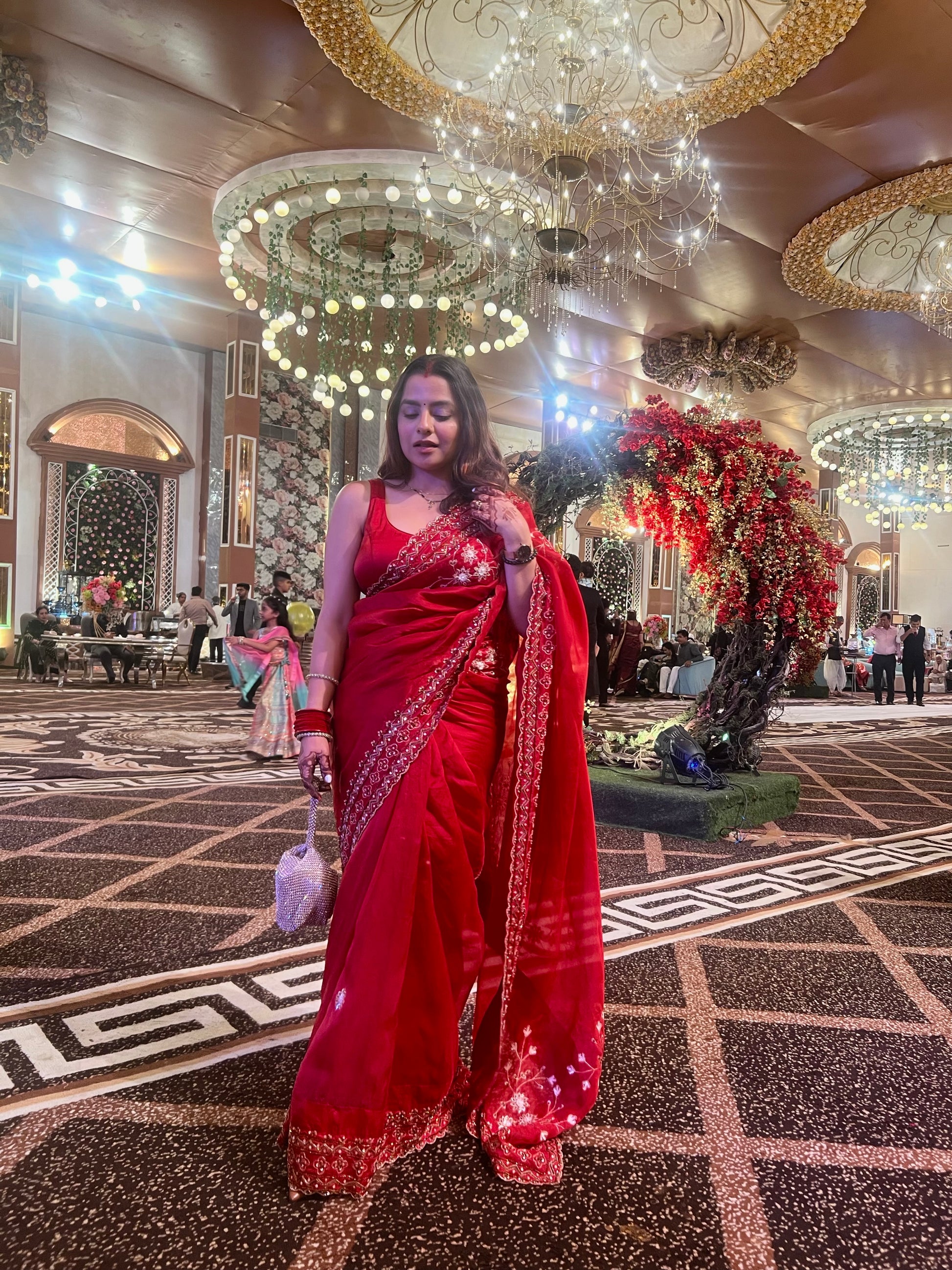 As radiant as the vermillion sun sinking into the horizon, Kumkum Tara is an ode to divine femininity and timeless tradition. Crafted in a deep, luminous red with delicate embroidery that catches the light just right, this saree is made for evenings where rituals meet celebration, and grace flows effortlessly.