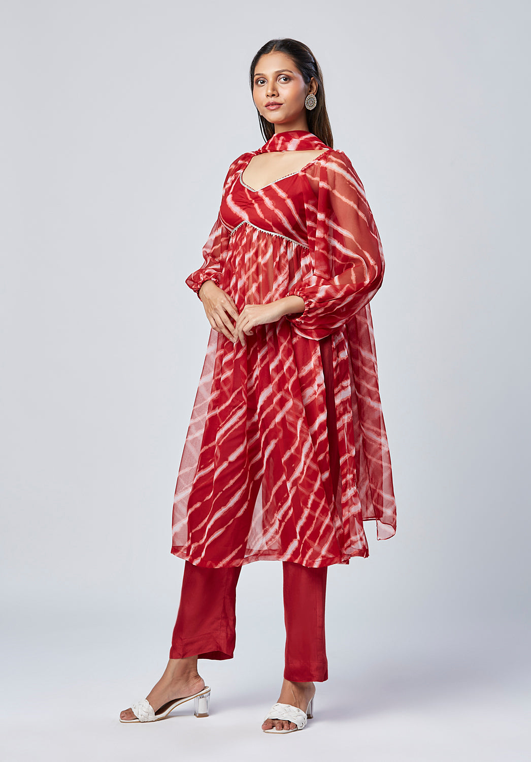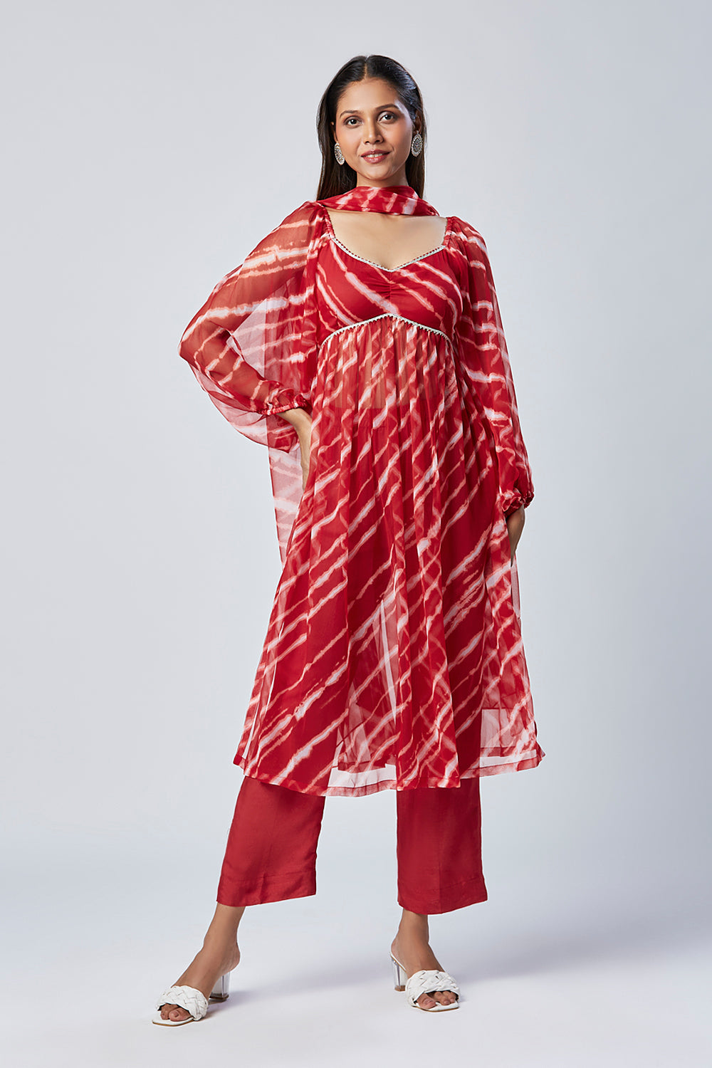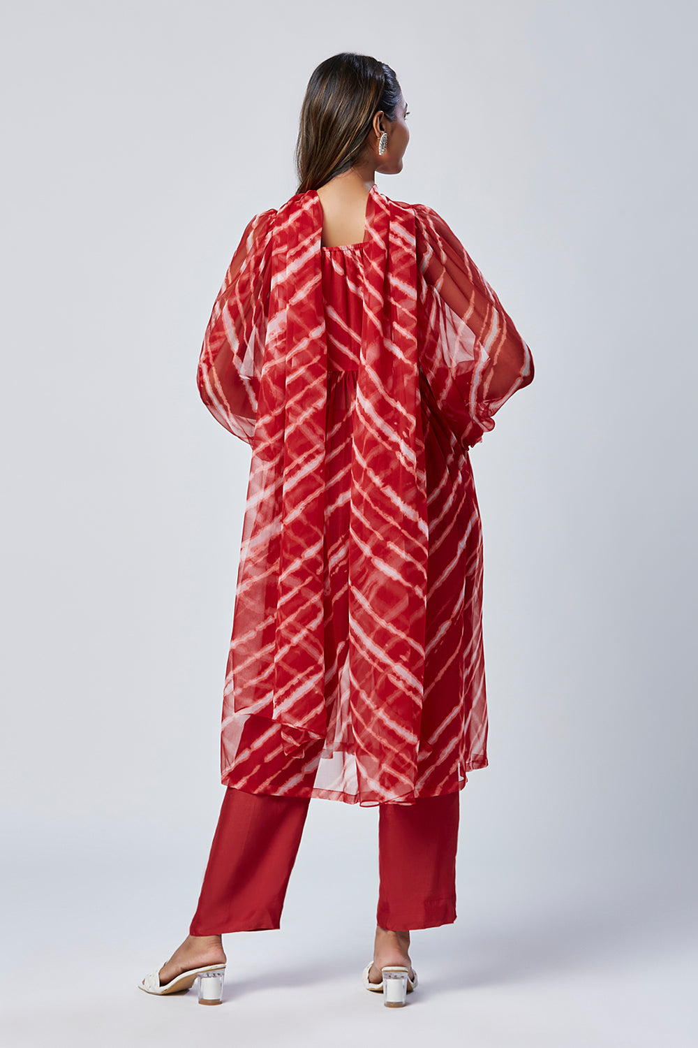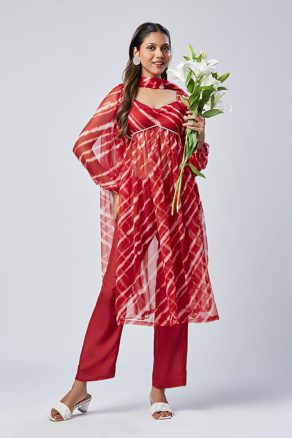 Upgrade your ethnic wardrobe with Leheriya Lal, a chic and elegant red kurta set for women featuring a stunning leheriya print. Designed to blend tradition with modern aesthetics, this viscose georgette kurta is lightweight, flowy, and perfect for festive occasions. The empire-cut yoke, lined for comfort, enhances the silhouette, while the full-sleeve sheer overlay adds a touch of sophistication.