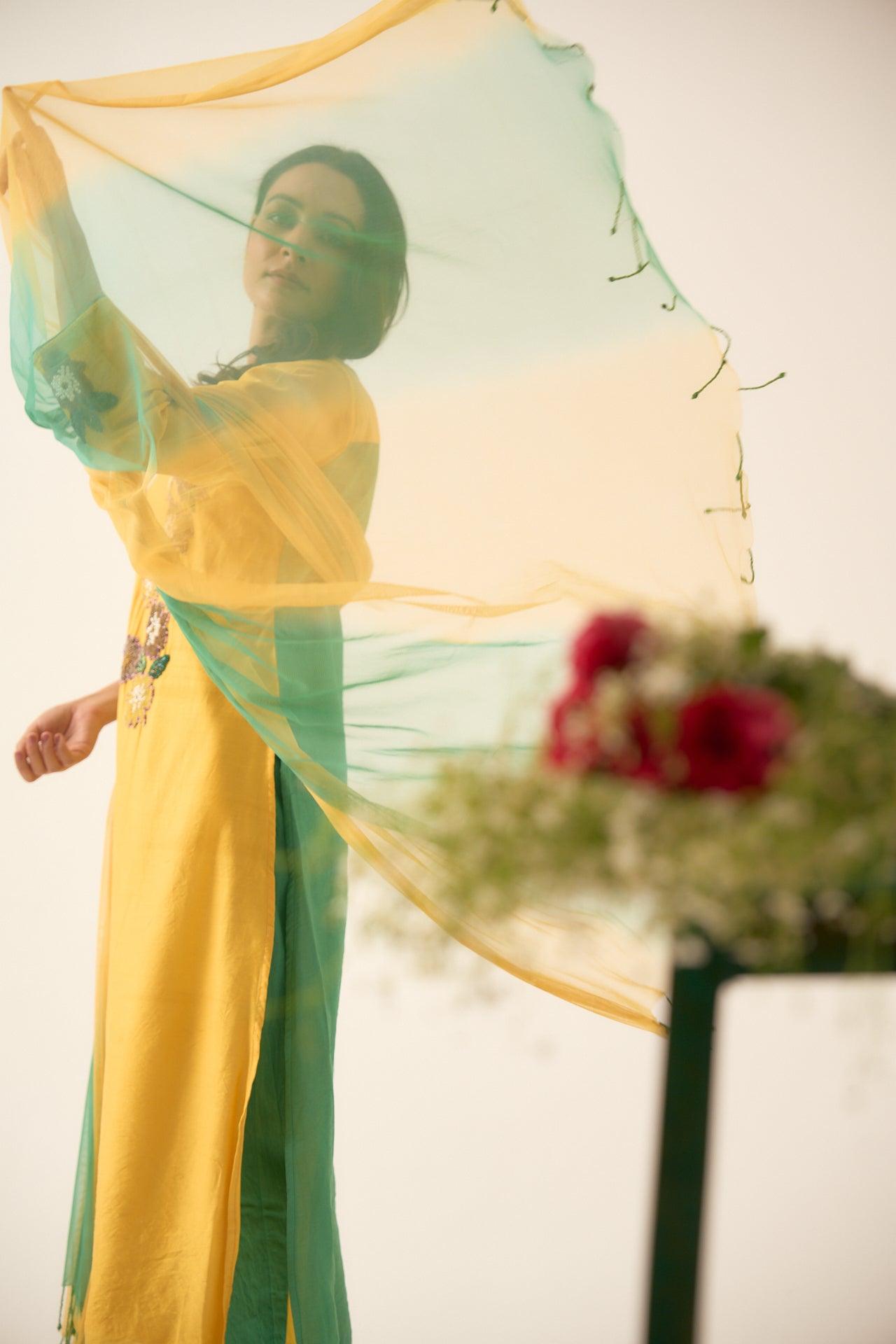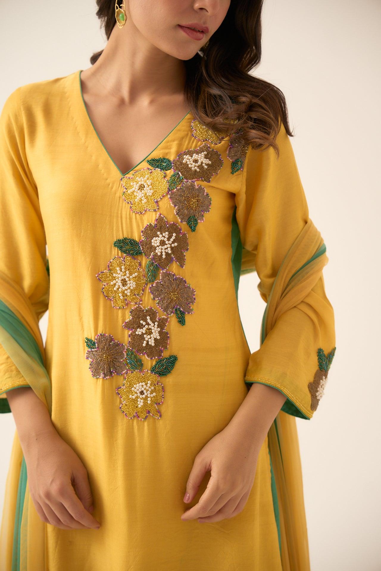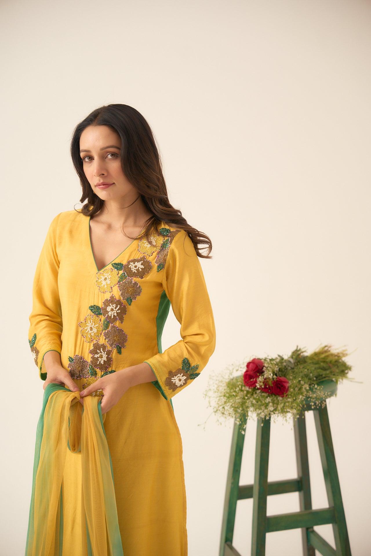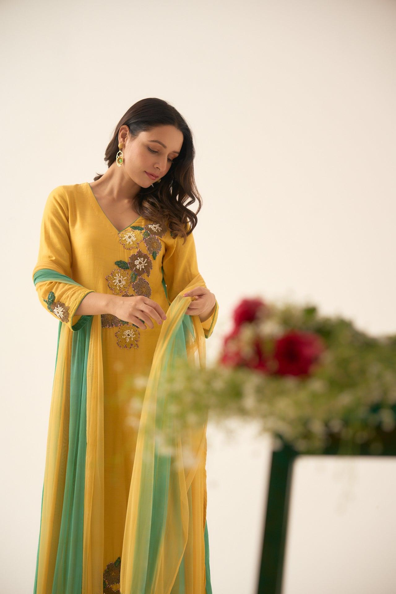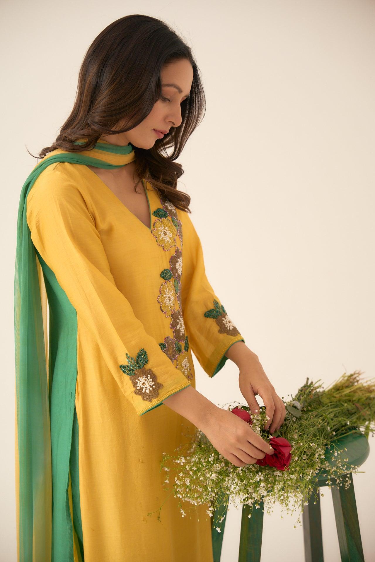 Lemon Grass Chanderi Suit Set is an Hand Crafted suit set in two colours, yellow front and sleeves with green back and pants. The Floral motifs make this beauty a masterpiece with intricate hand details, stunningly artful and elegant, your take on your office parties, family gatherings, friends terrace parties.