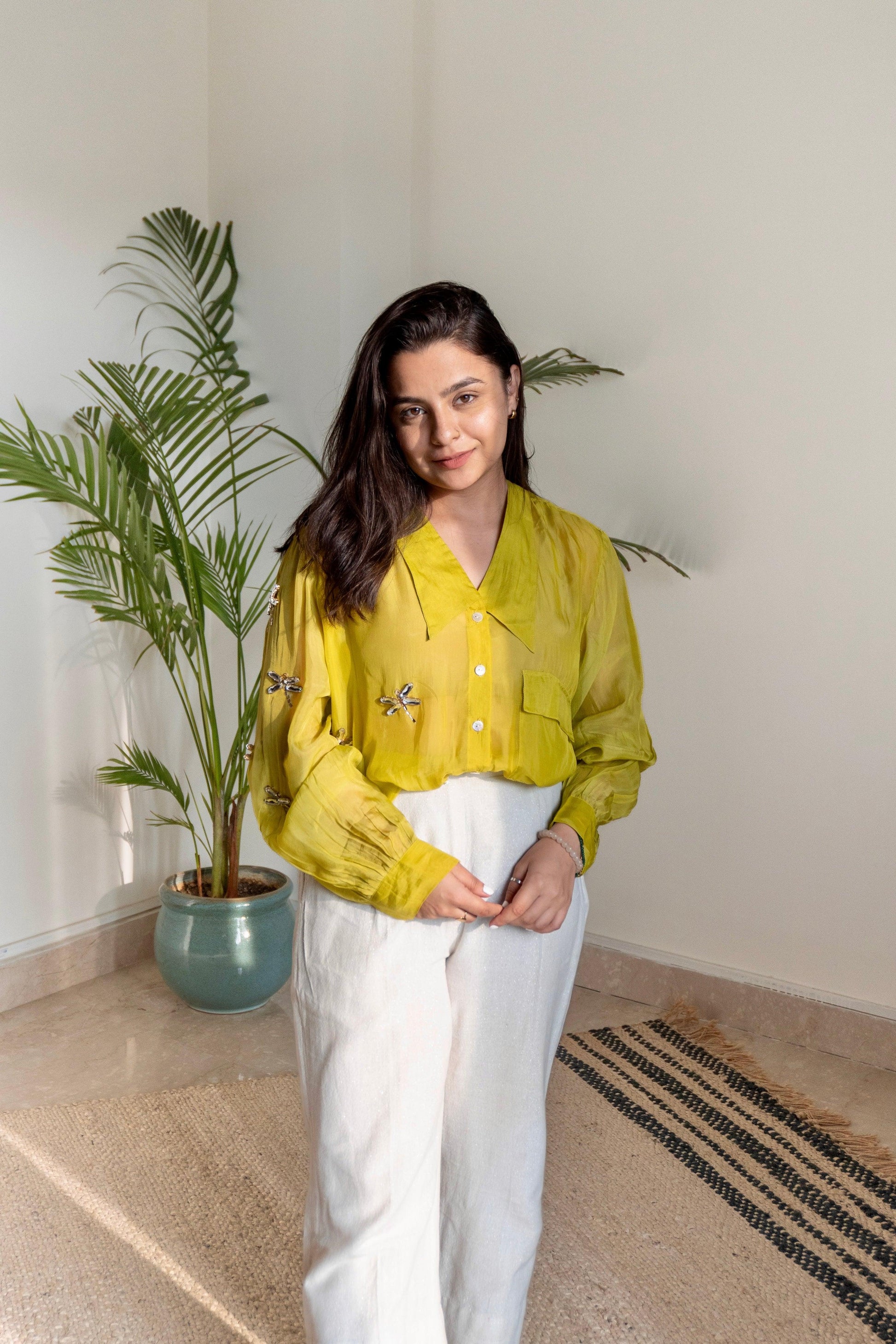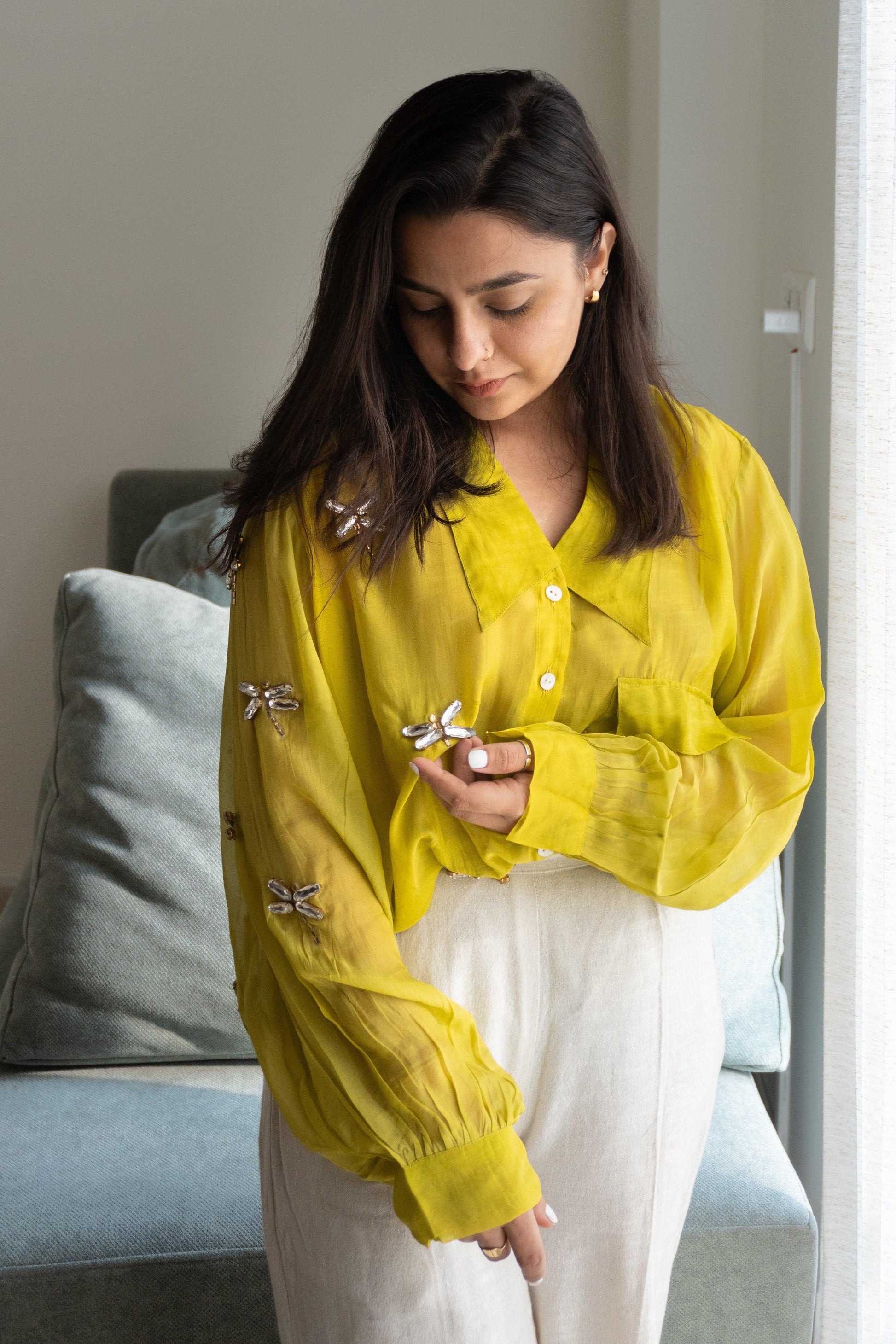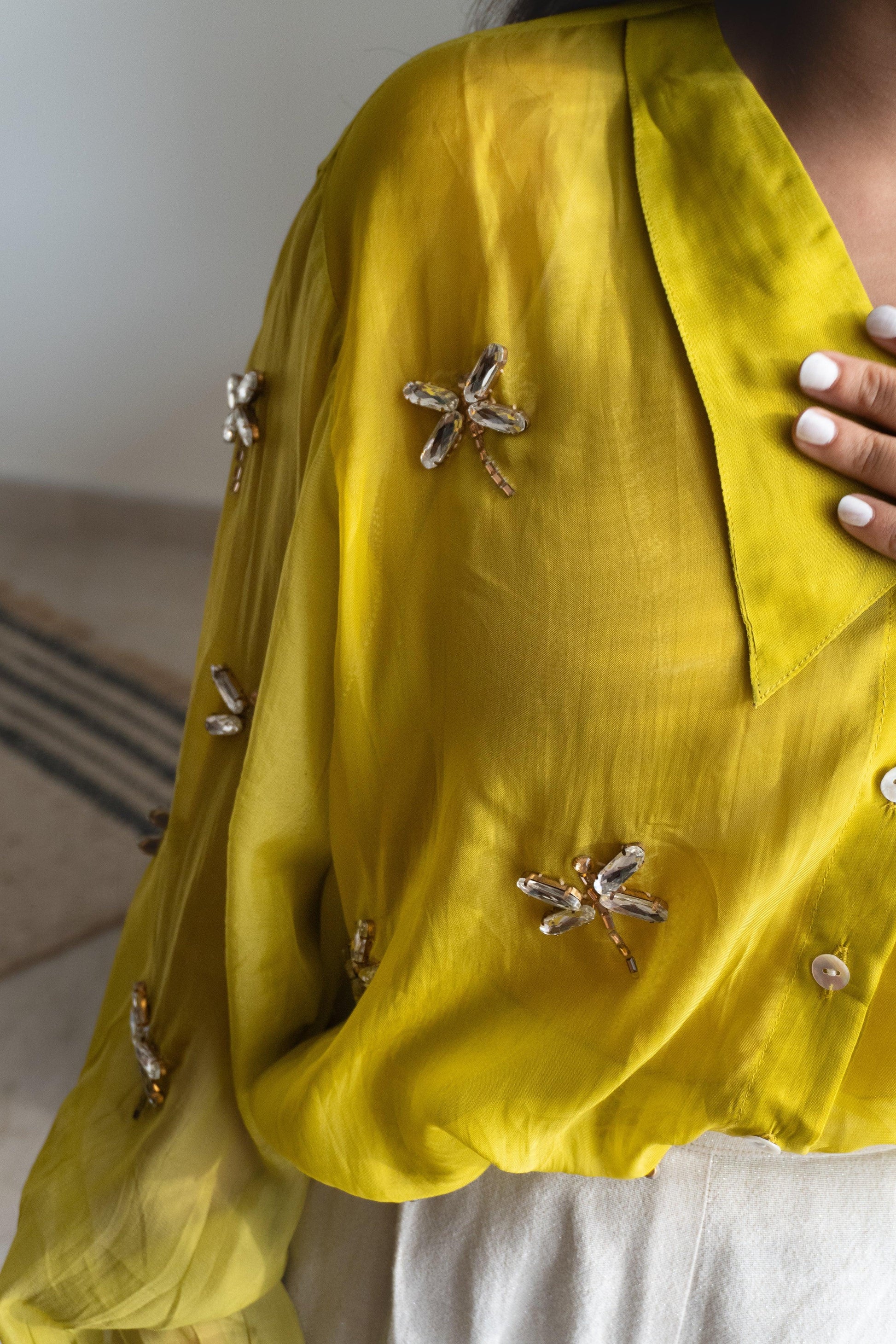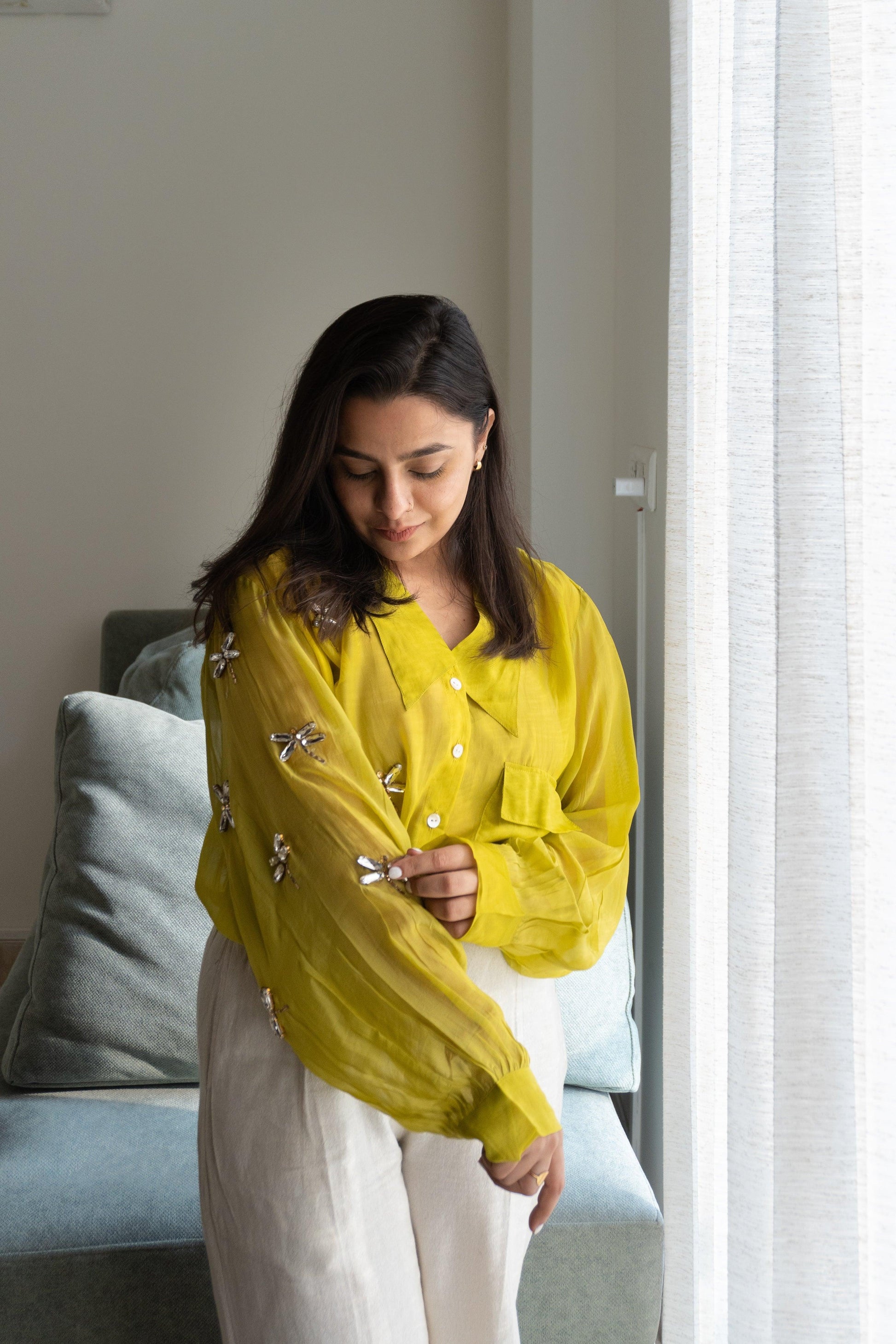 Our Lime me Dragon ‘organza’ Shirt with dragon fly kundan motifs on one side of the shirt, with sea shell buttons and an Uber cool slim collar, is a perfection made in divine.