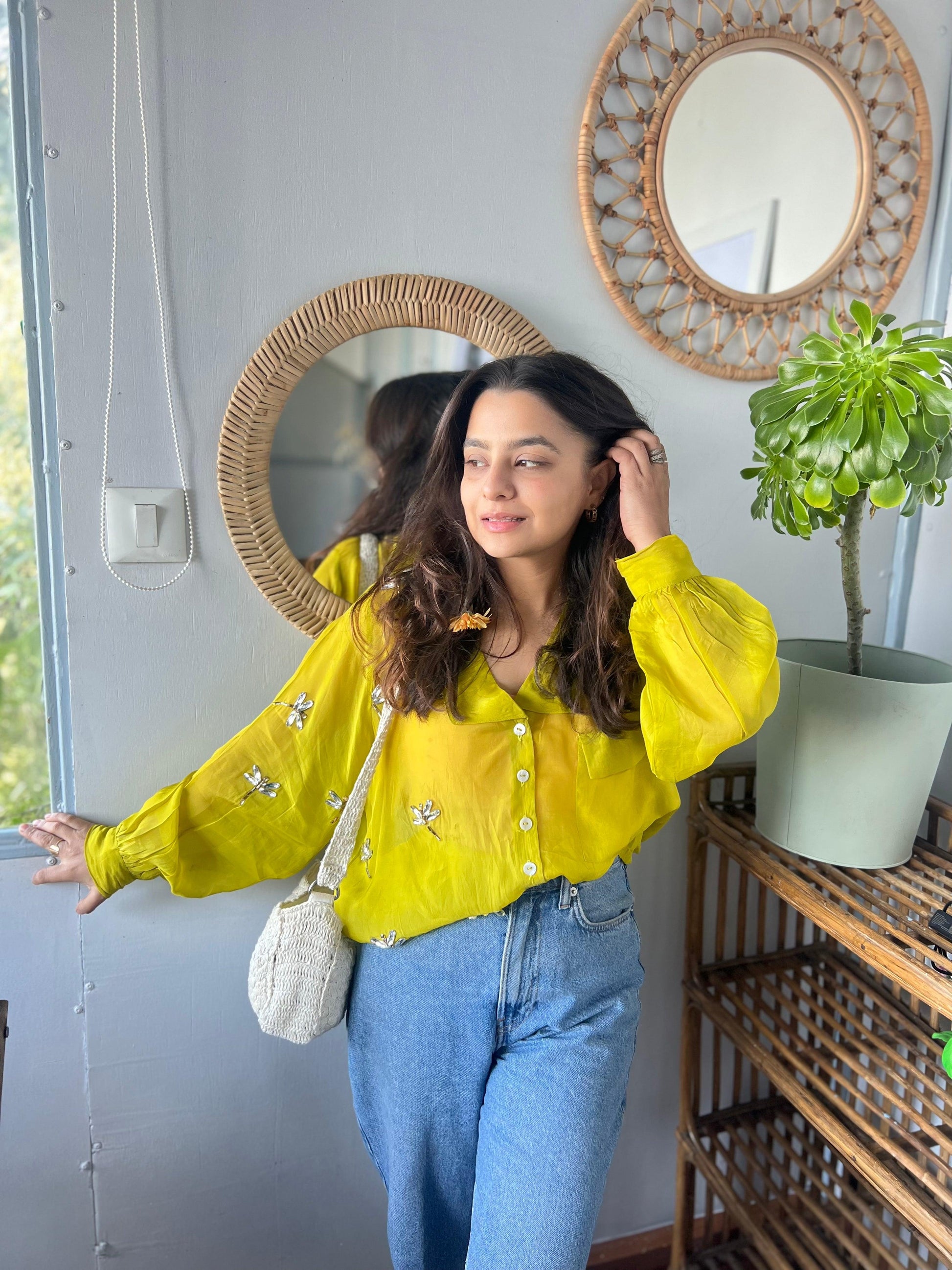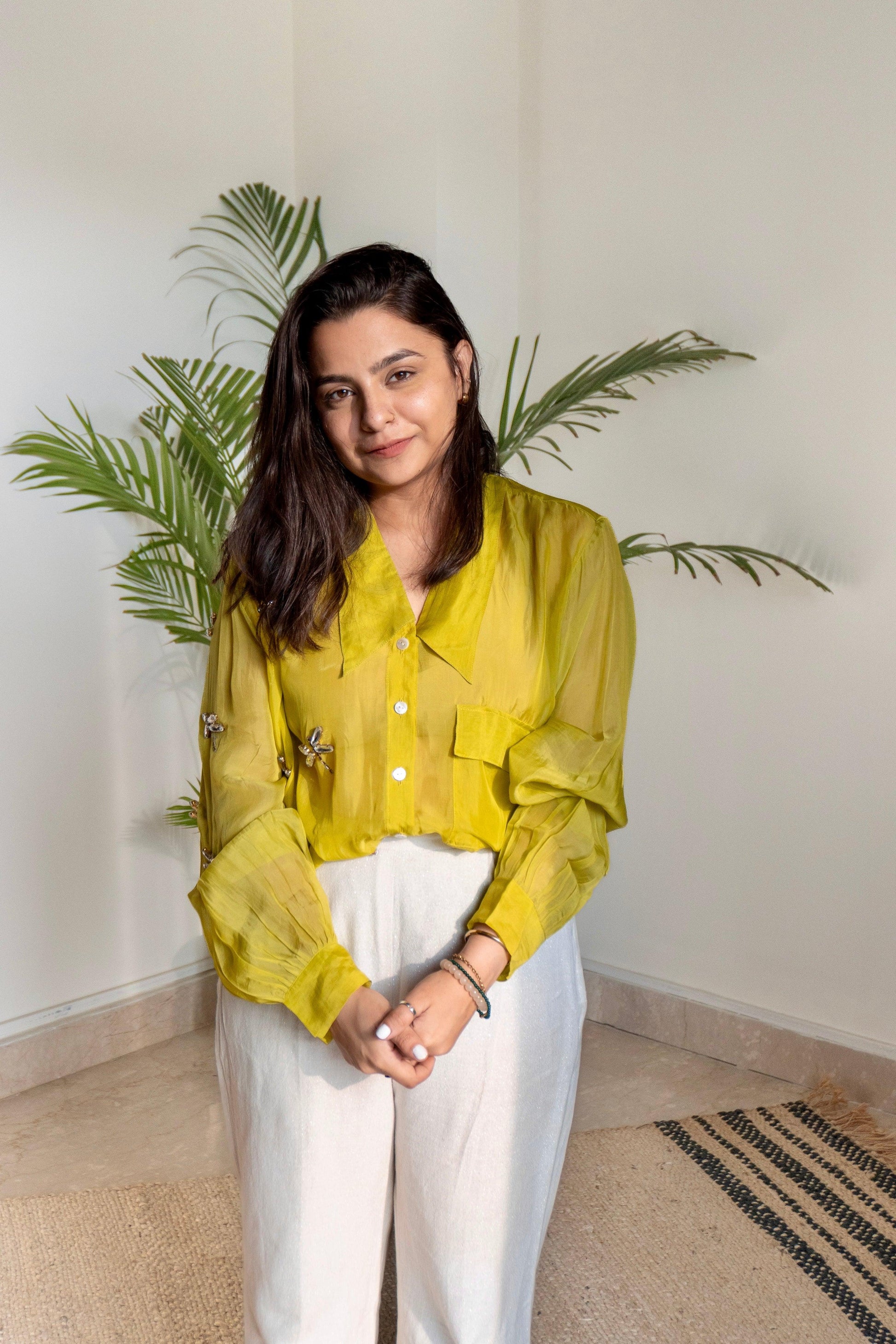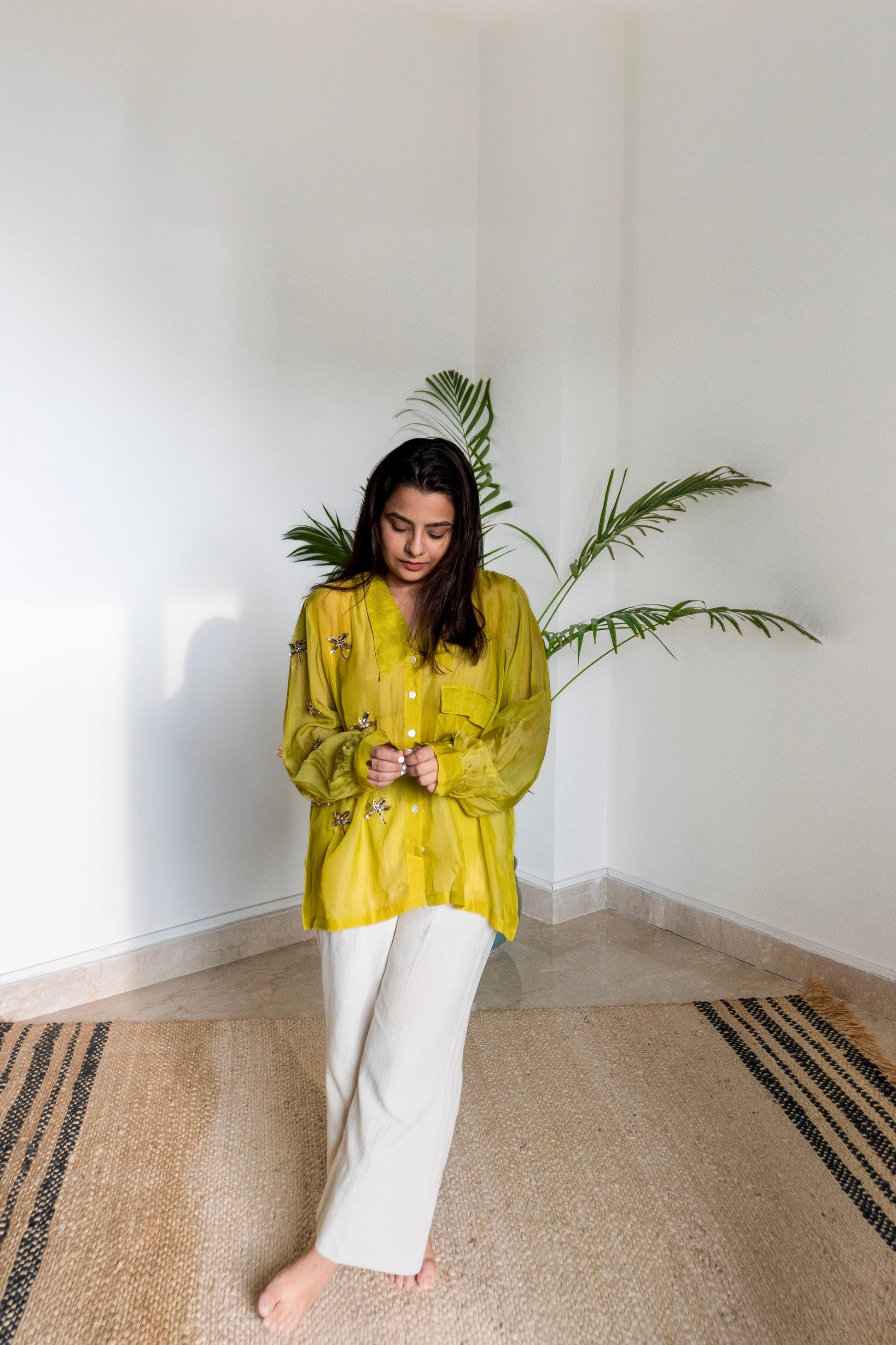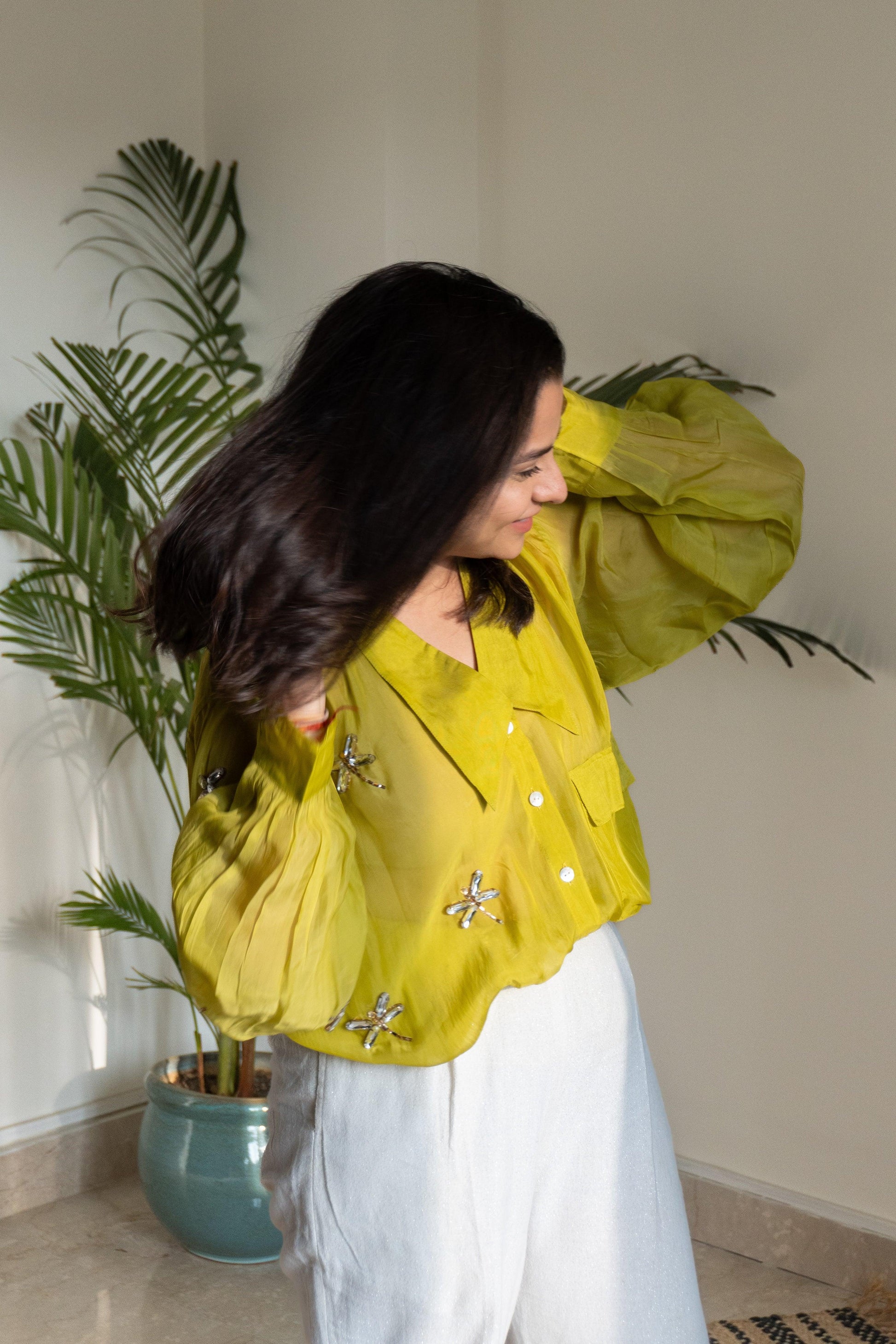 Our Lime me Dragon ‘organza’ Shirt with dragon fly kundan motifs on one side of the shirt, with sea shell buttons and an Uber cool slim collar, is a perfection made in divine.