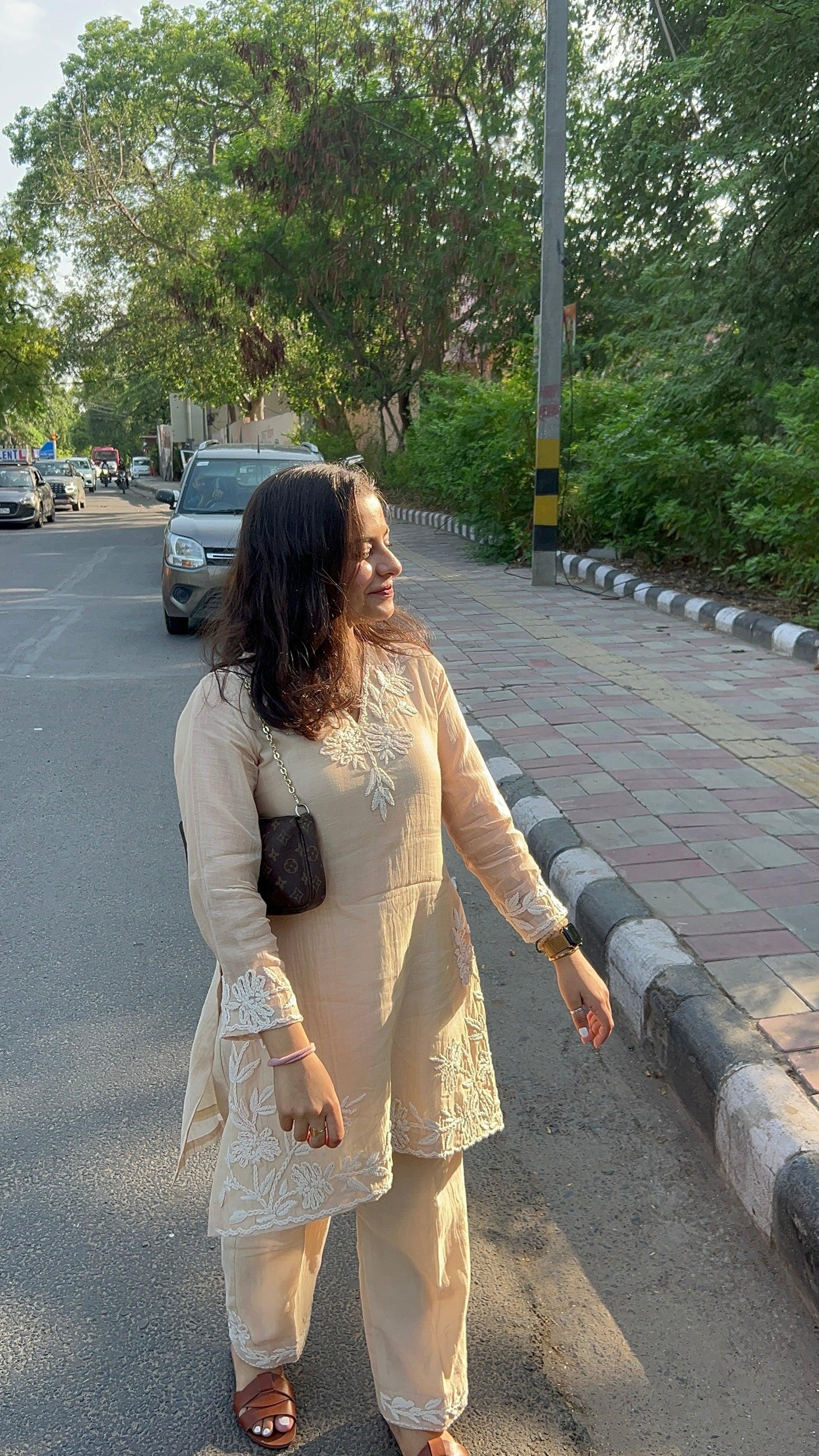 This Mul Chanderi set was made in the finest bengal Chanderi with fine threads of mul weaved in, the thread embroidery you see has been made with 100% pure cotton double thread, that Aari work so fine, made in house very intrigued to give you a feel no other ready to wear pieces can ever do.