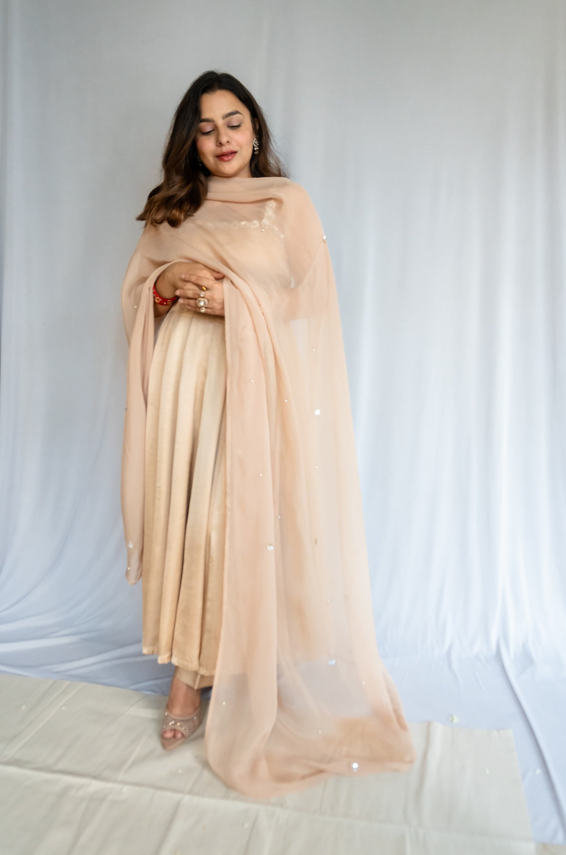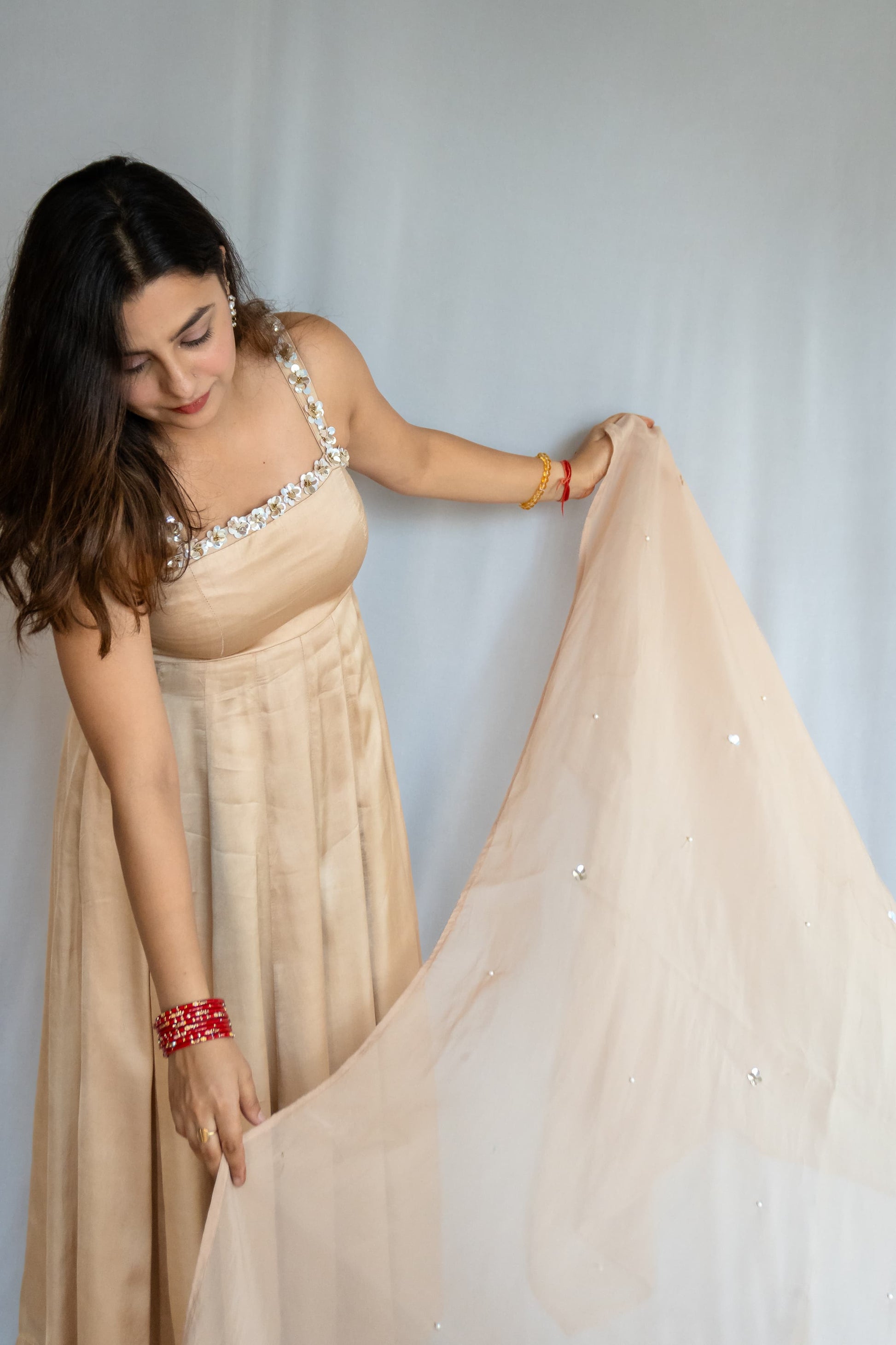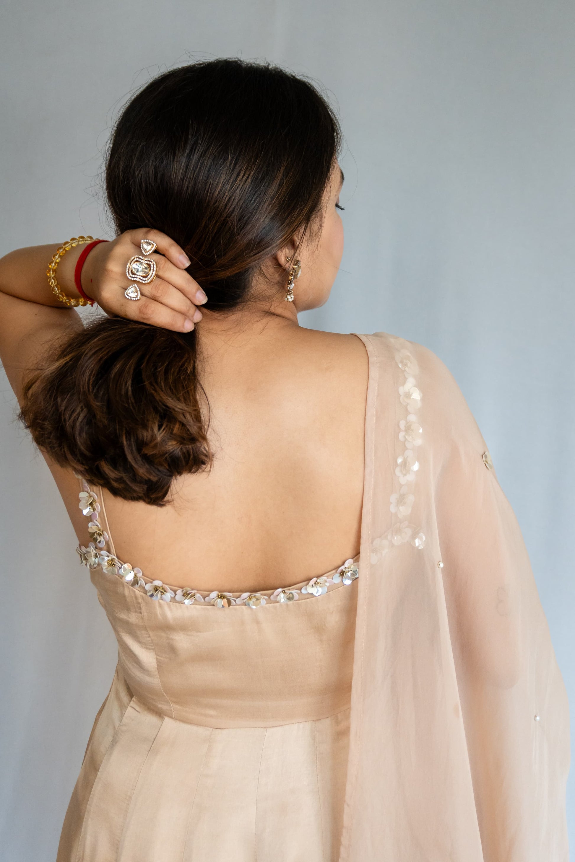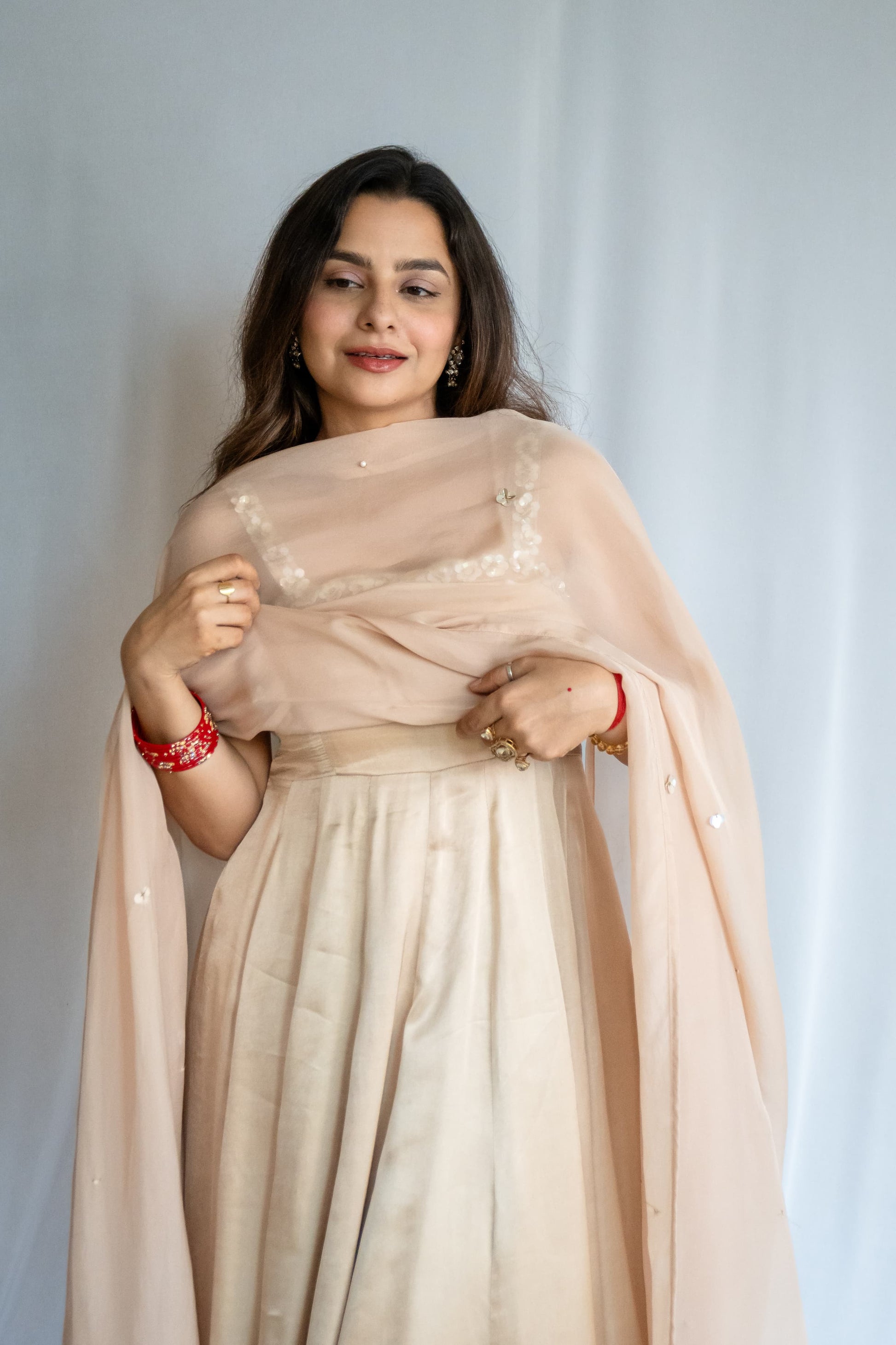 This outfit is a quiet ode to the hauntingly beautiful landscapes of Ladakh — inspired by its sunlit, deserted mountains and the endless silence that stretches across its rocky terrains. The muted beige hue mirrors the arid yet powerful tones of Ladakh’s high-altitude desert, where the mountains stand bare and vast, soaked in golden light. From the moment this silhouette was imagined, the intention was clear: to translate that sense of infinity one feels while standing at a high pass, looking out at uninterrupted earth and sky.