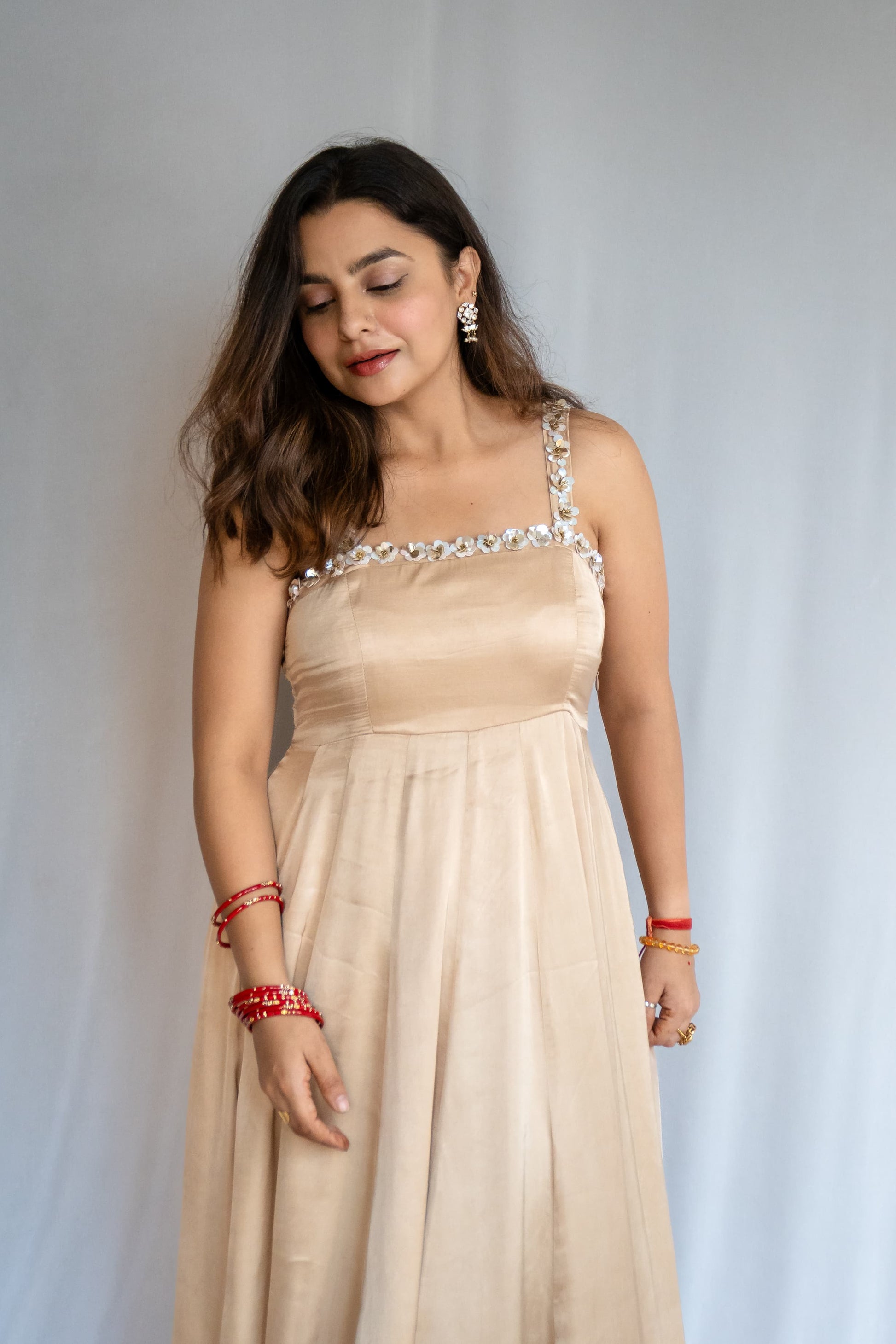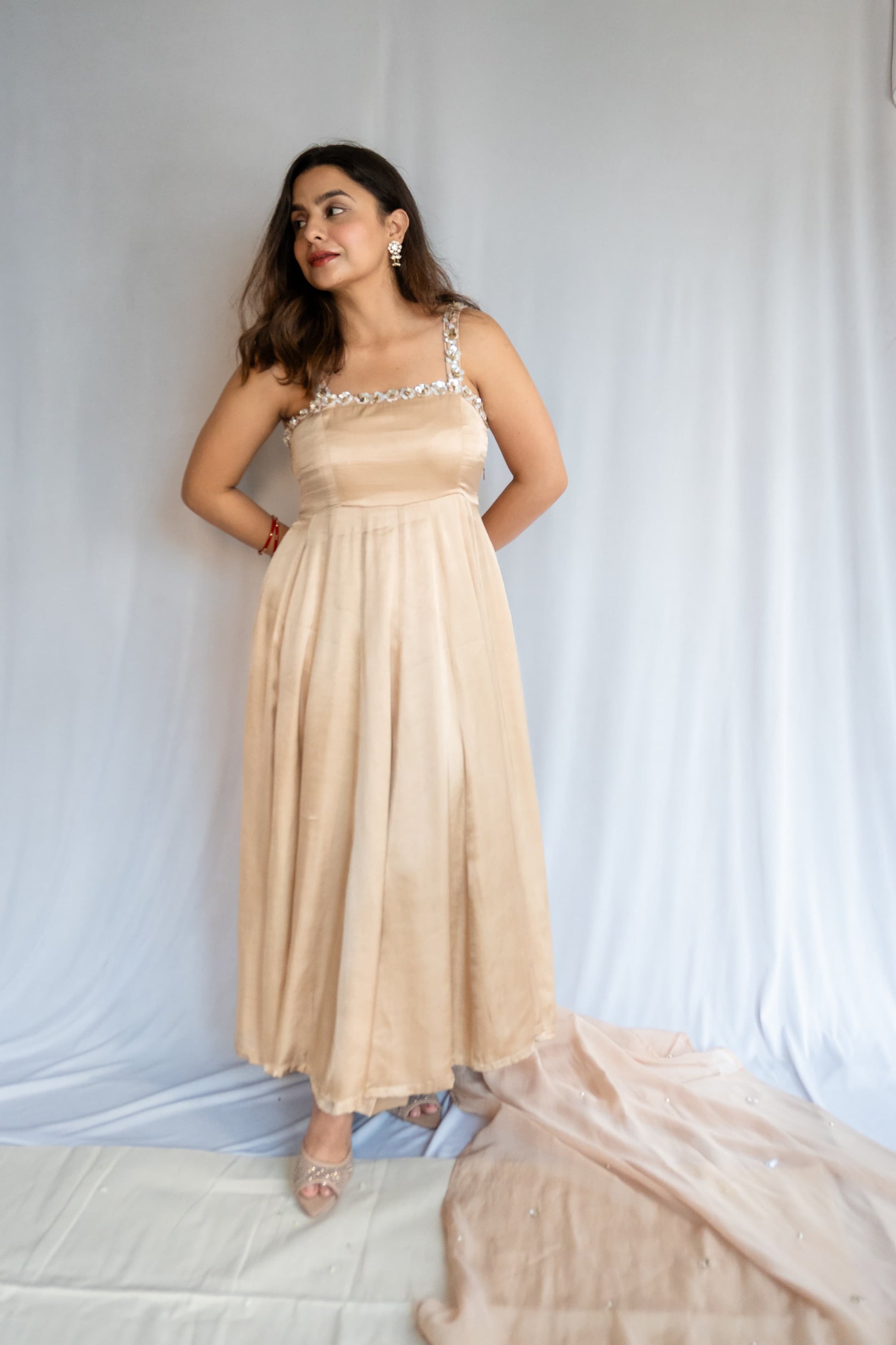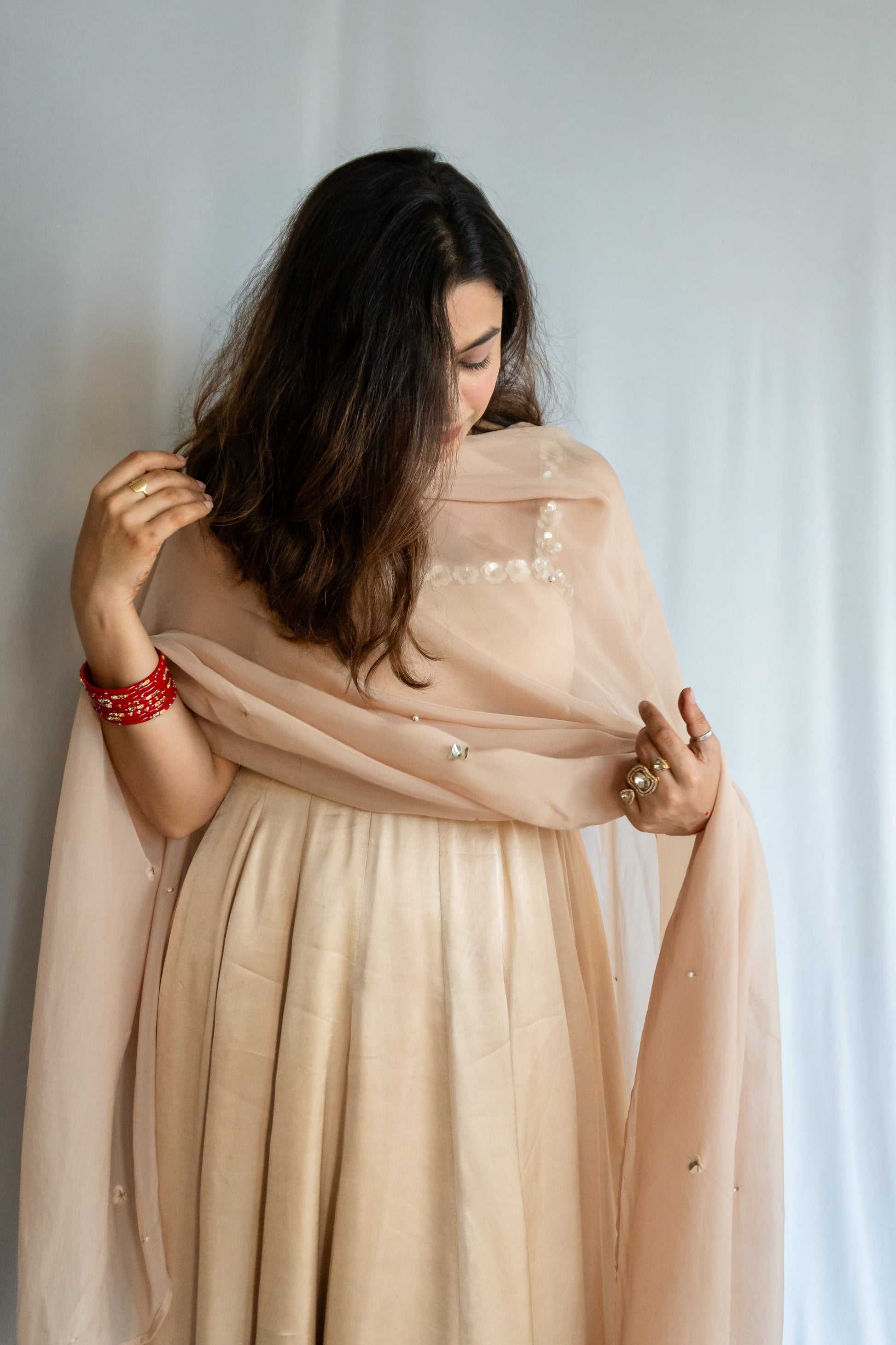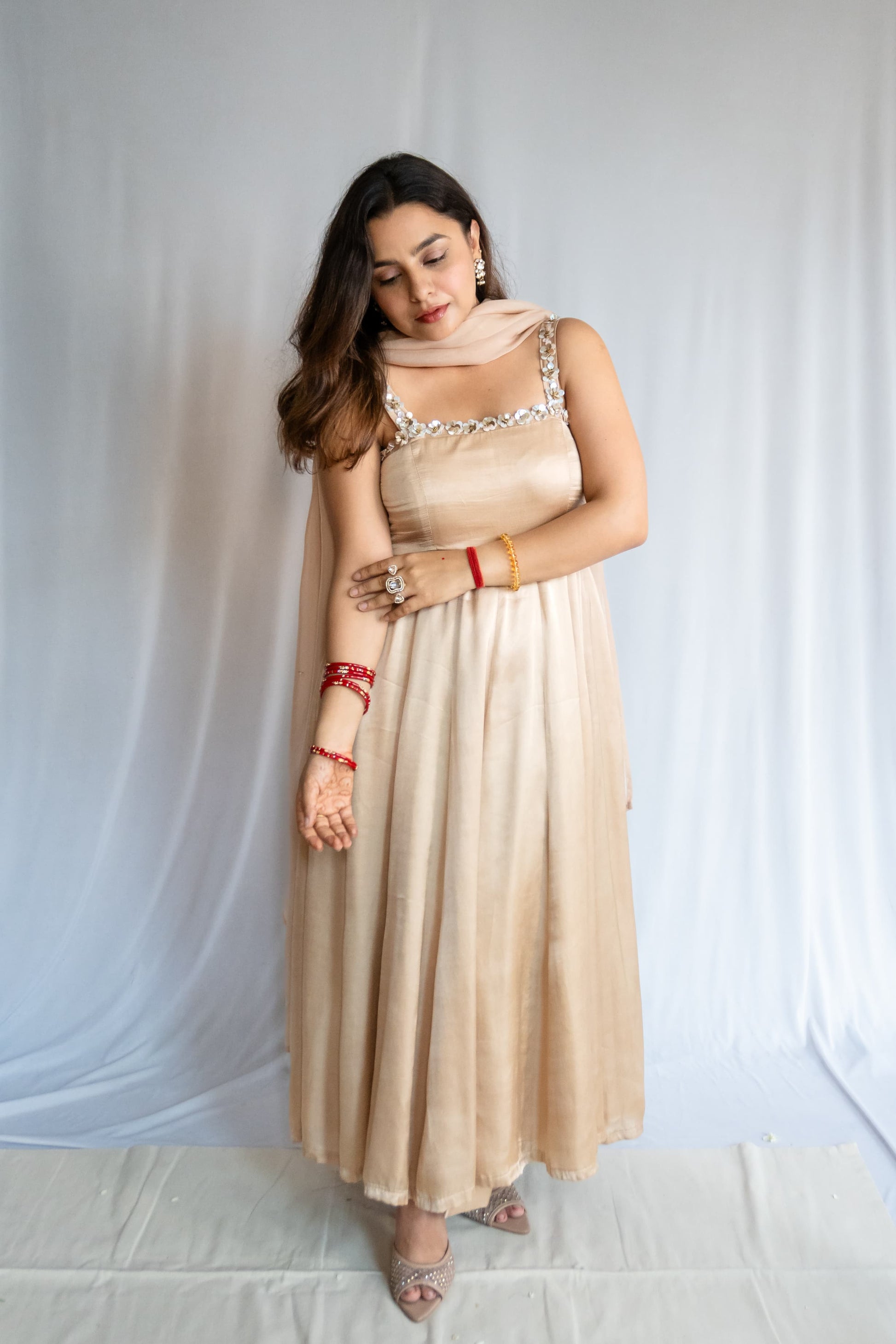 This outfit is a quiet ode to the hauntingly beautiful landscapes of Ladakh — inspired by its sunlit, deserted mountains and the endless silence that stretches across its rocky terrains. The muted beige hue mirrors the arid yet powerful tones of Ladakh’s high-altitude desert, where the mountains stand bare and vast, soaked in golden light. From the moment this silhouette was imagined, the intention was clear: to translate that sense of infinity one feels while standing at a high pass, looking out at uninterrupted earth and sky.