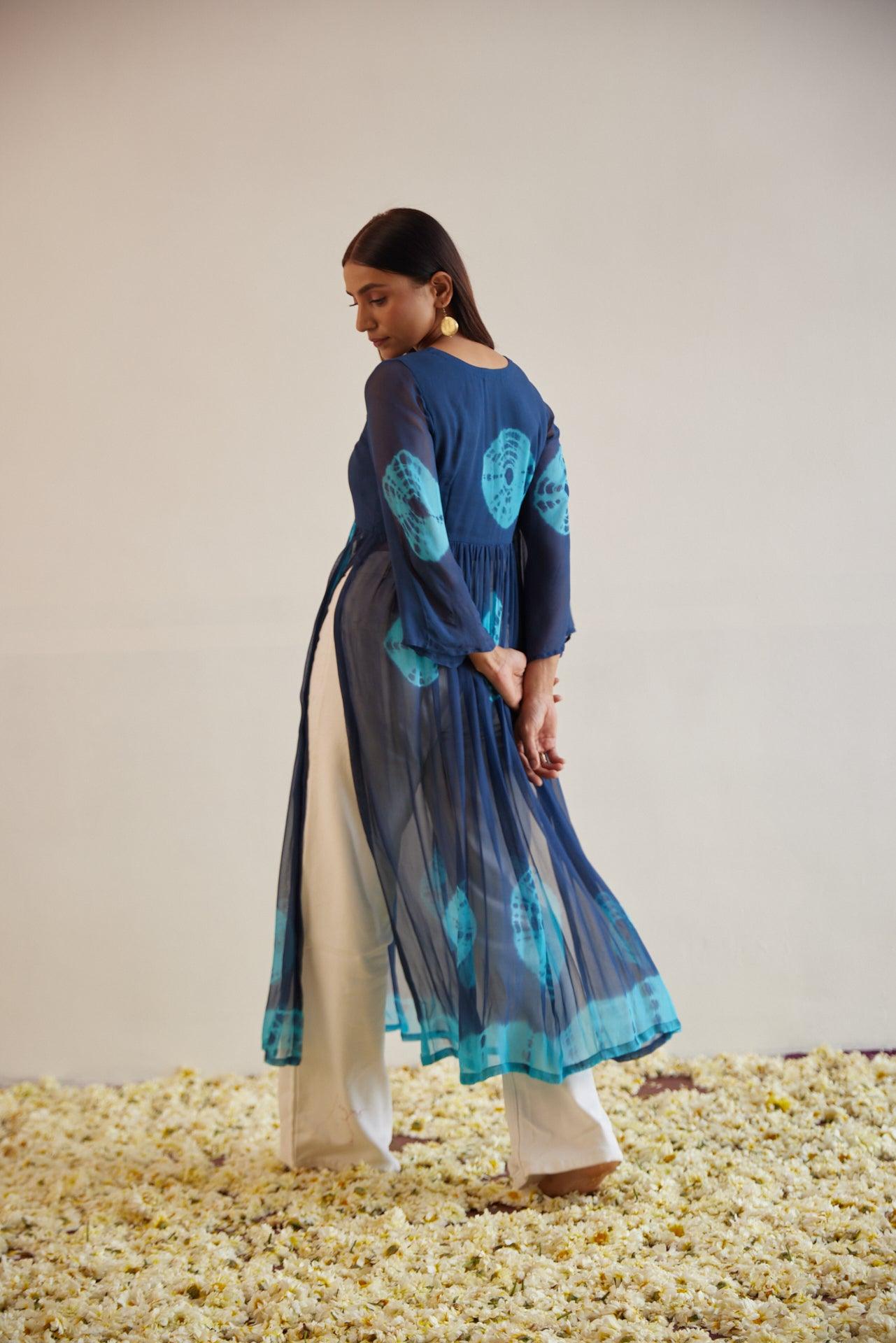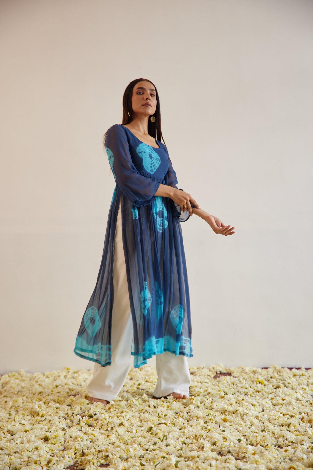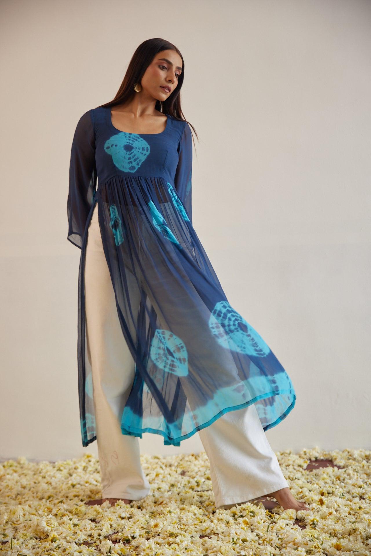 Neel Gagan kurta set, which blend of hand dying circles and a hand dying Shibhori in the ends, sleeves talk of umbrella detailed hands, neck being a broader U would be loved by you all for sure. Delicately dyed in two colours will make you in awe of how well did we do it.