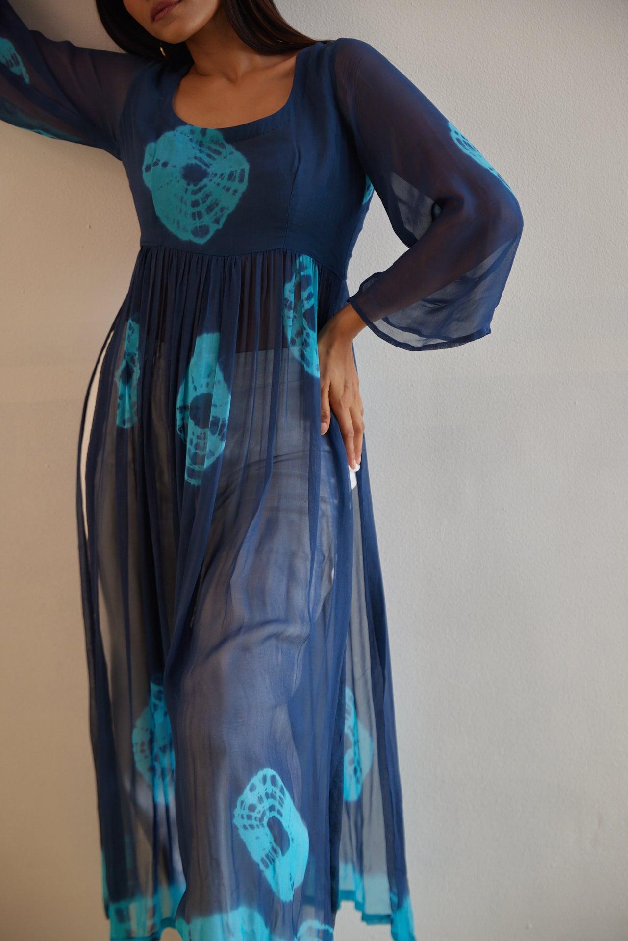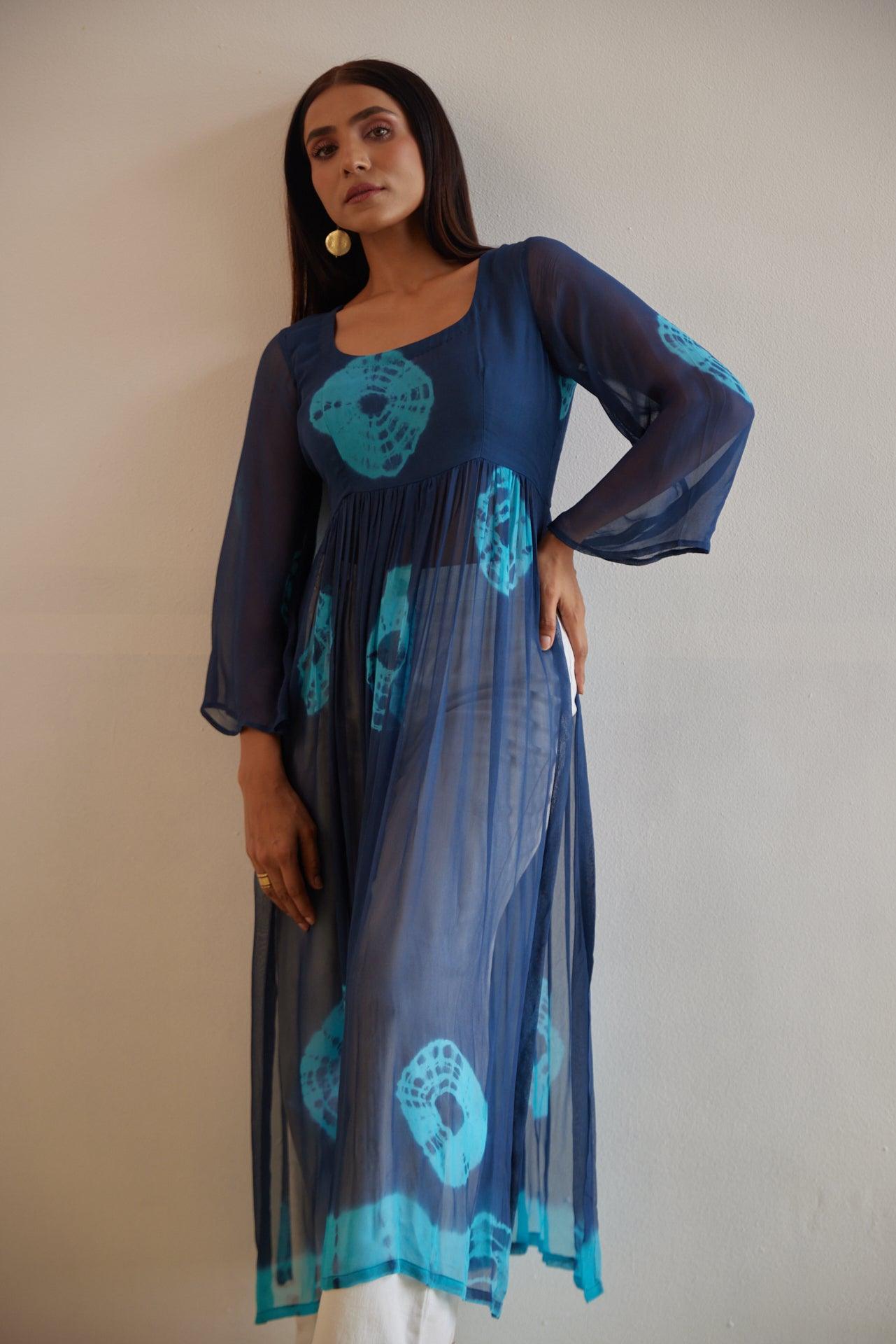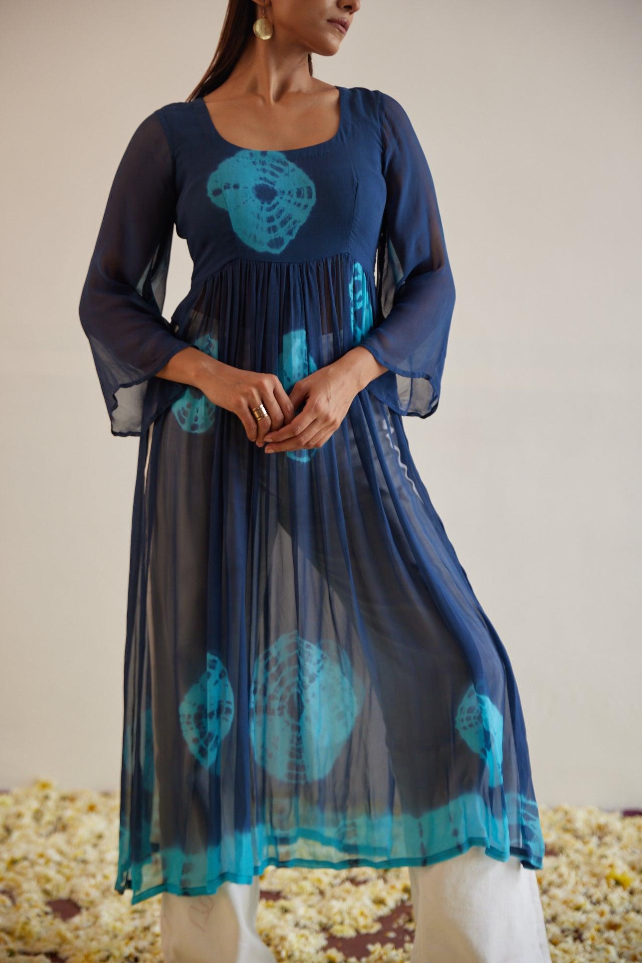 Neel Gagan kurta set, which blend of hand dying circles and a hand dying Shibhori in the ends, sleeves talk of umbrella detailed hands, neck being a broader U would be loved by you all for sure. Delicately dyed in two colours will make you in awe of how well did we do it.