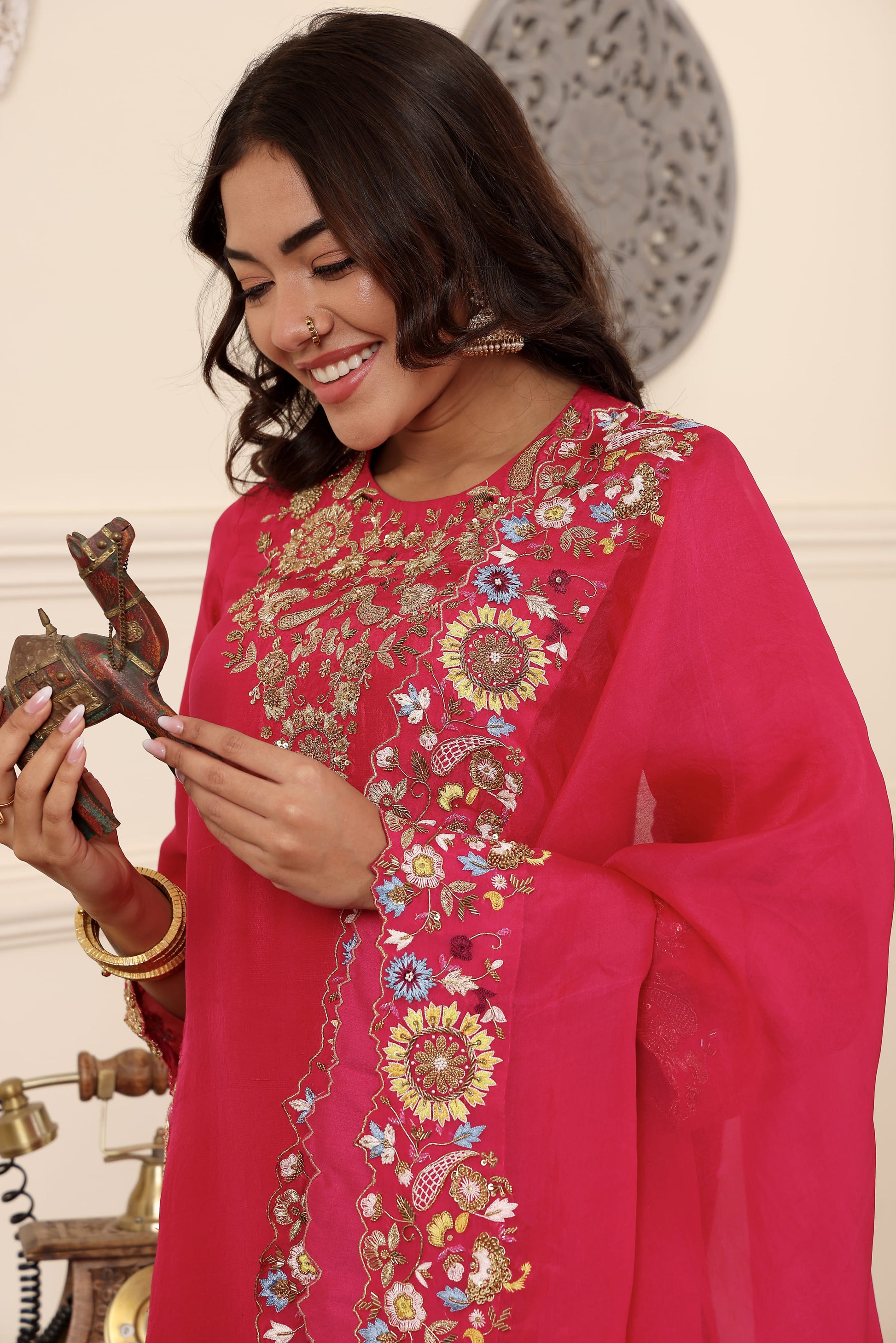 Taking over 80 hours of skilled handwork and incorporating 8 intricate embroidery techniques, this designer suit is a celebration of traditional artistry. The deep fuchsia pink shade enhances its regal charm, while intricate Dabka, Aari, pearl, and jaal embroidery add stunning depth and dimension. Each detail reflects exceptional threadwork, ensuring that you radiate sophistication and elegance effortlessly.