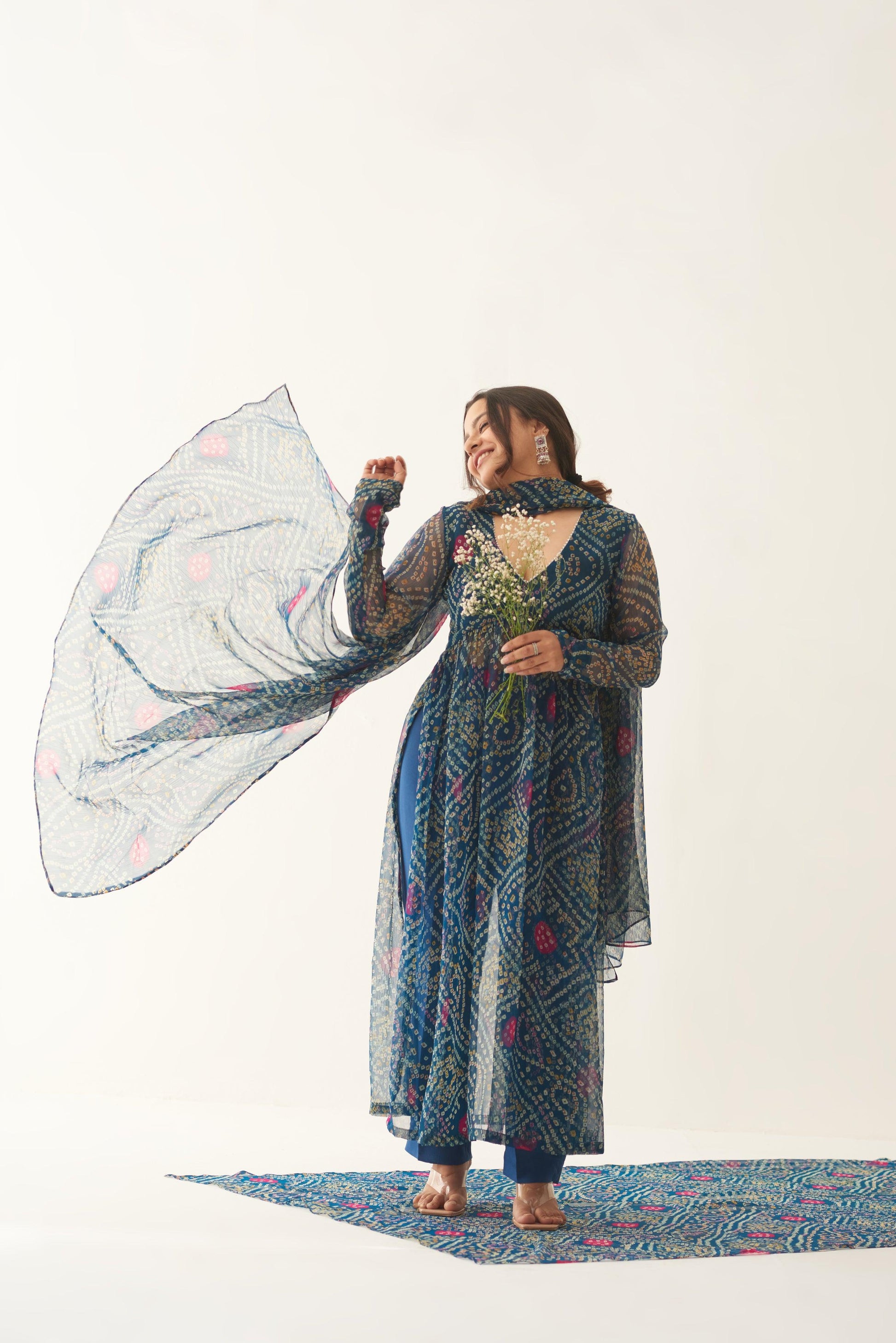 Peacock Bandhani is a three piece set, which is a blend of chiffon, Bandhani is an art piece from the western India and the tying and dying technique lives in even today. This popular art form stays alive in the form of these silhouettes, we absolutely love