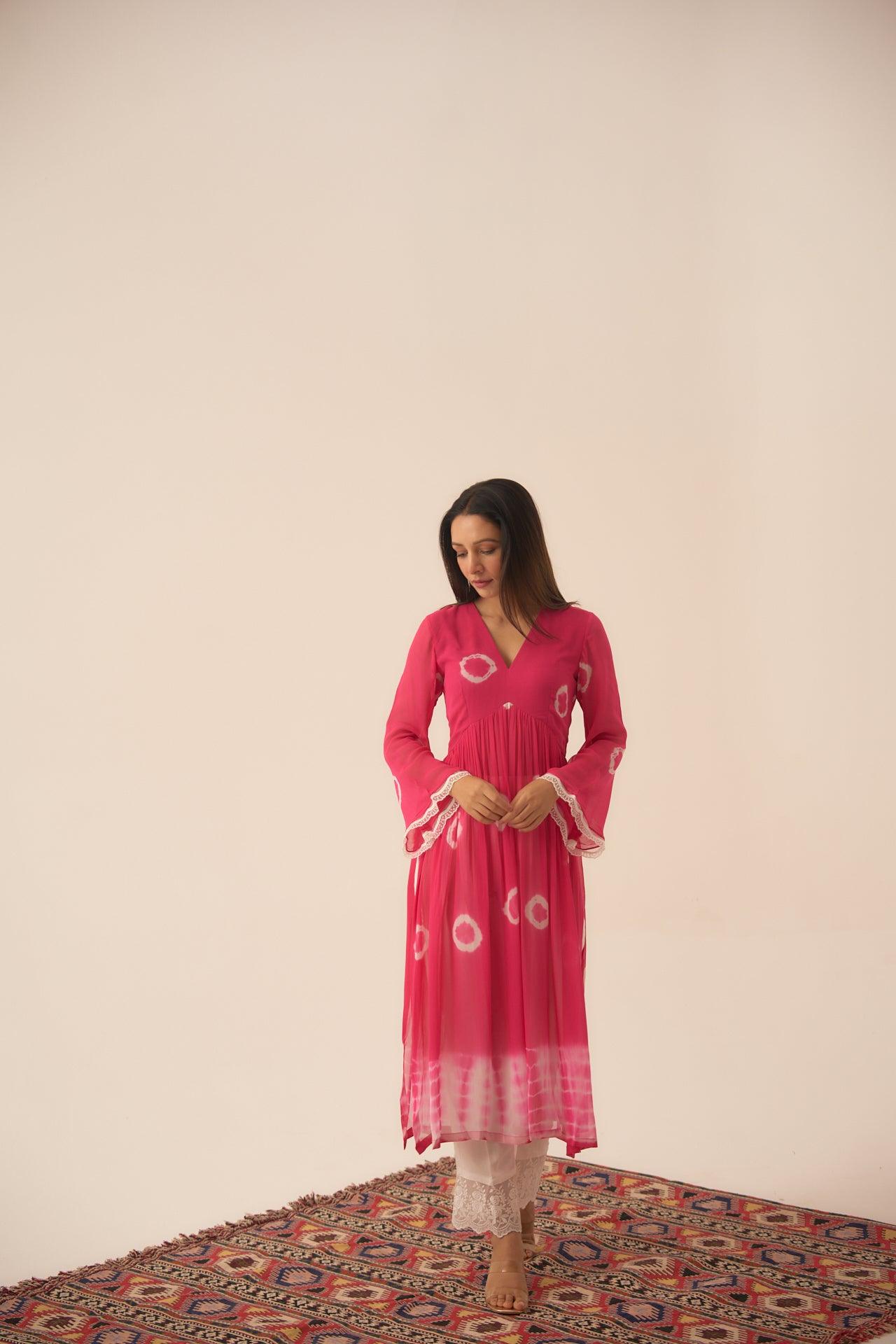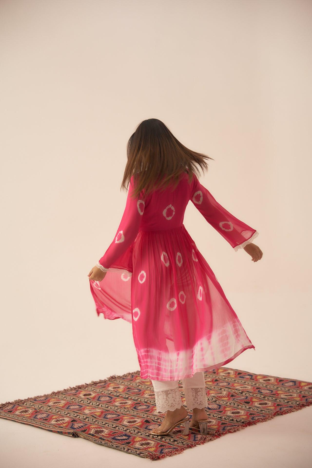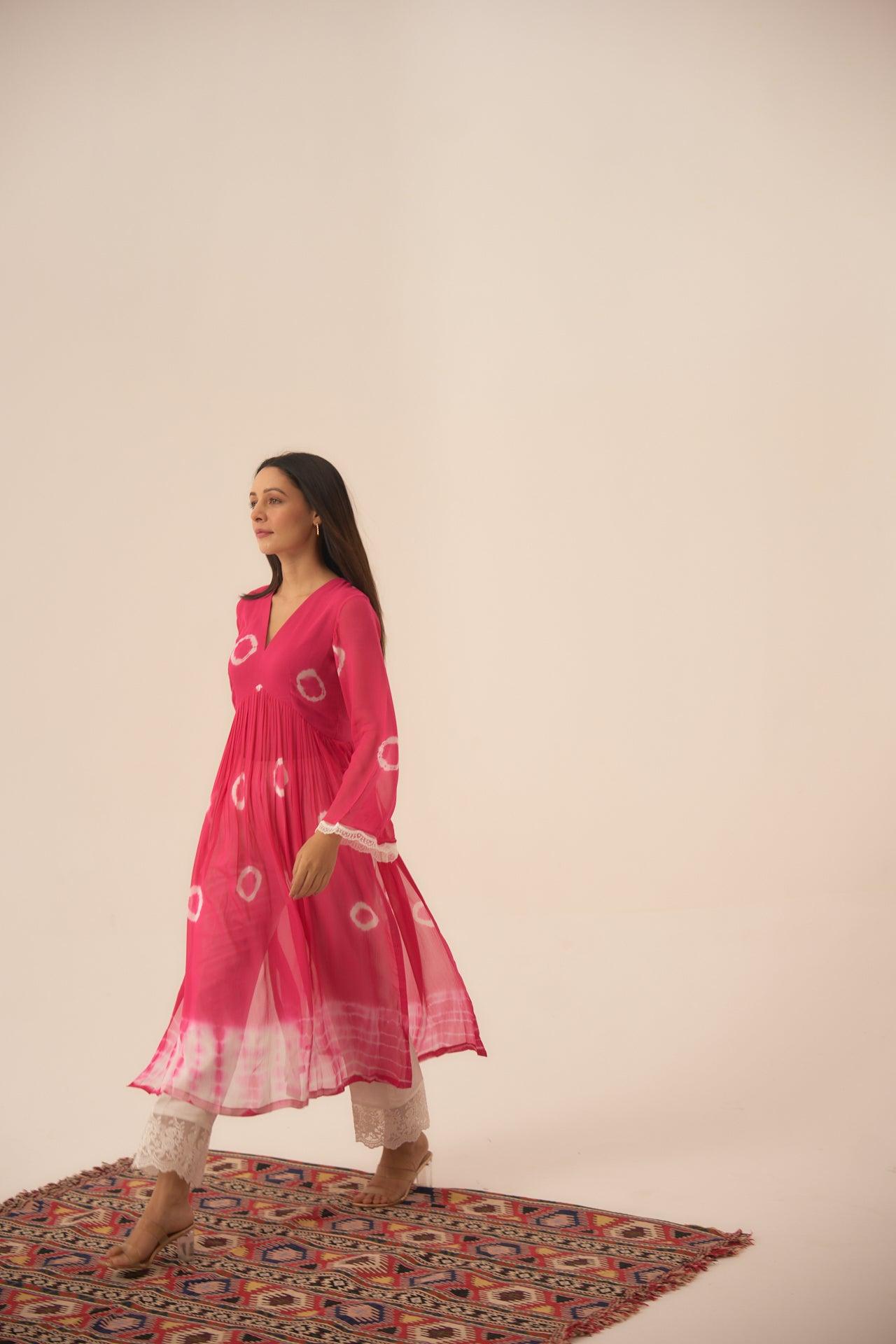 Pearl Rosette is a two piece set, which blend of hand dying circles and a hand dying Shibhori in the ends, sleeves talk of white scalloped detailed hands and the pants with white chikan blended lace, you would absolutely fall in love with the fabric so comfortable and classic.