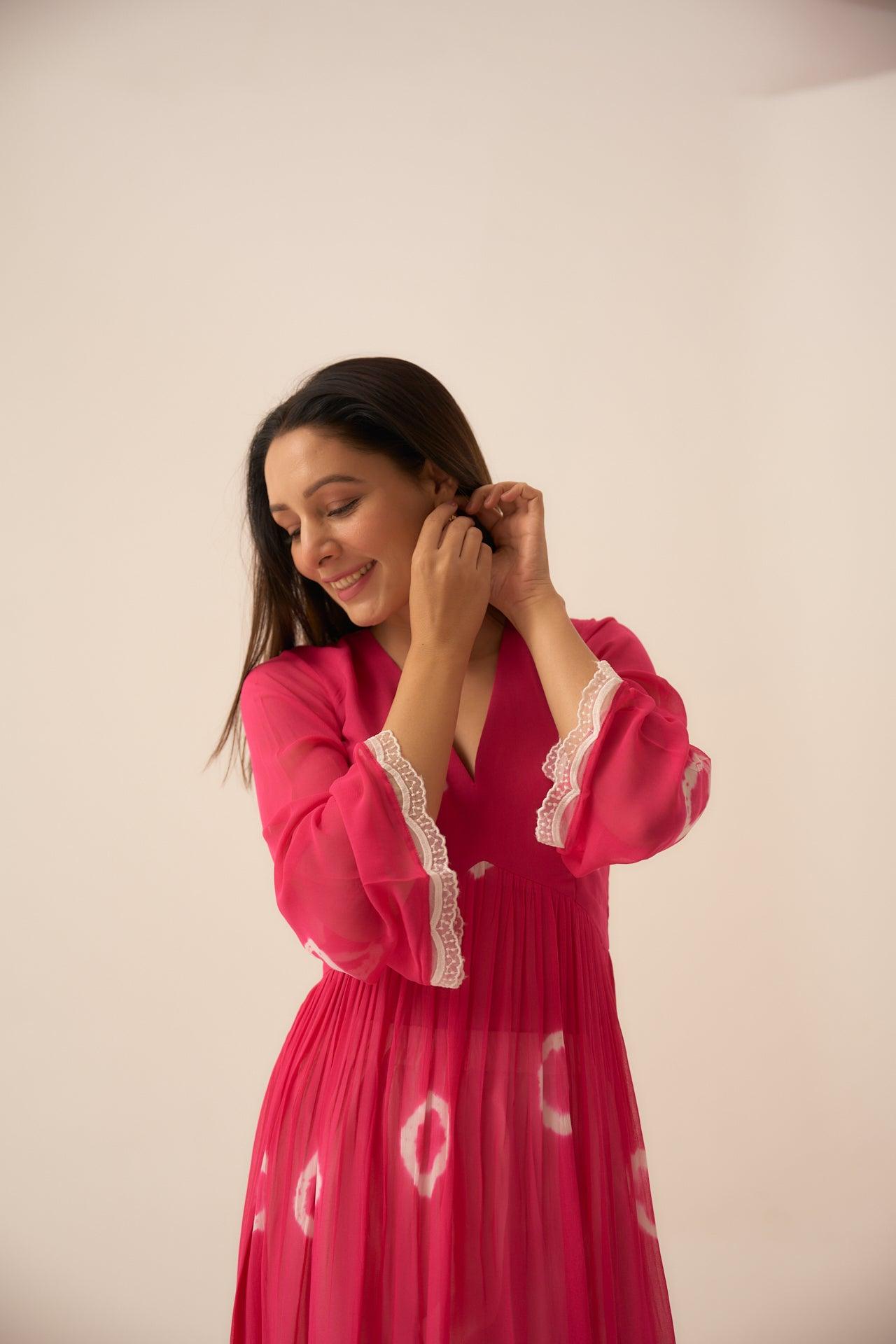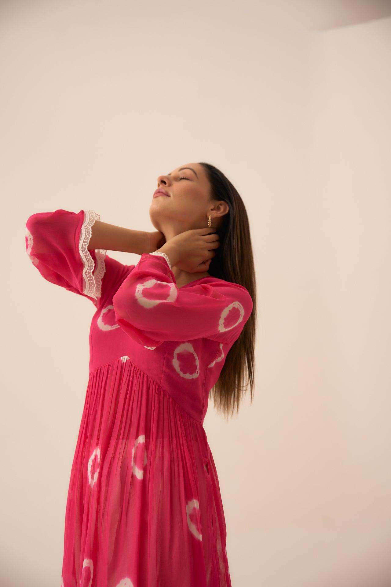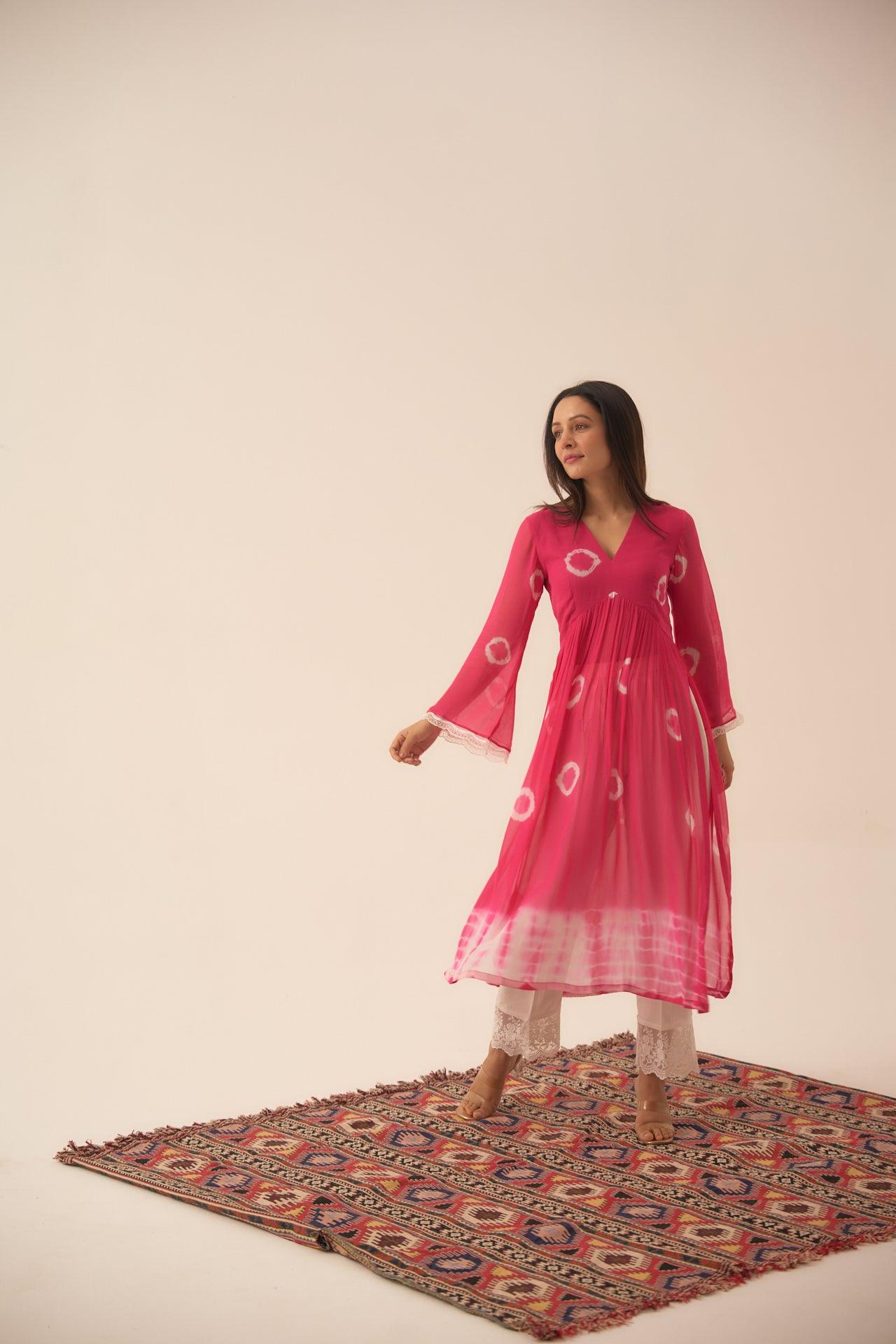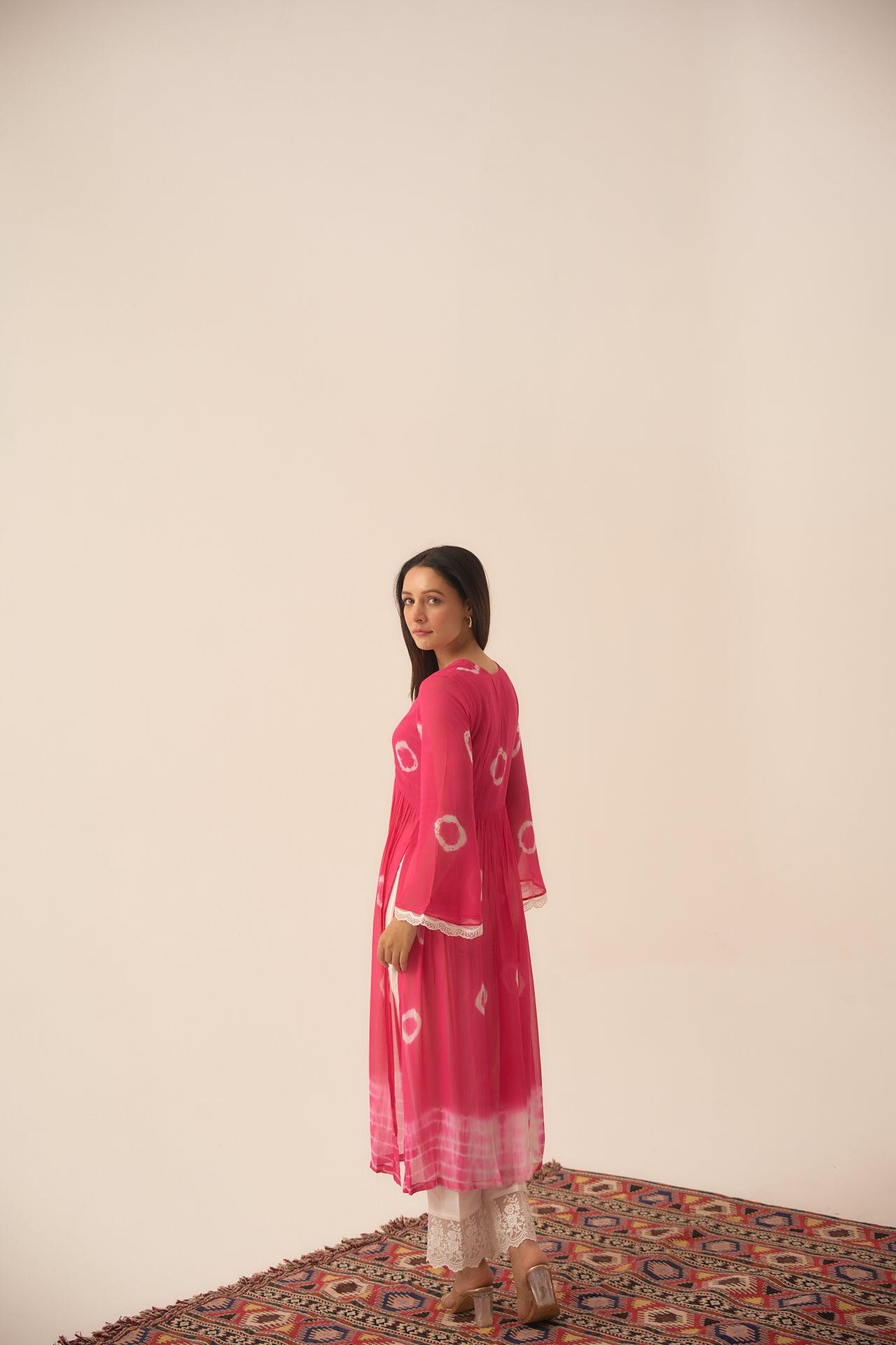 Pearl Rosette is a two piece set, which blend of hand dying circles and a hand dying Shibhori in the ends, sleeves talk of white scalloped detailed hands and the pants with white chikan blended lace, you would absolutely fall in love with the fabric so comfortable and classic.