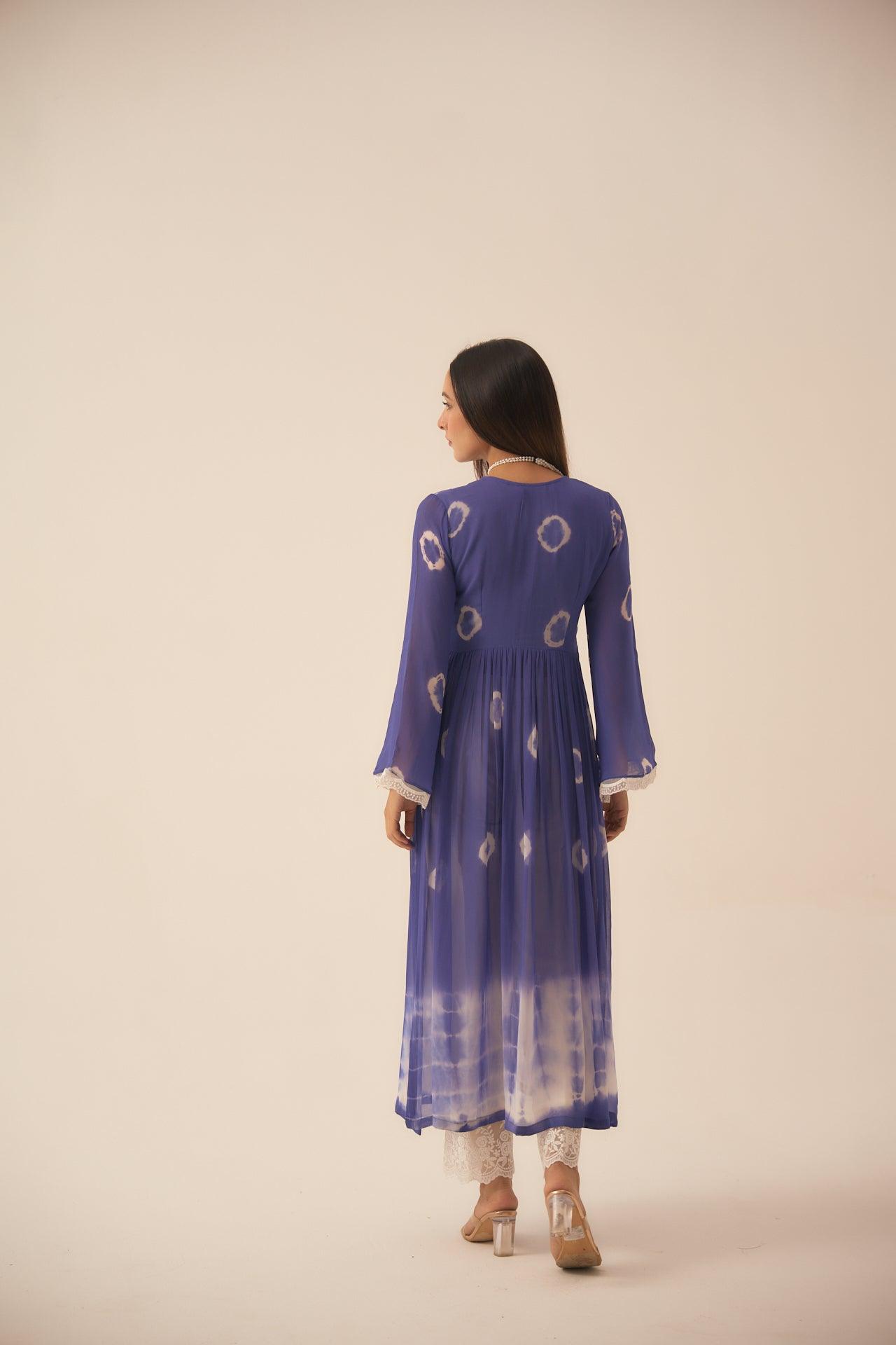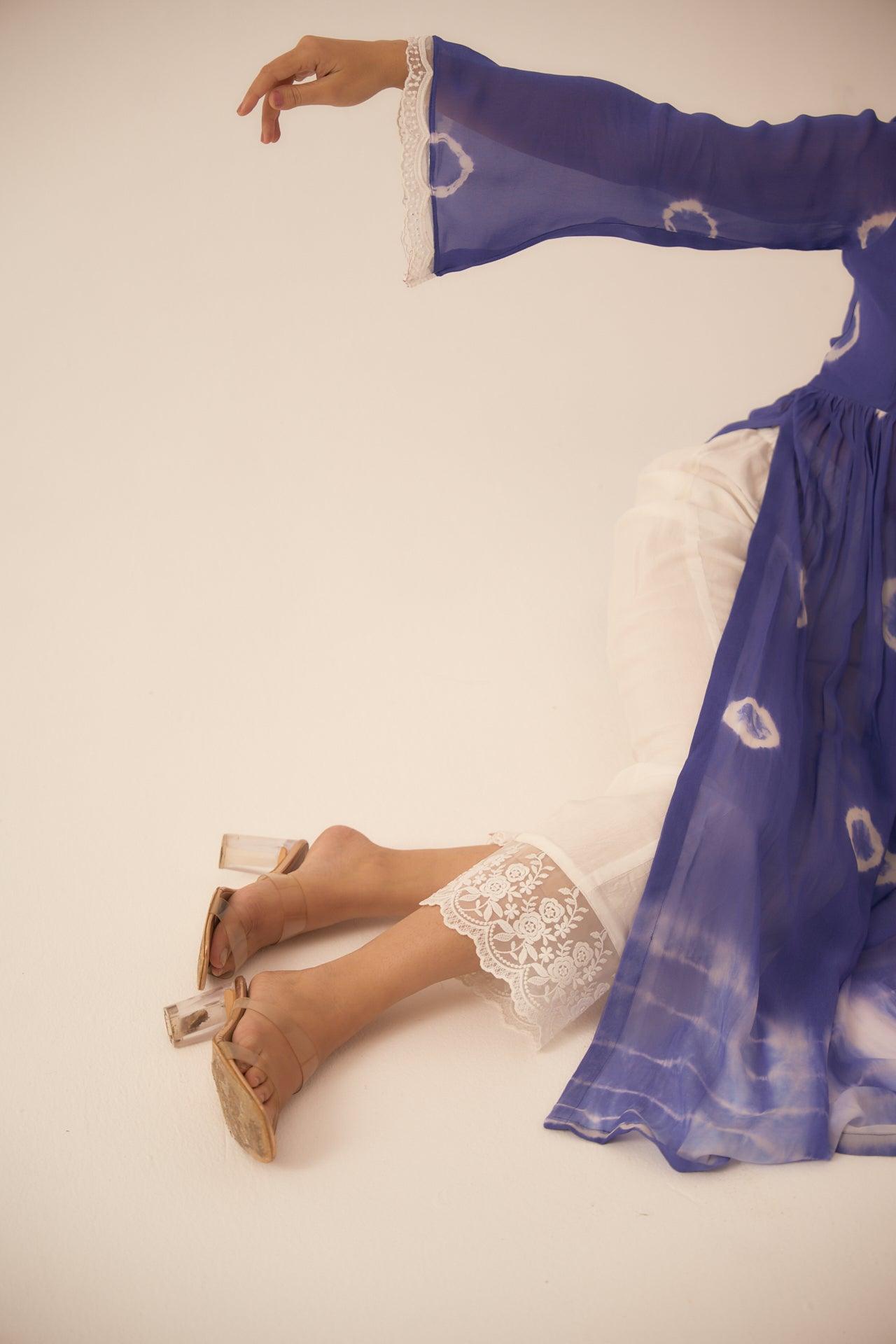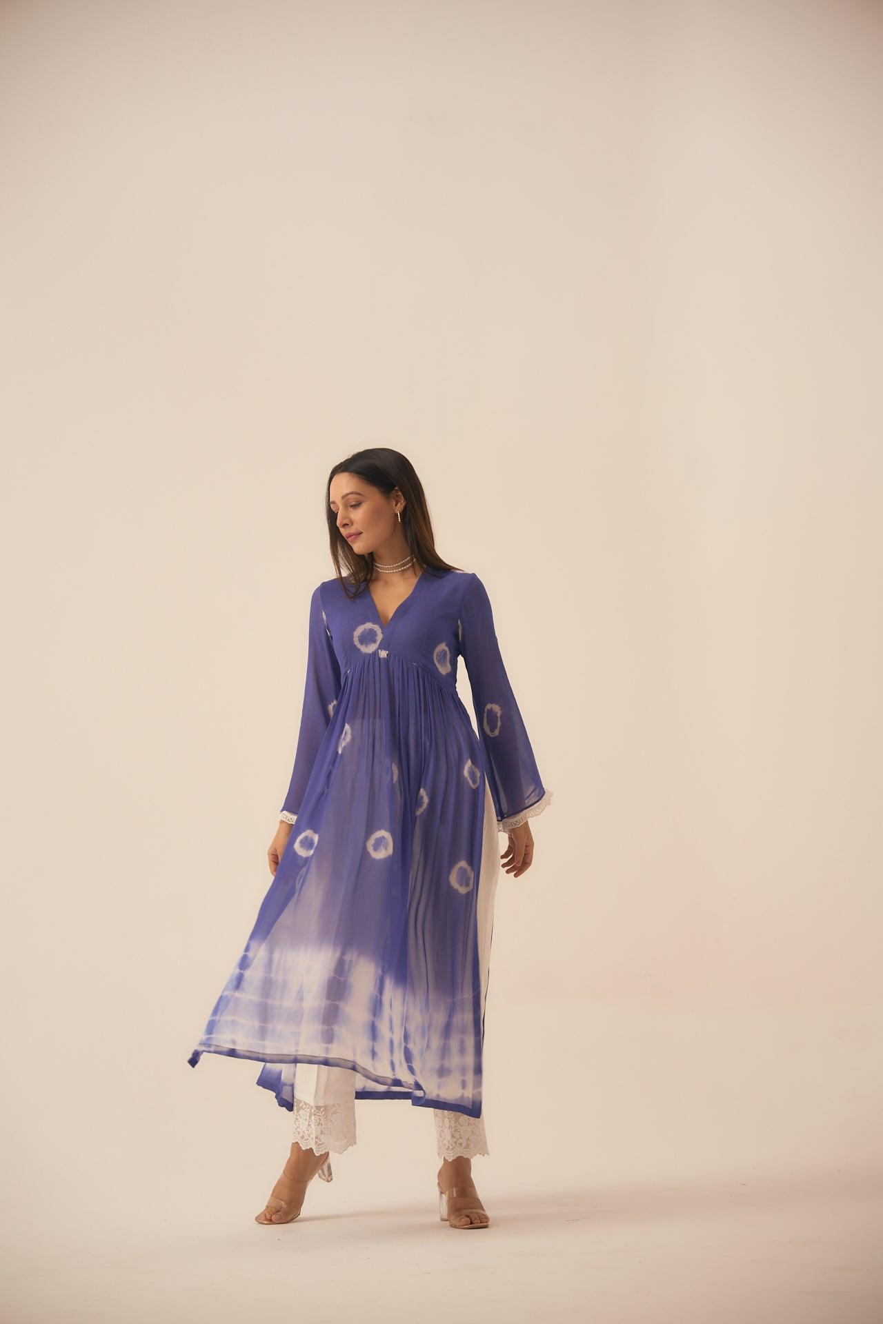 Pearl sapphire set is a two piece set, which blend of hand dying circles and a hand dying Shibhori in the ends, sleeves talk of white scalloped detailed hands and the pants with white chikan blended lace, you would absolutely fall in love with the fabric so comfortable and classic.