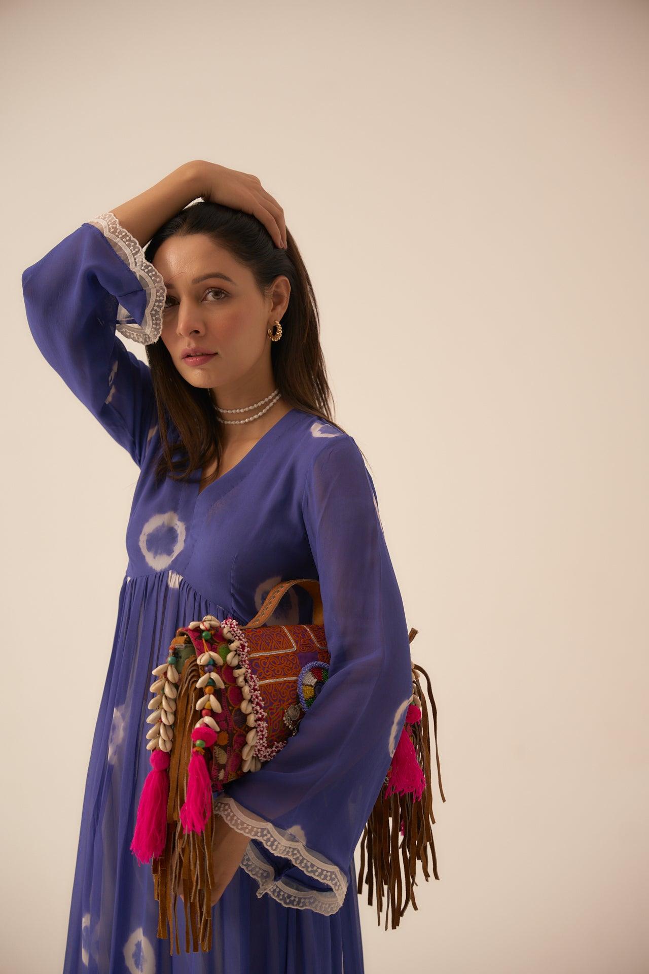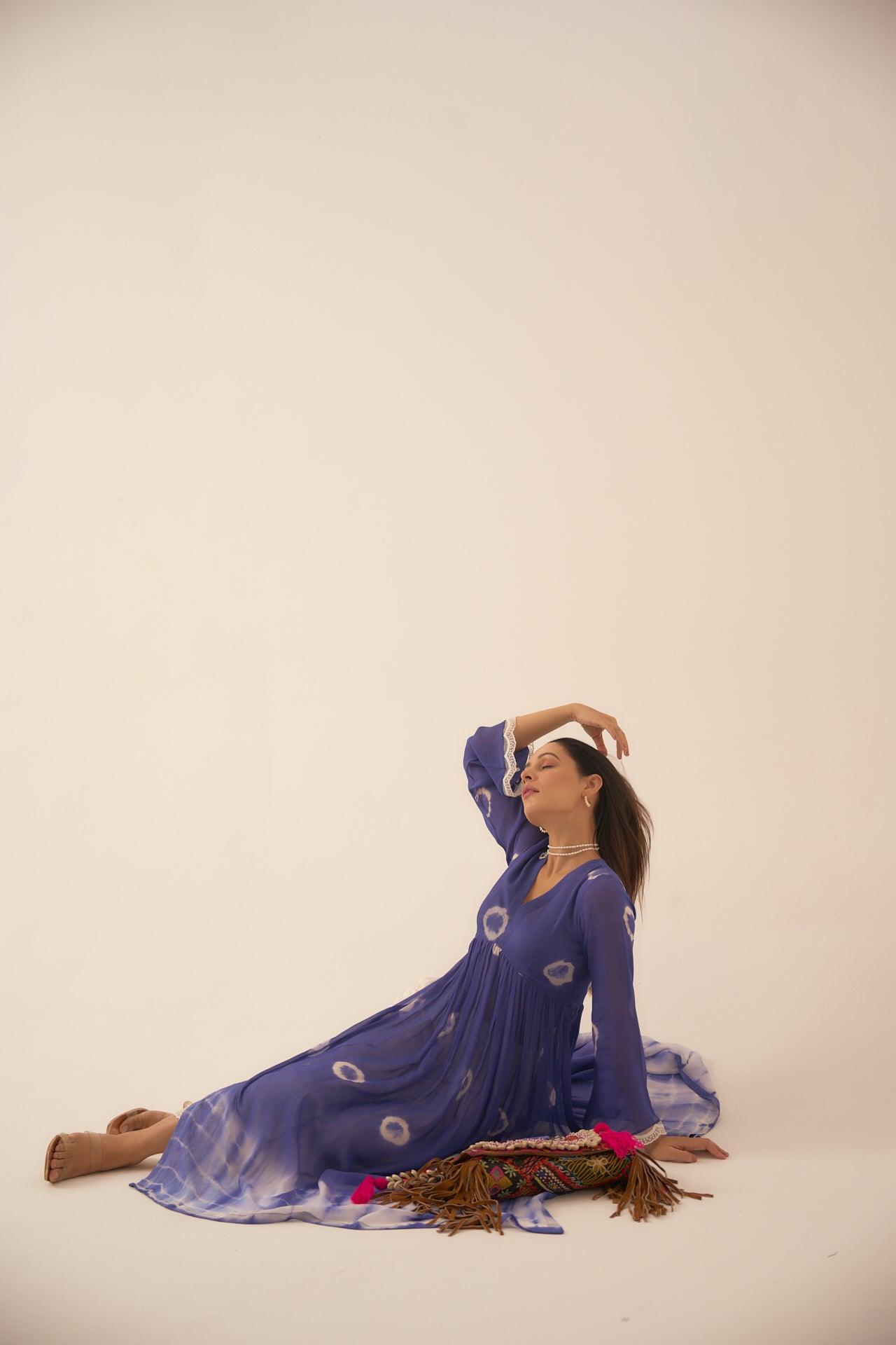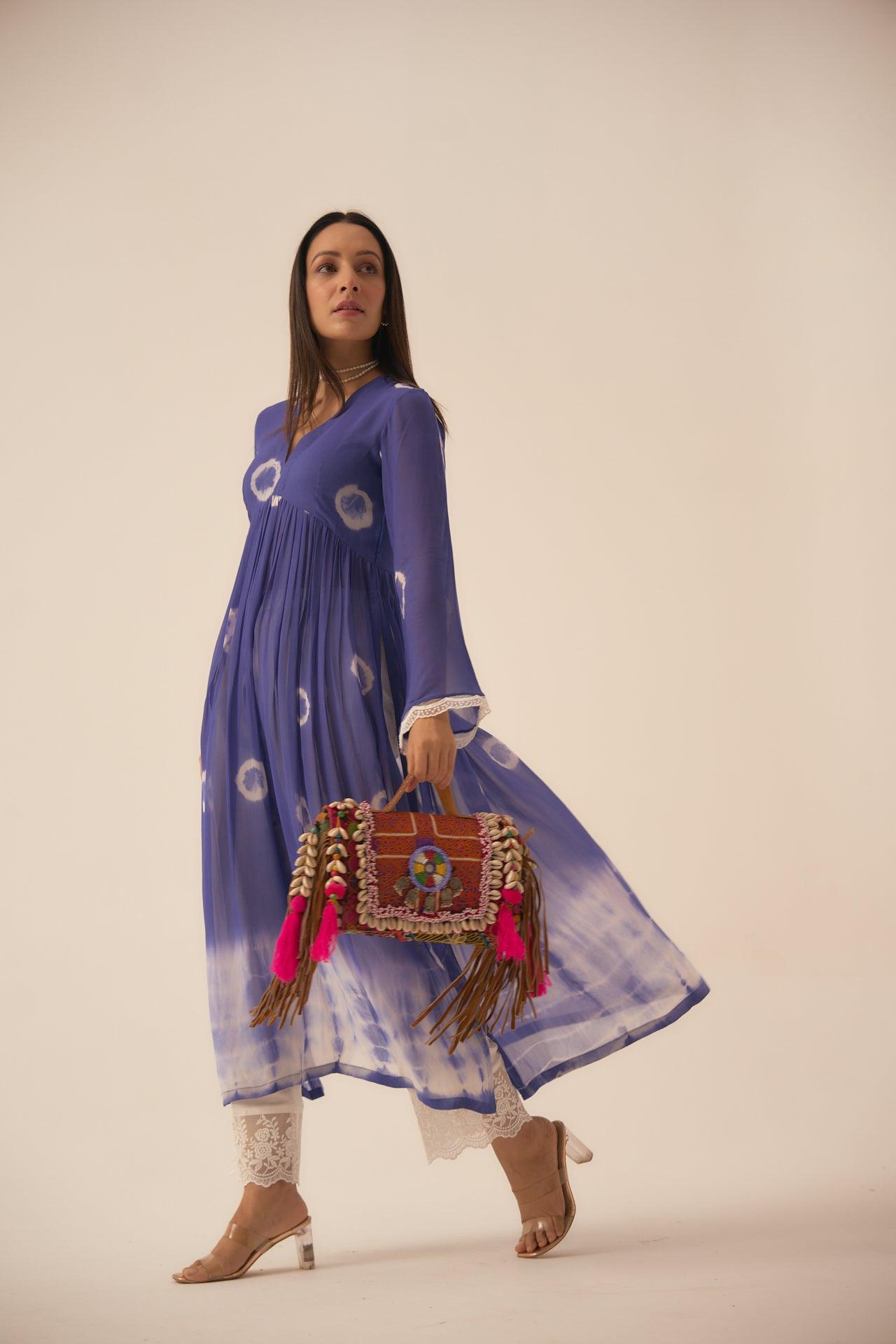 Pearl sapphire set is a two piece set, which blend of hand dying circles and a hand dying Shibhori in the ends, sleeves talk of white scalloped detailed hands and the pants with white chikan blended lace, you would absolutely fall in love with the fabric so comfortable and classic.