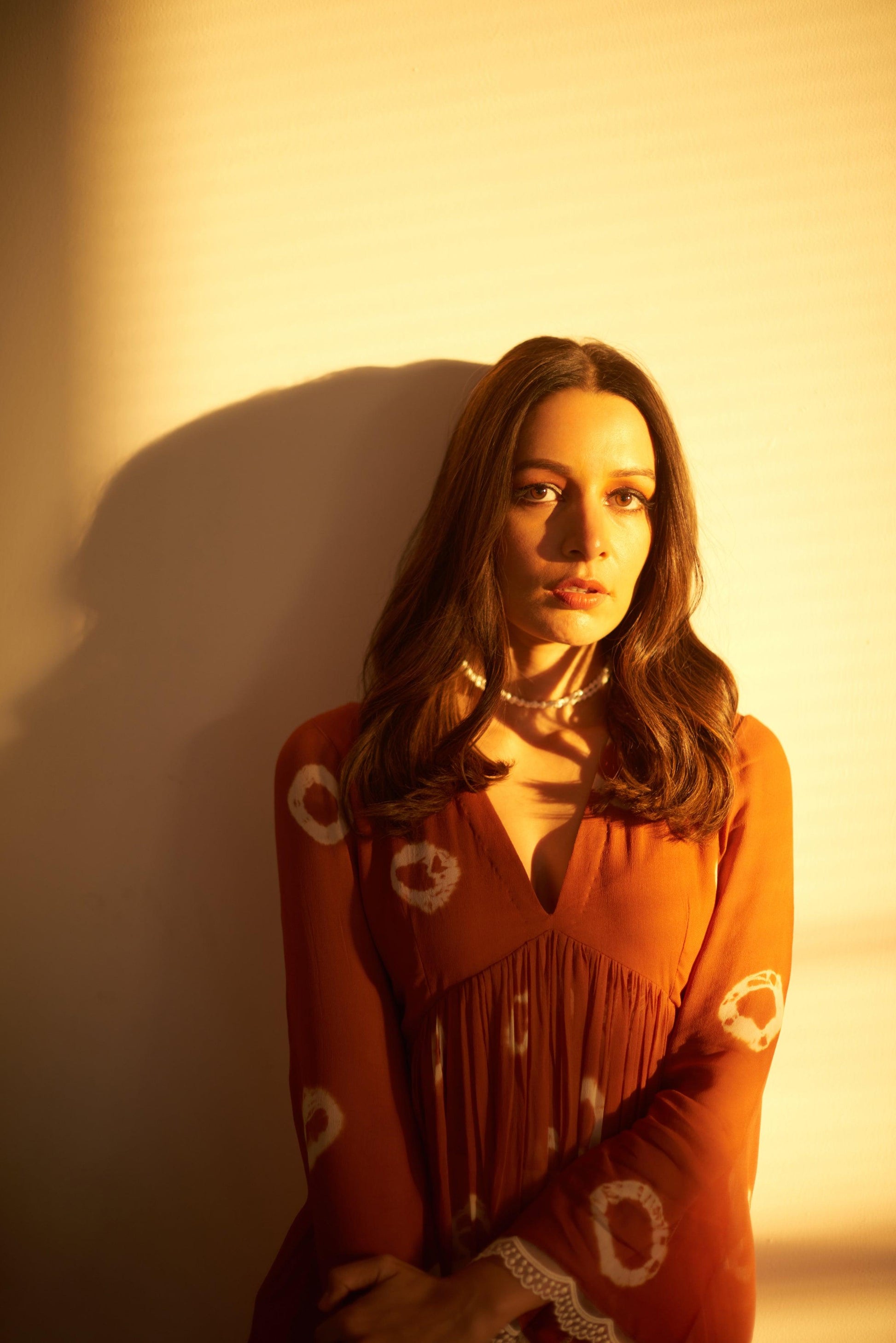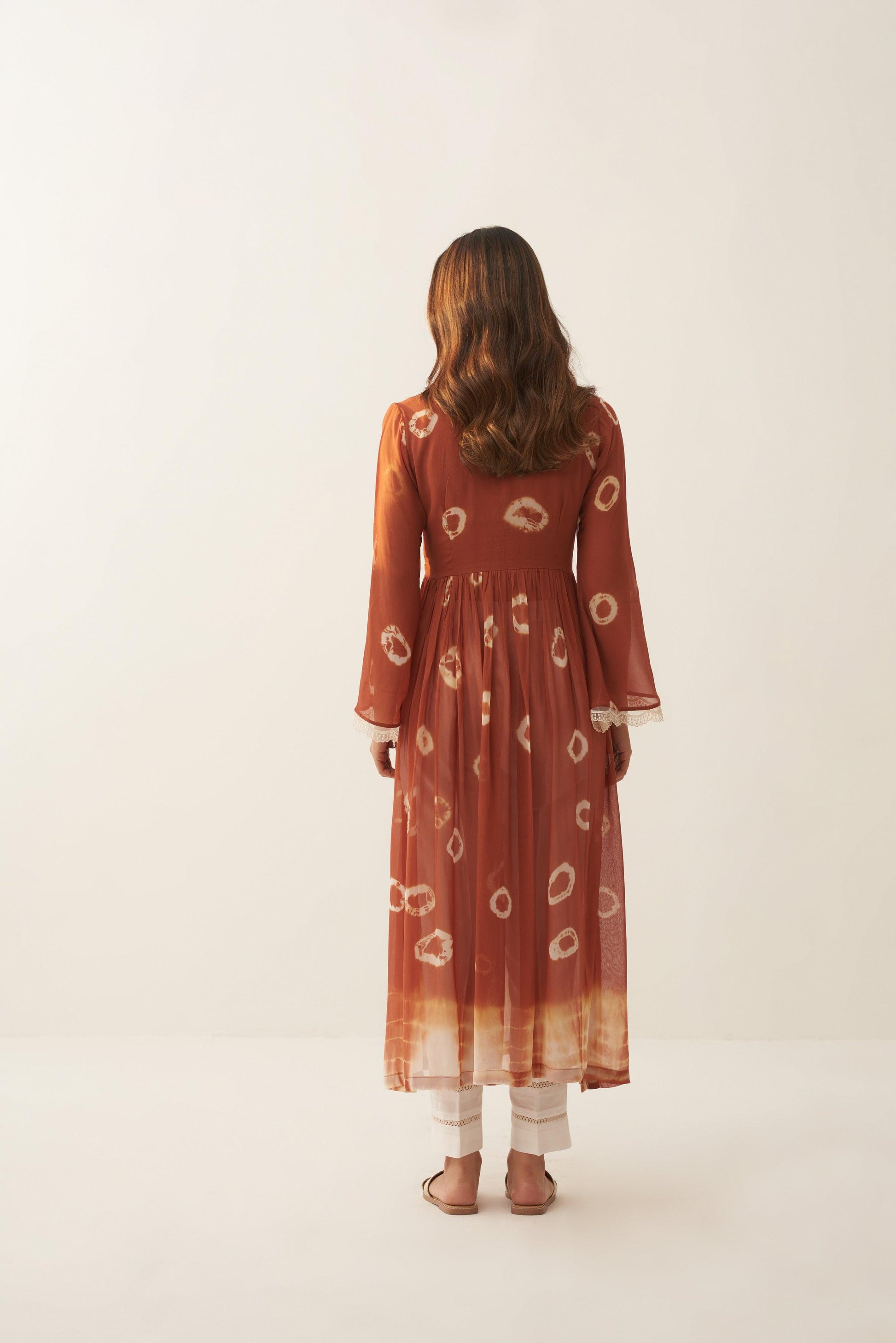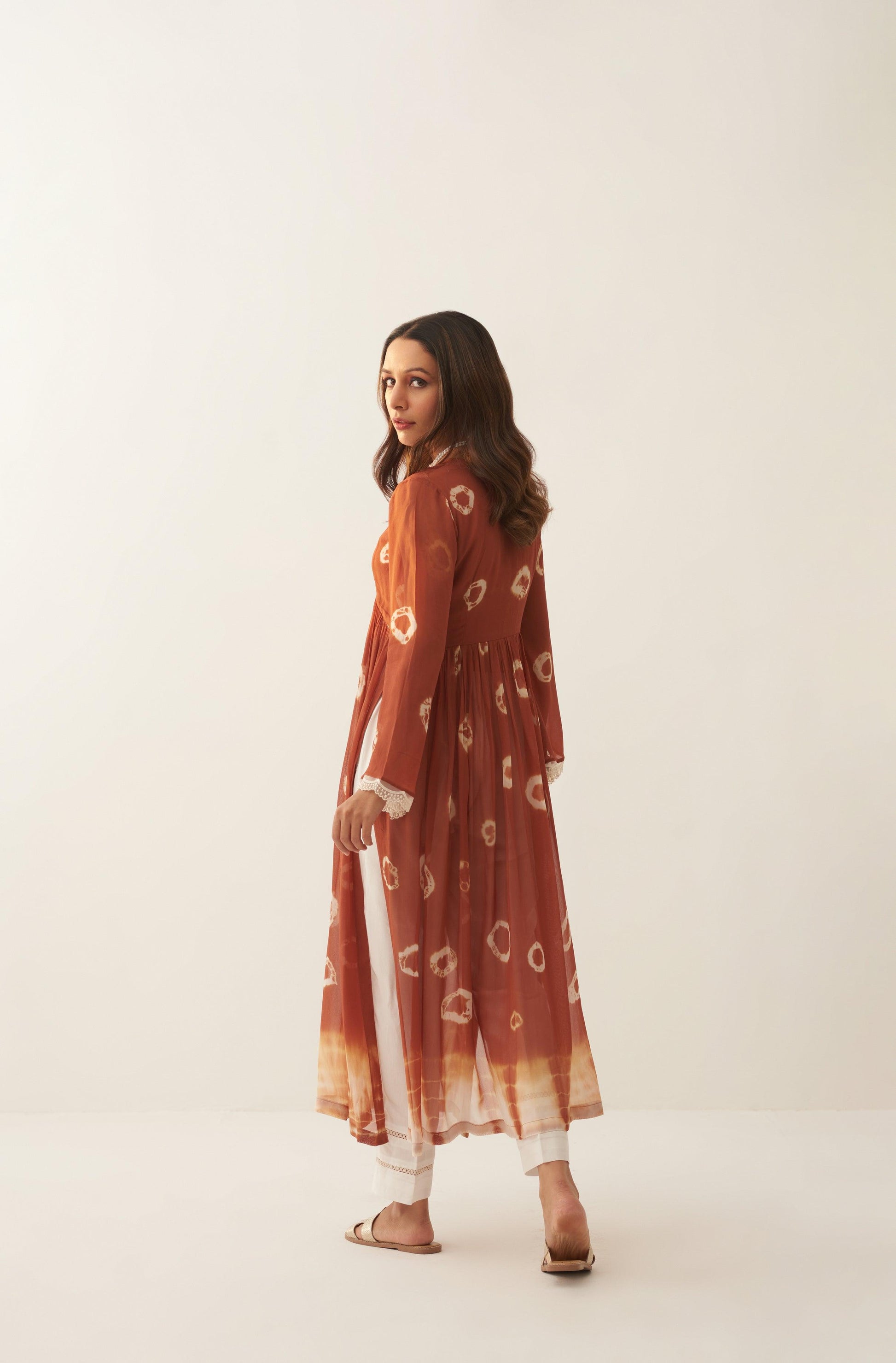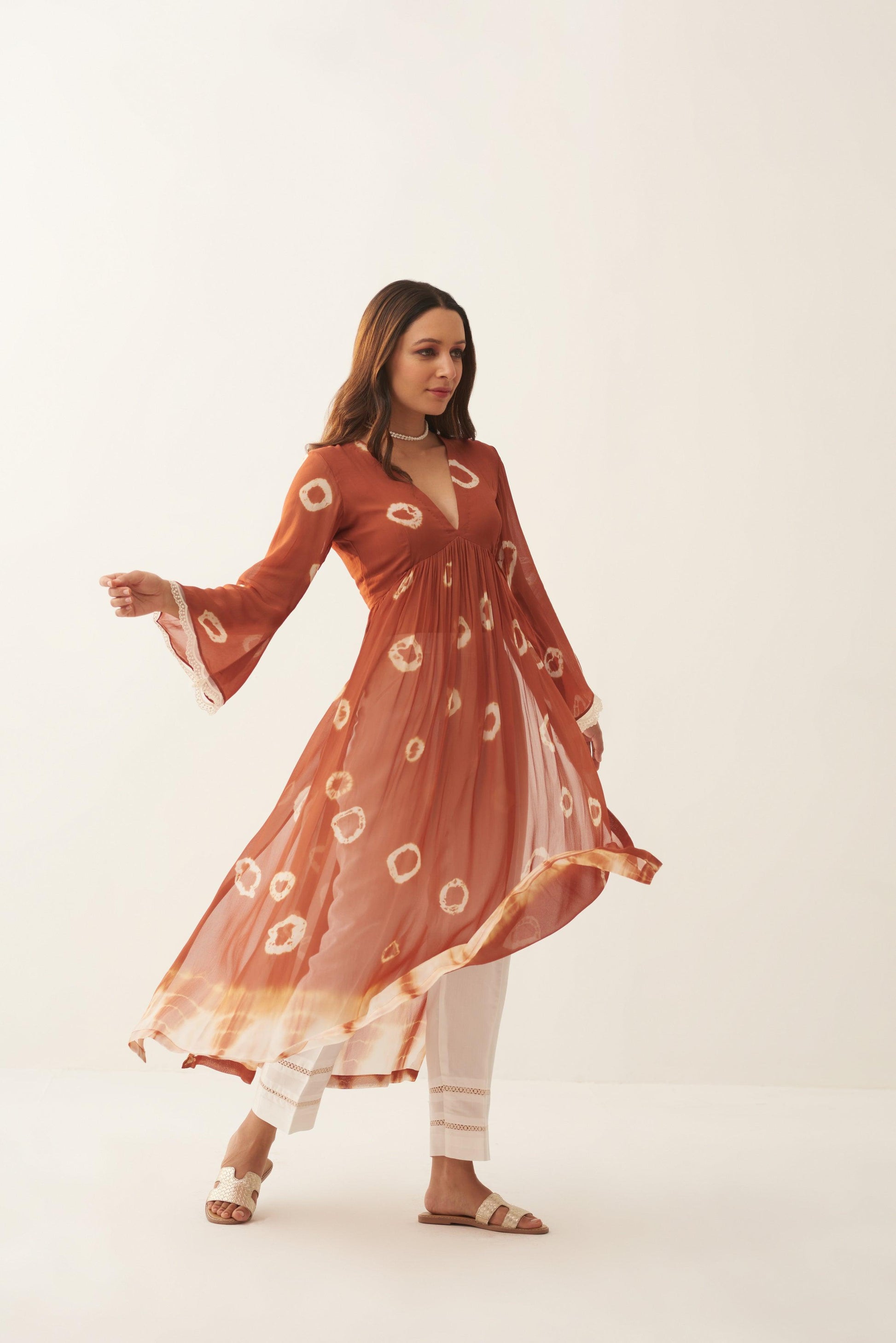 Pearl Tan set is a two piece set, which blend of hand dying circles and a hand dying Shibhori in the ends, sleeves talk of white scalloped detailed hands and the pants with white chikan blended lace, you would absolutely fall in love with the fabric so comfortable and classic.