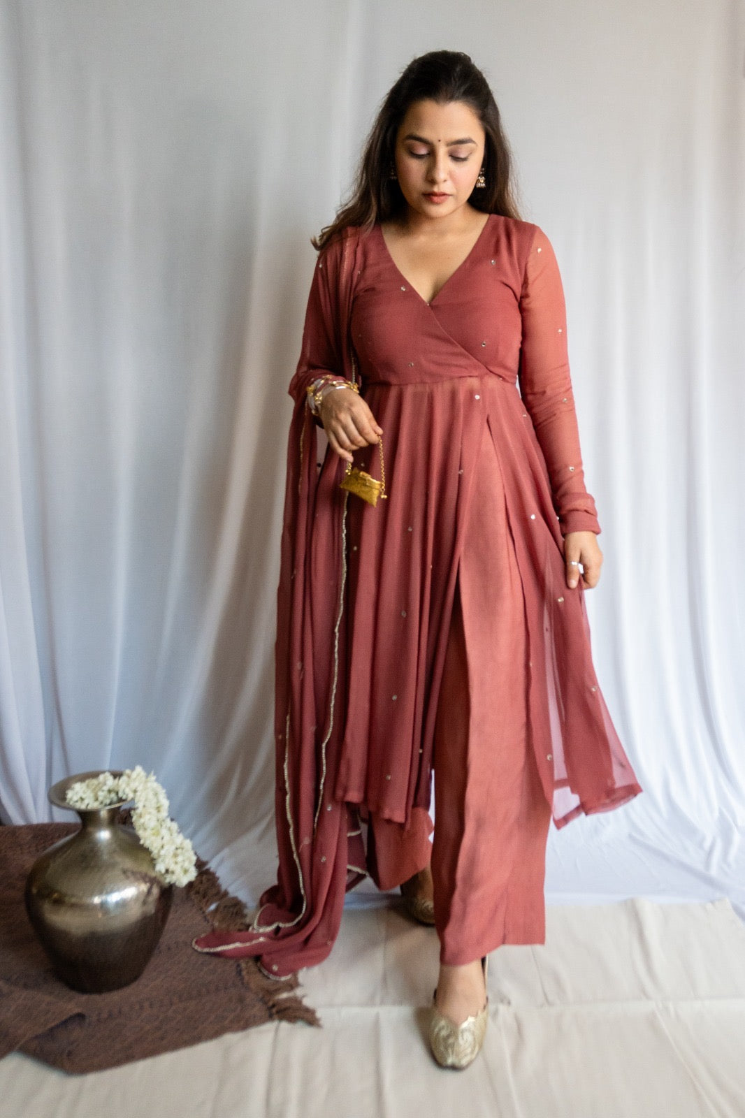STYLE: Angrakha pattern with mirror embroidery on the top and dupatta and plain pants.