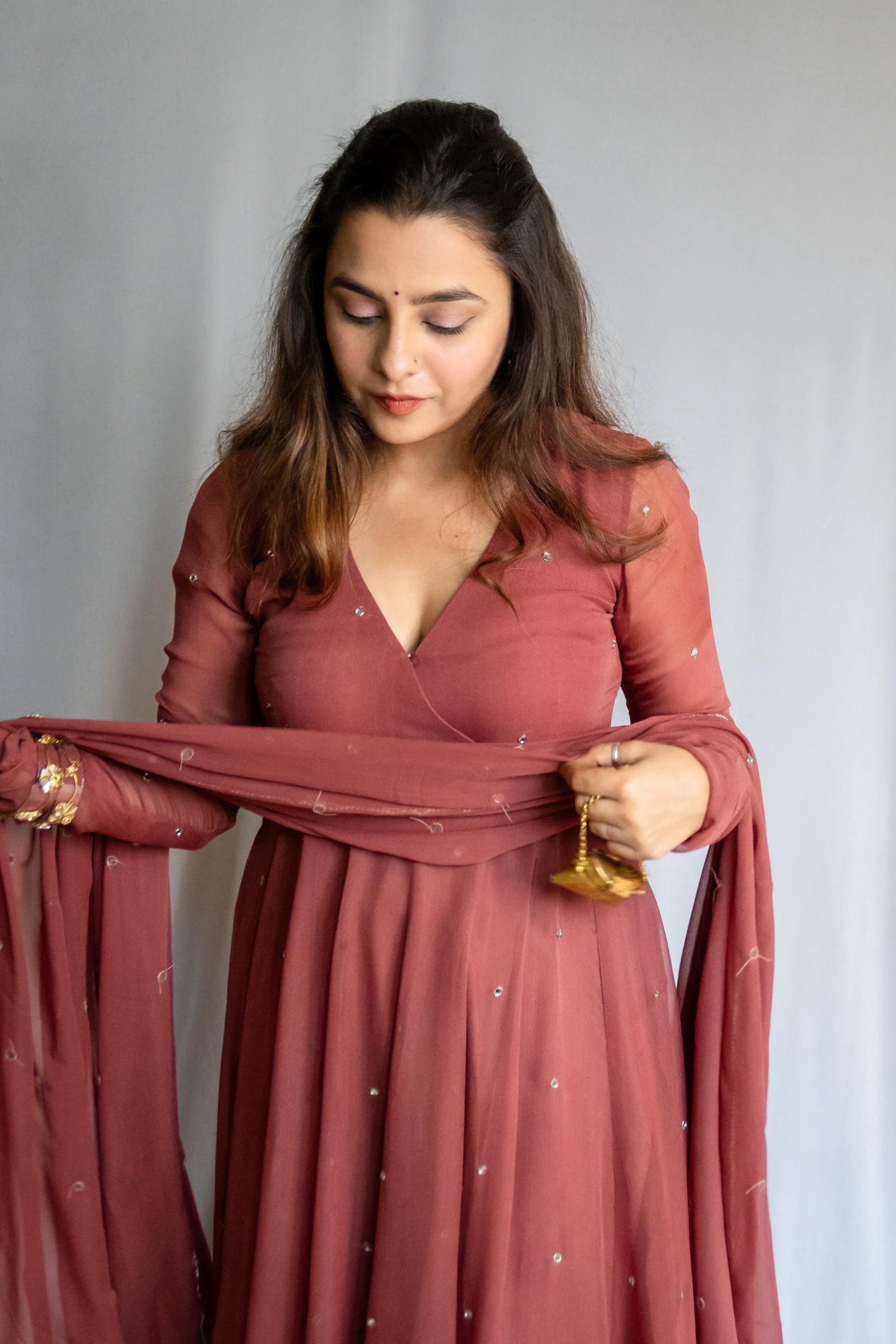 What started as a simple custom piece for Rakhi turned into something deeply personal. I chose georgette as the base — for its flow, for how it listens to movement. The neckline transformed into an angrakha-style V, unplanned but perfectly fitting.