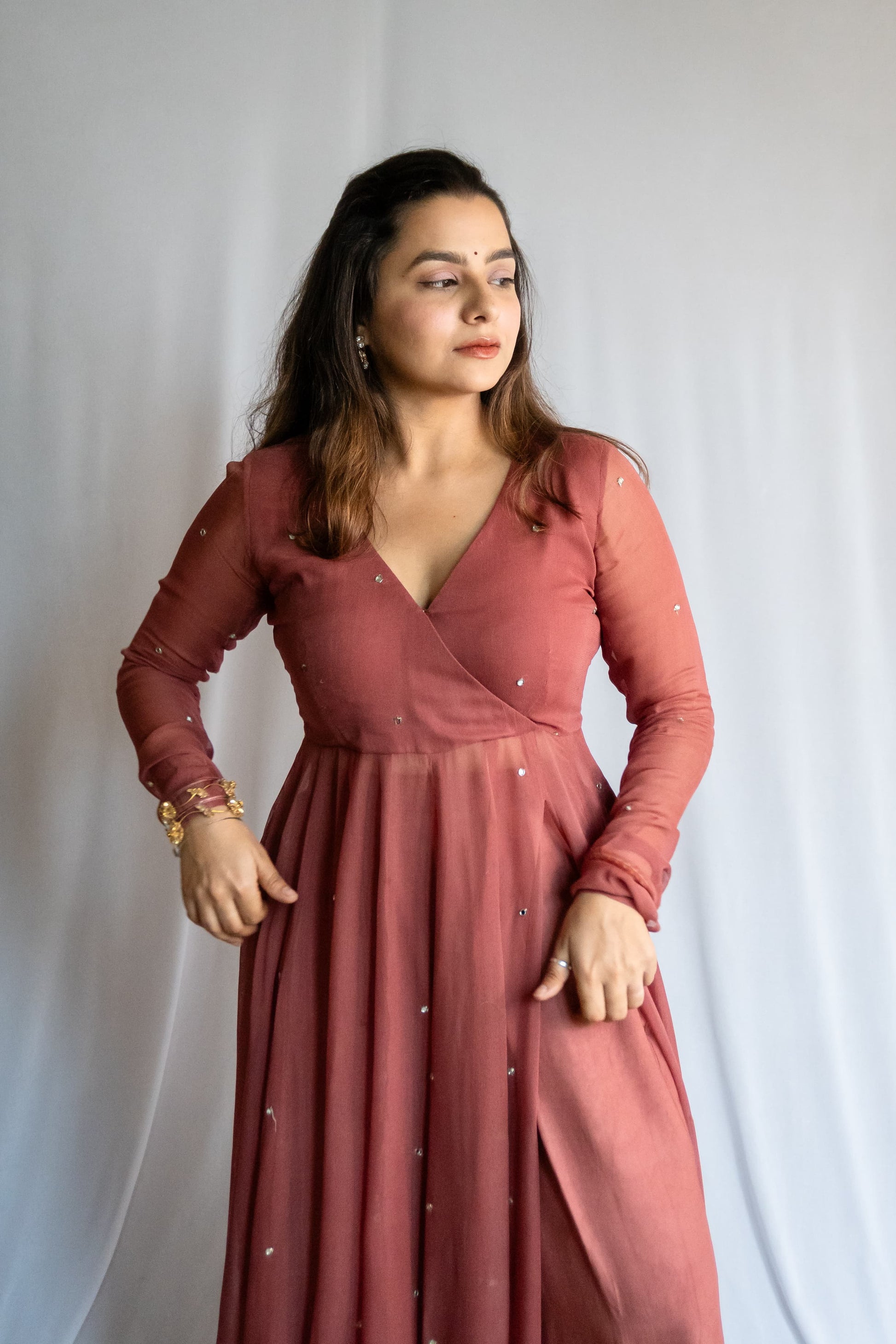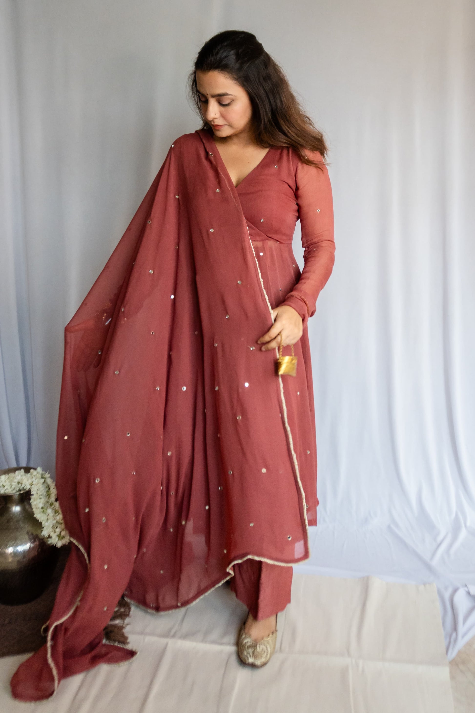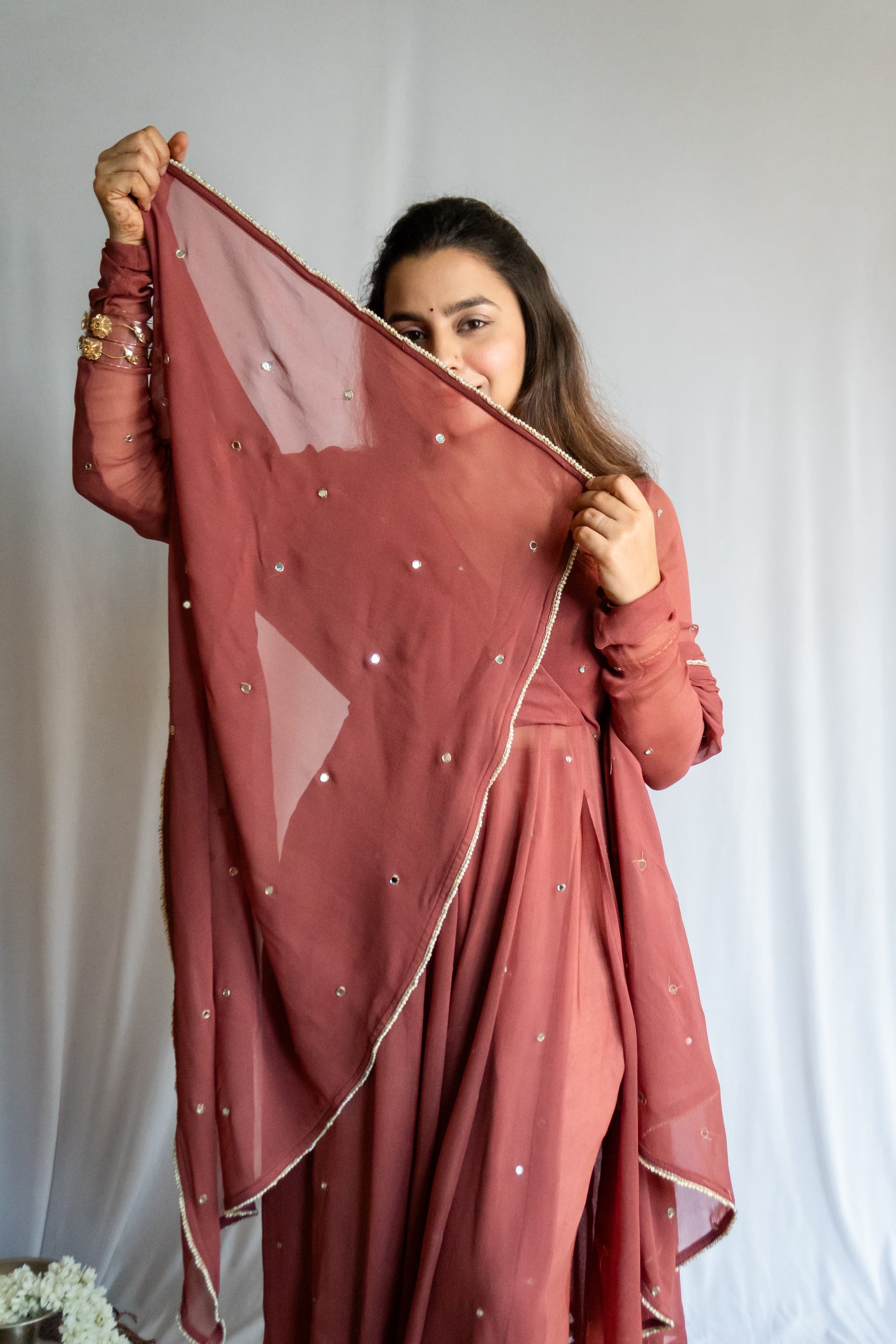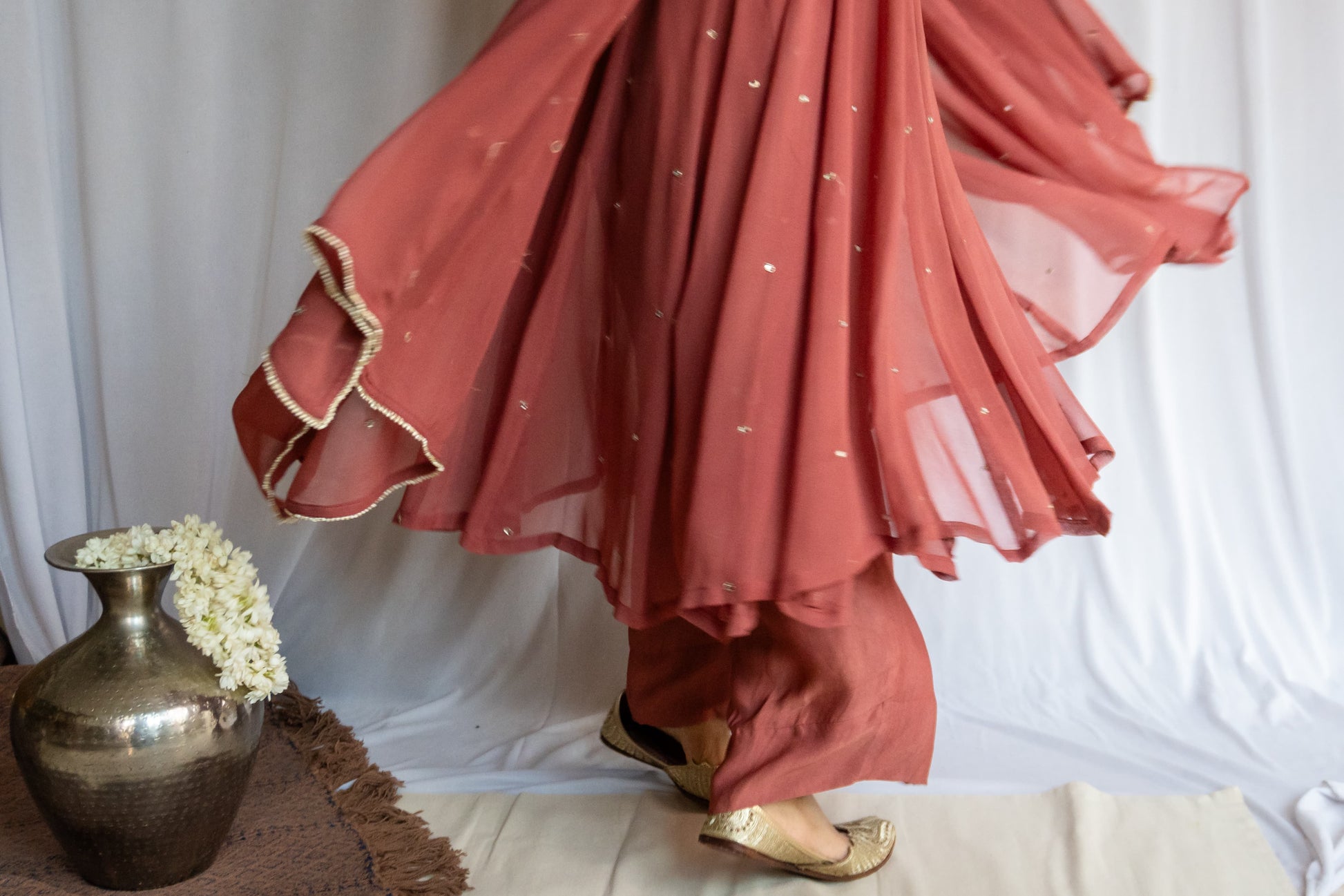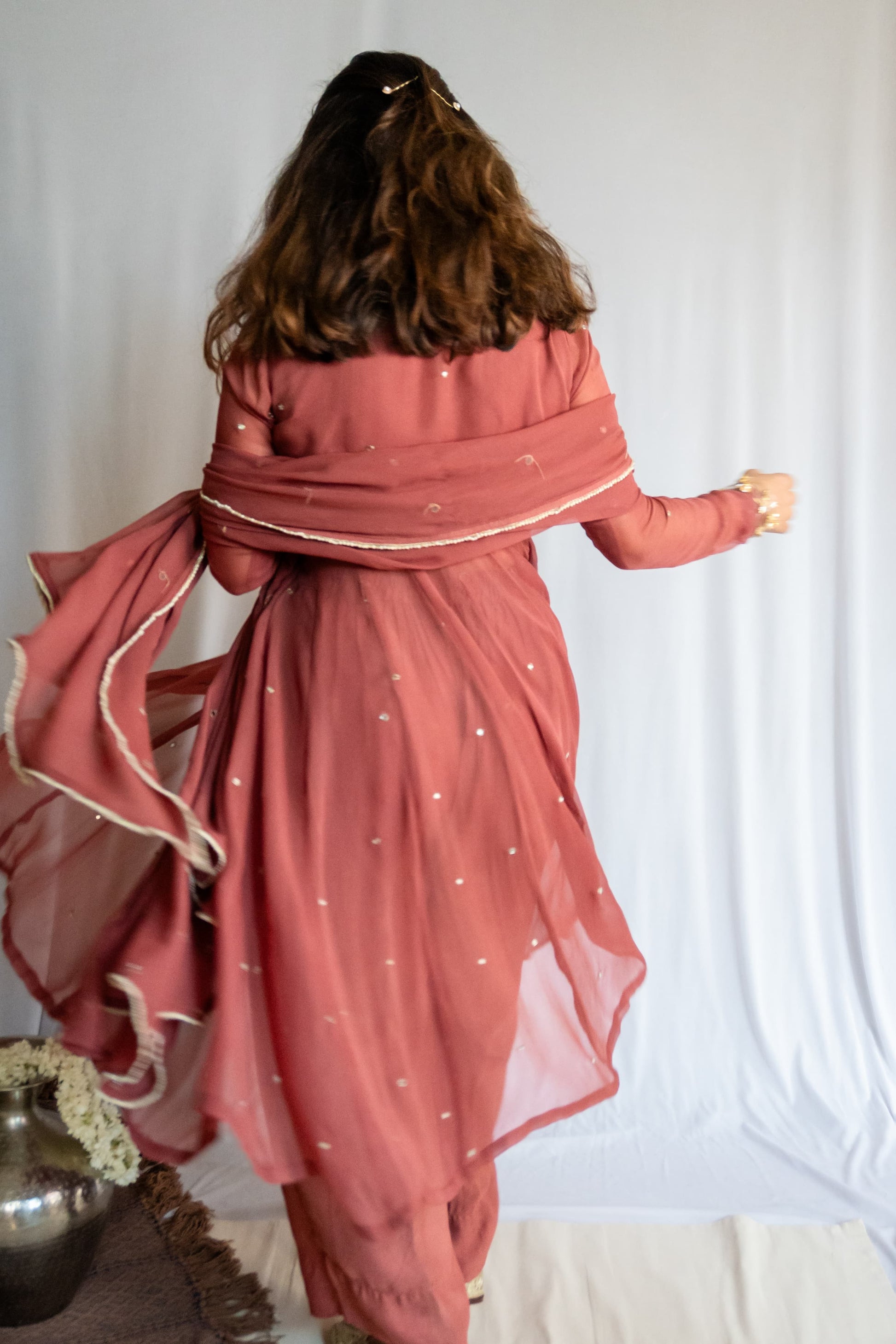 Tiny hand-embroidered mirrors began making their way across the fabric, like stars softly scattered on dusk. I added a subtle slit — not too bold, just enough. The ghera was widened, pleats made deeper — allowing the silhouette to move like poetry.