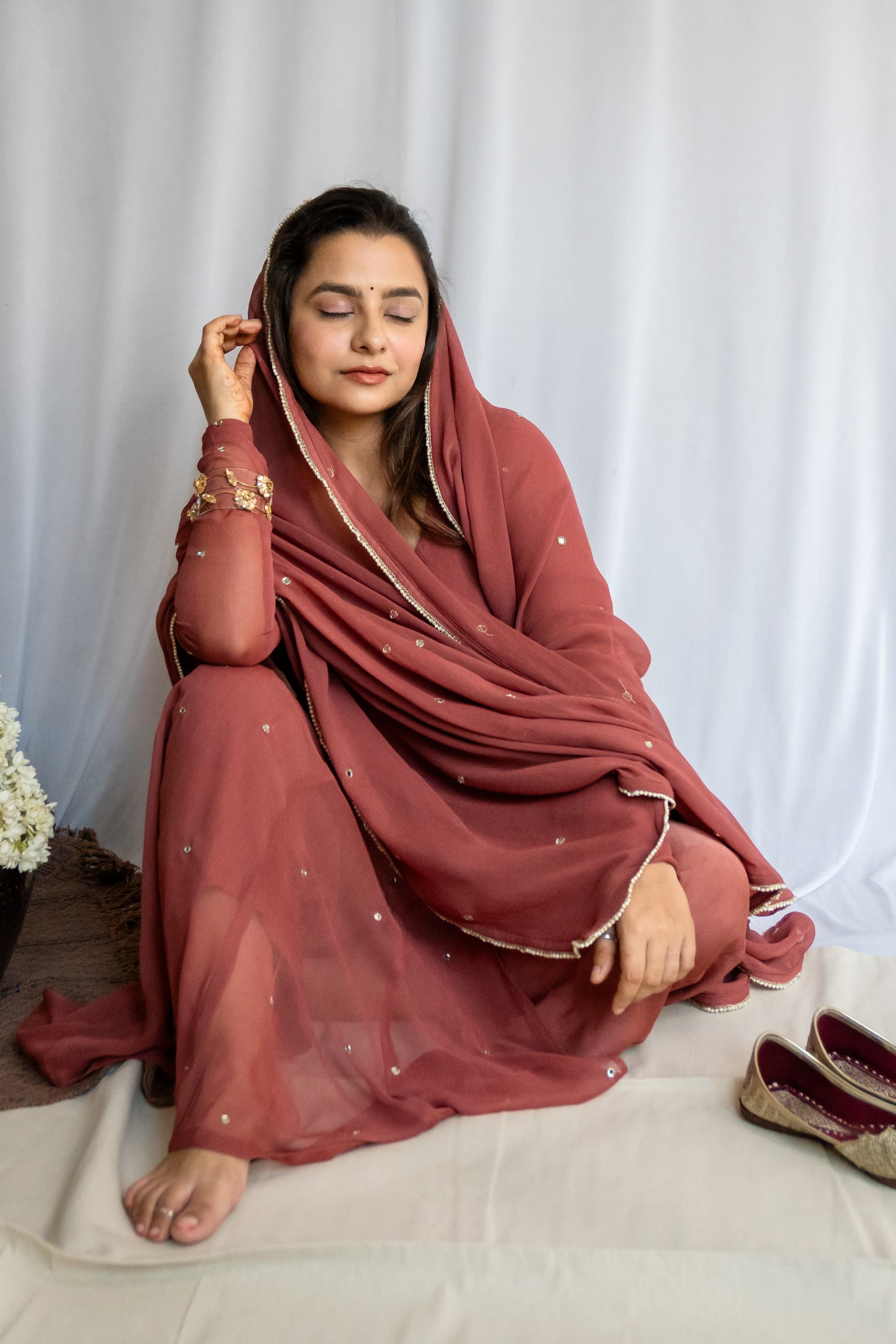 Even the dupatta wasn’t in the original plan. But how could I resist? A soft, sheer piece with a minimal lace border to complete the story — light enough to dance in, elegant enough to hold a moment still.