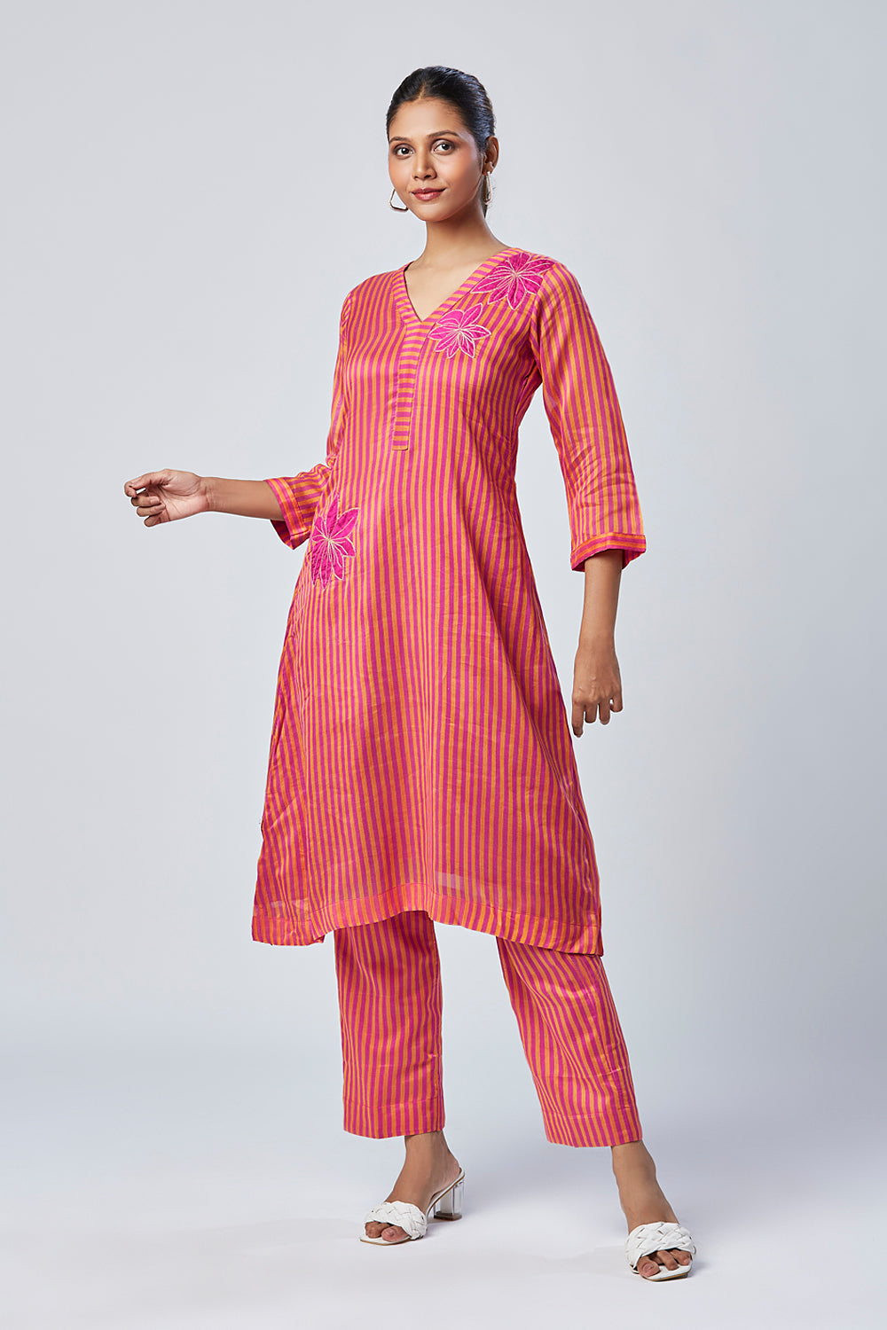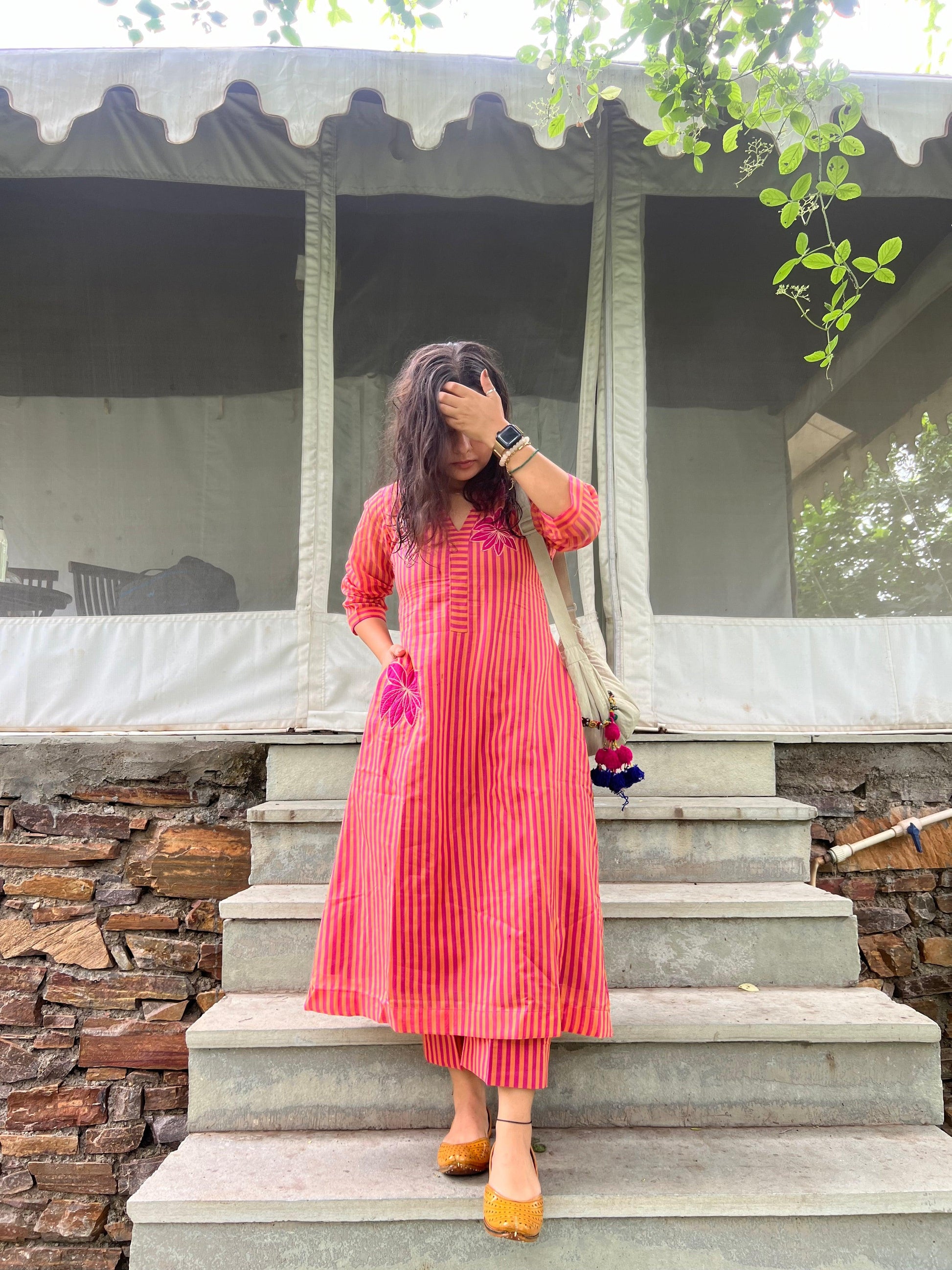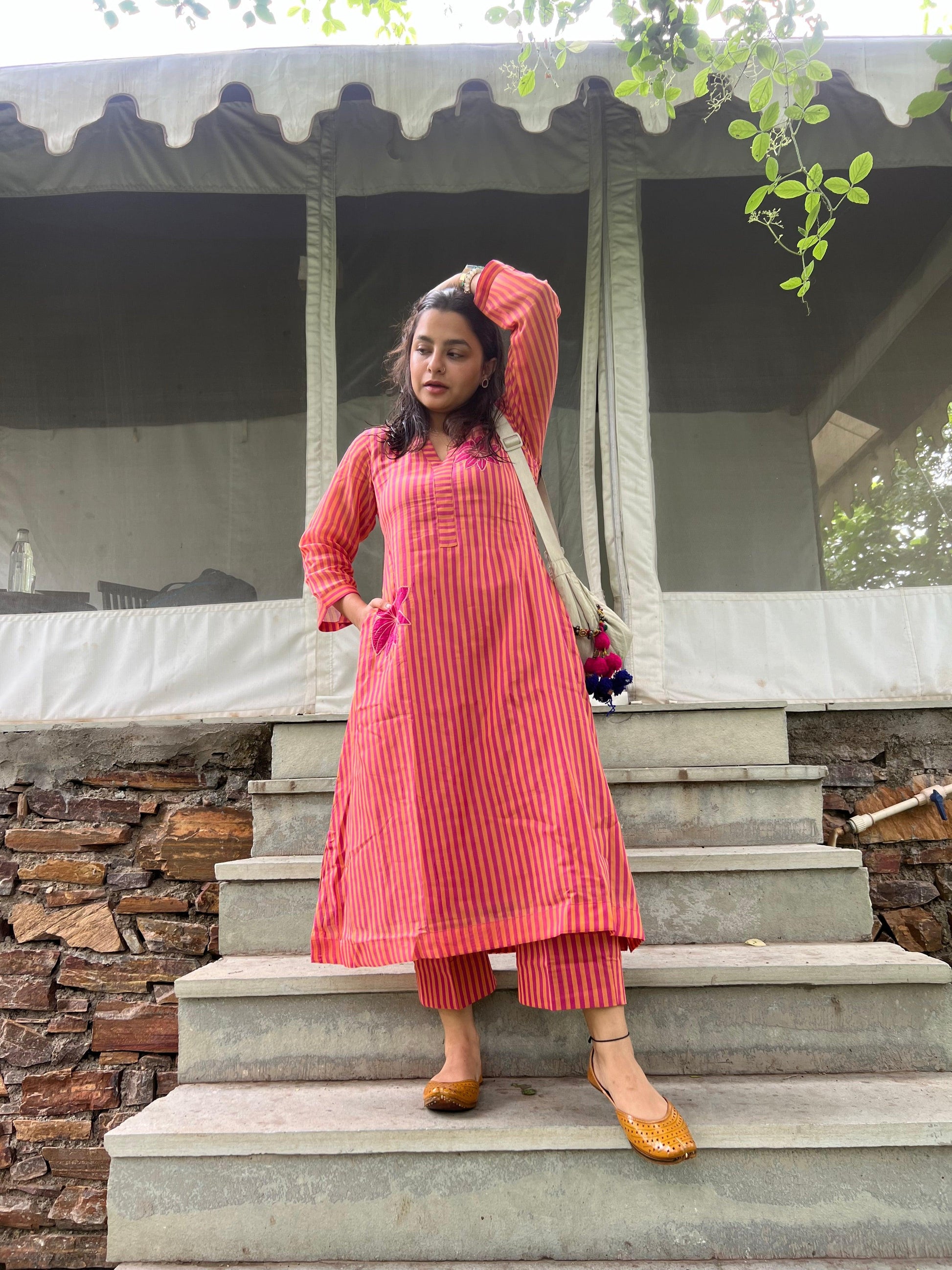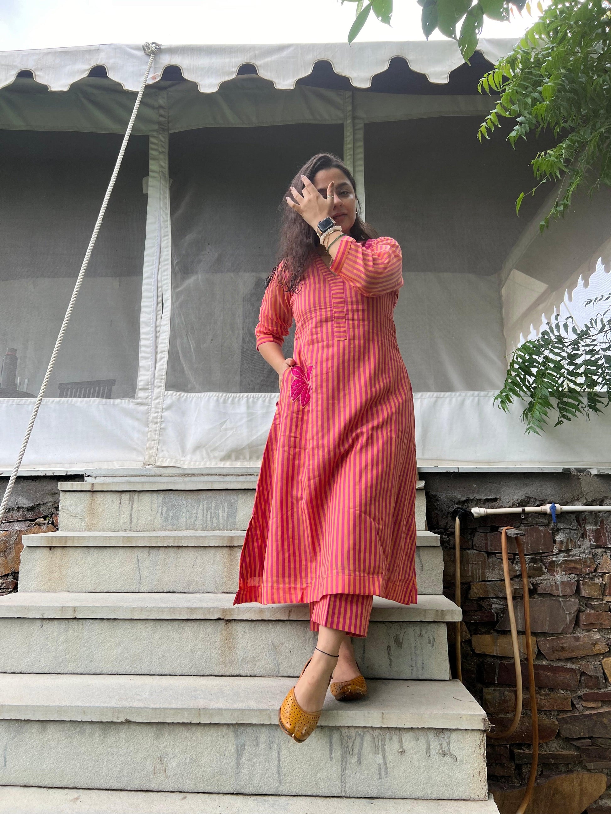 This Bengal Chanderi striped weaved, hand embossed floral set is our most favorite for the pink and yellow beauty situation and the A line kurta with straight pant fit situation. Small Slit on the sides make it easy to move and run around.