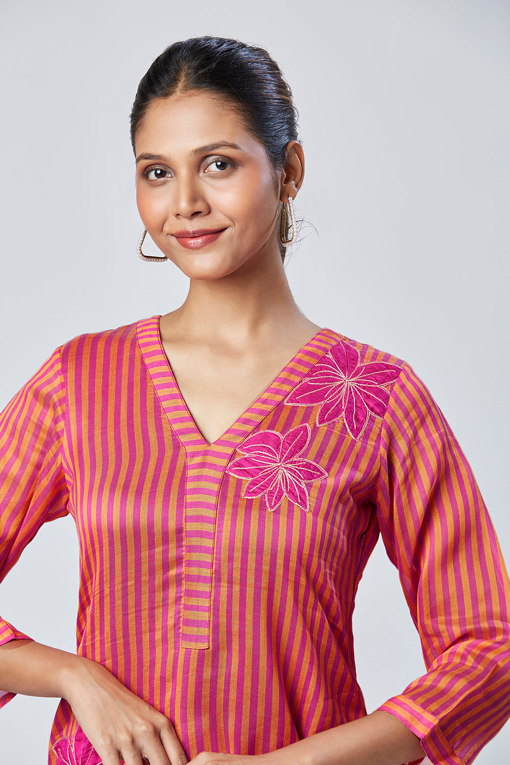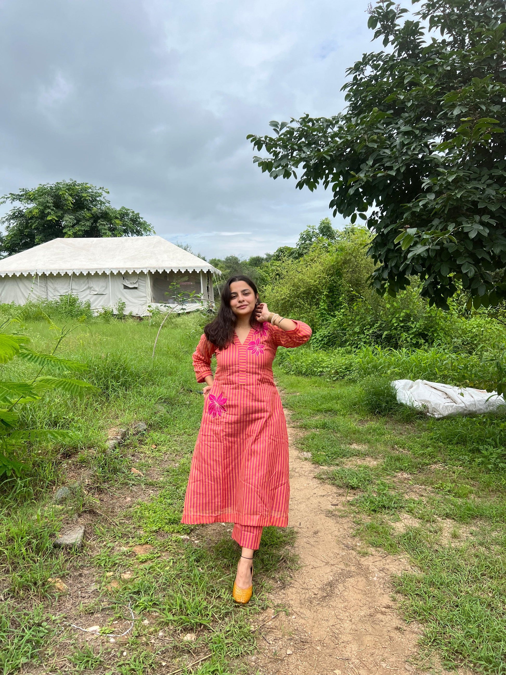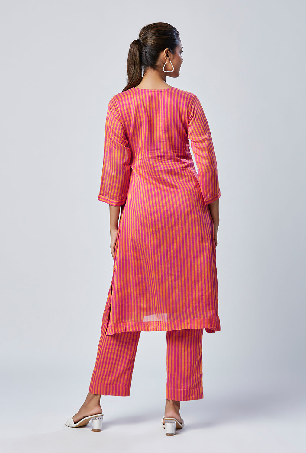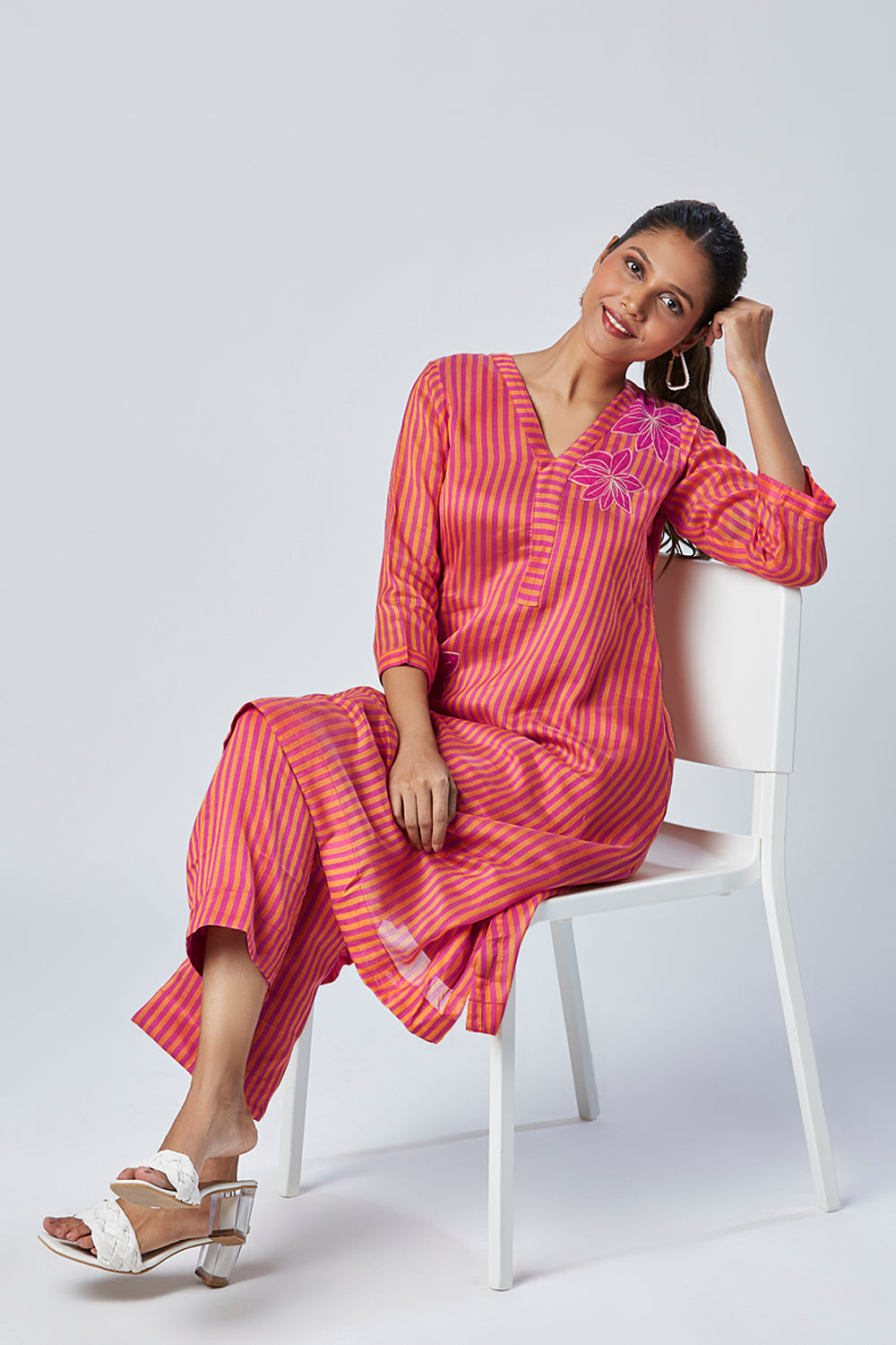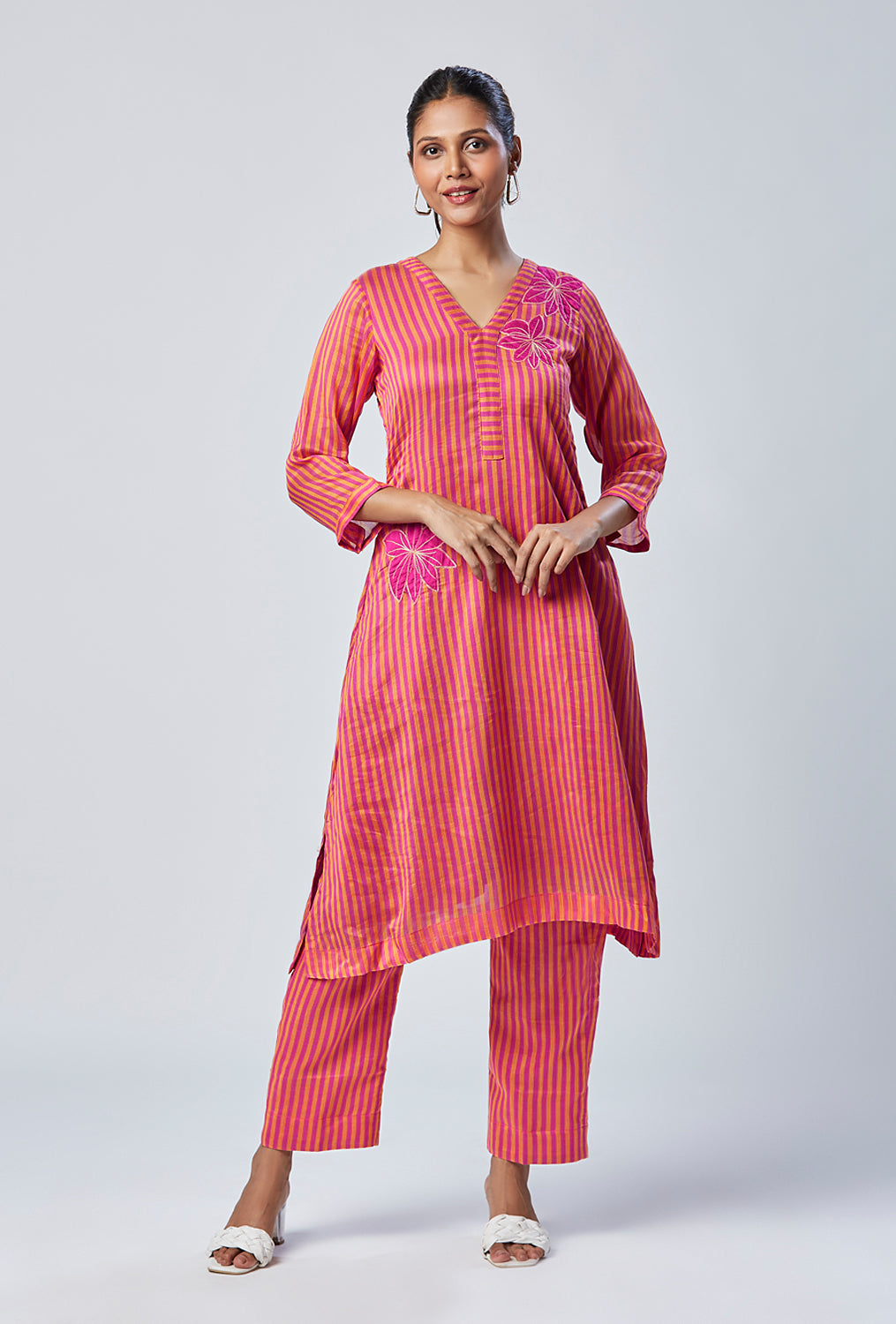 This Bengal Chanderi striped weaved, hand embossed floral set is our most favorite for the pink and yellow beauty situation and the A line kurta with straight pant fit situation. Small Slit on the sides make it easy to move and run around.